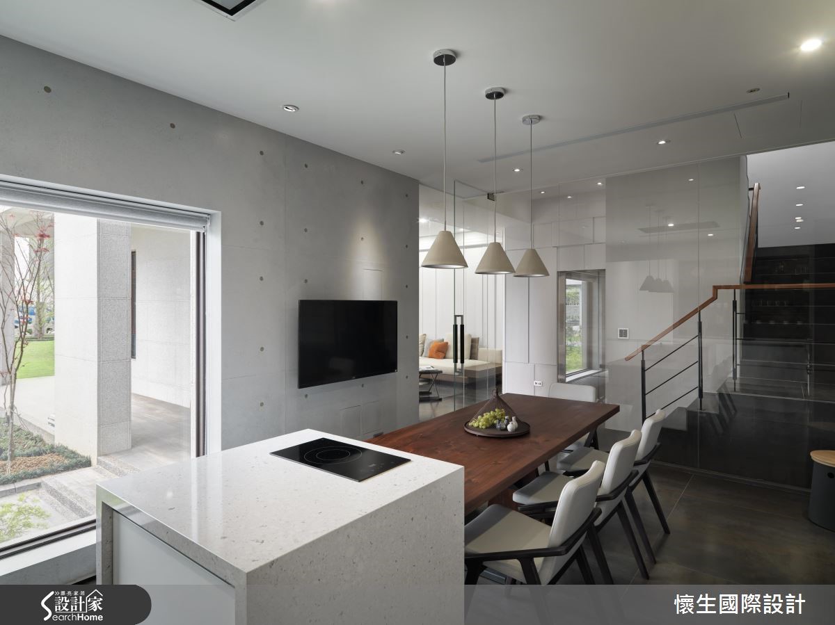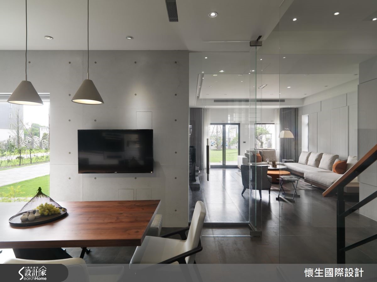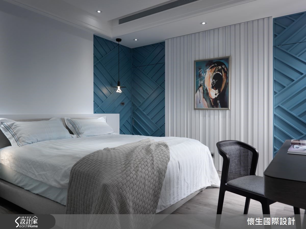 "设计酒店(Design Hotel)"的风潮源于80年代,融合崭新的设计理念与艺术文化,为酒店打造前卫独特的主题风格,成为优质住宿的代名词。设计师为430平方米别墅注入设计酒店的灵魂,特别是在每个独立房间内创造高度艺术性。【采用鲜明跳色,营造趣味性】公共空间为以多元丰富的材质与色调创造冲突间相互平衡的美感,以纯色利落线条为基底,纳进色调鲜艳、花色大胆的软件布置,并巧妙以金属材质点缀于家具之间,与清水模质感的主墙相互辉映。【清玻璃围塑,引植户外亮度】以清玻璃作为隔断,创造隐私与通透兼具的独立餐厨空间,大型收纳柜结合L型厨房,框设T型用餐区域,搭配大面积窗户的充沛光感,宛如身处欧美旅店。【沉稳与轻柔,定制卧室个性】私领域为家族成员设计各自的休憩空间,主卧以石材般天然纹理搭配木元素,让大地色系创造沉稳的绝代风华;次卧将欧式浮雕展现于背墙,利用蓝白跳色营造欧式风格;另间次卧则以沉静温柔的墙纸,给予宛如身处童话森林的梦幻感受。