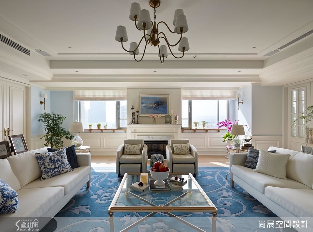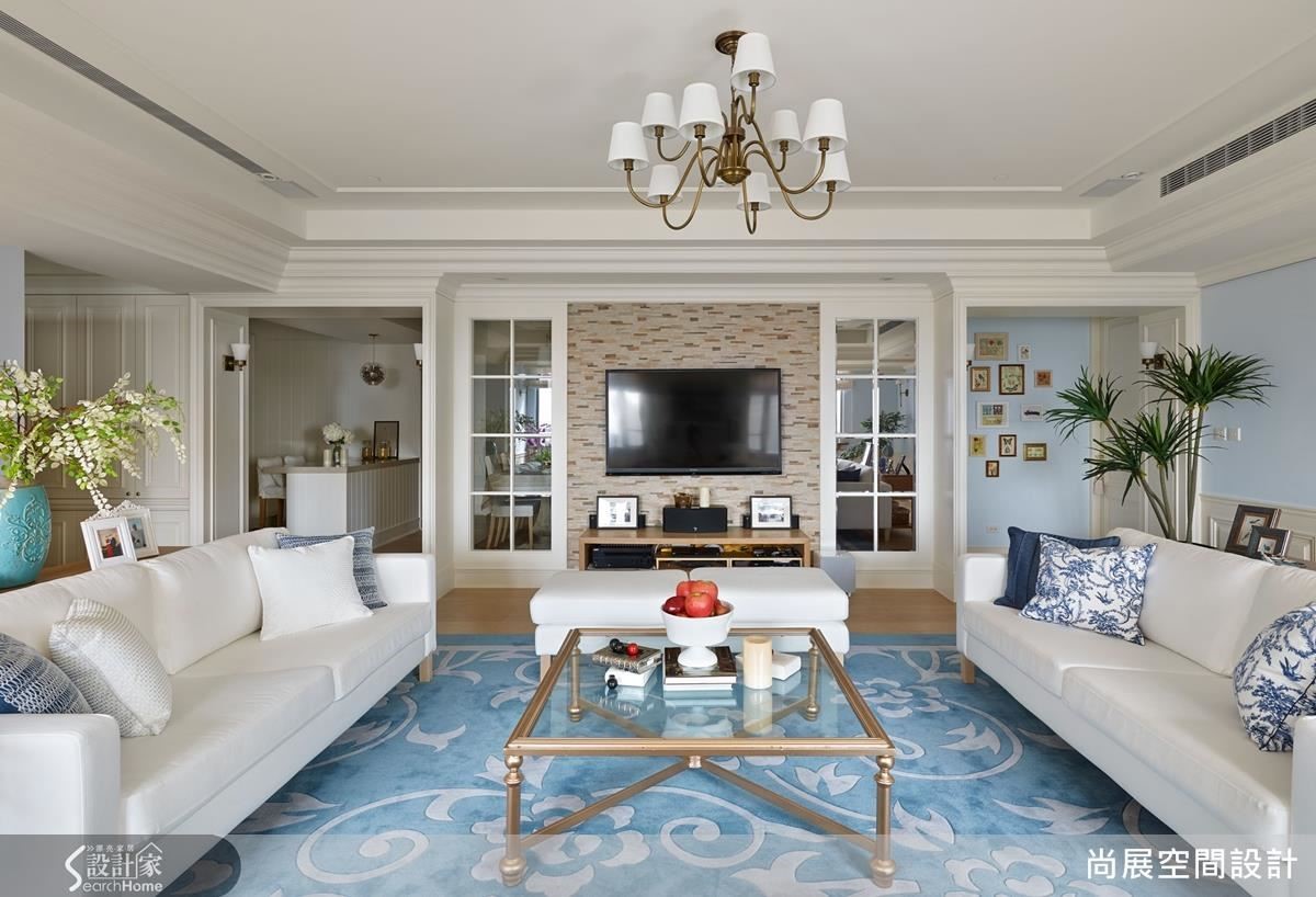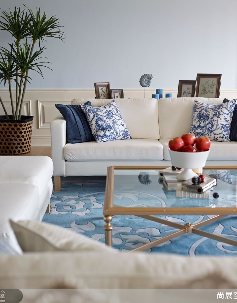 在全室净白的空间中大面积铺陈浅蓝,粉嫩清爽的色系与白色线板相互衬托,辅以蓝白花纹抱枕,冷色调的使用有效使视觉降温,植入有如海滨的悠闲感受,在家中也能坐享户外度假氛围。