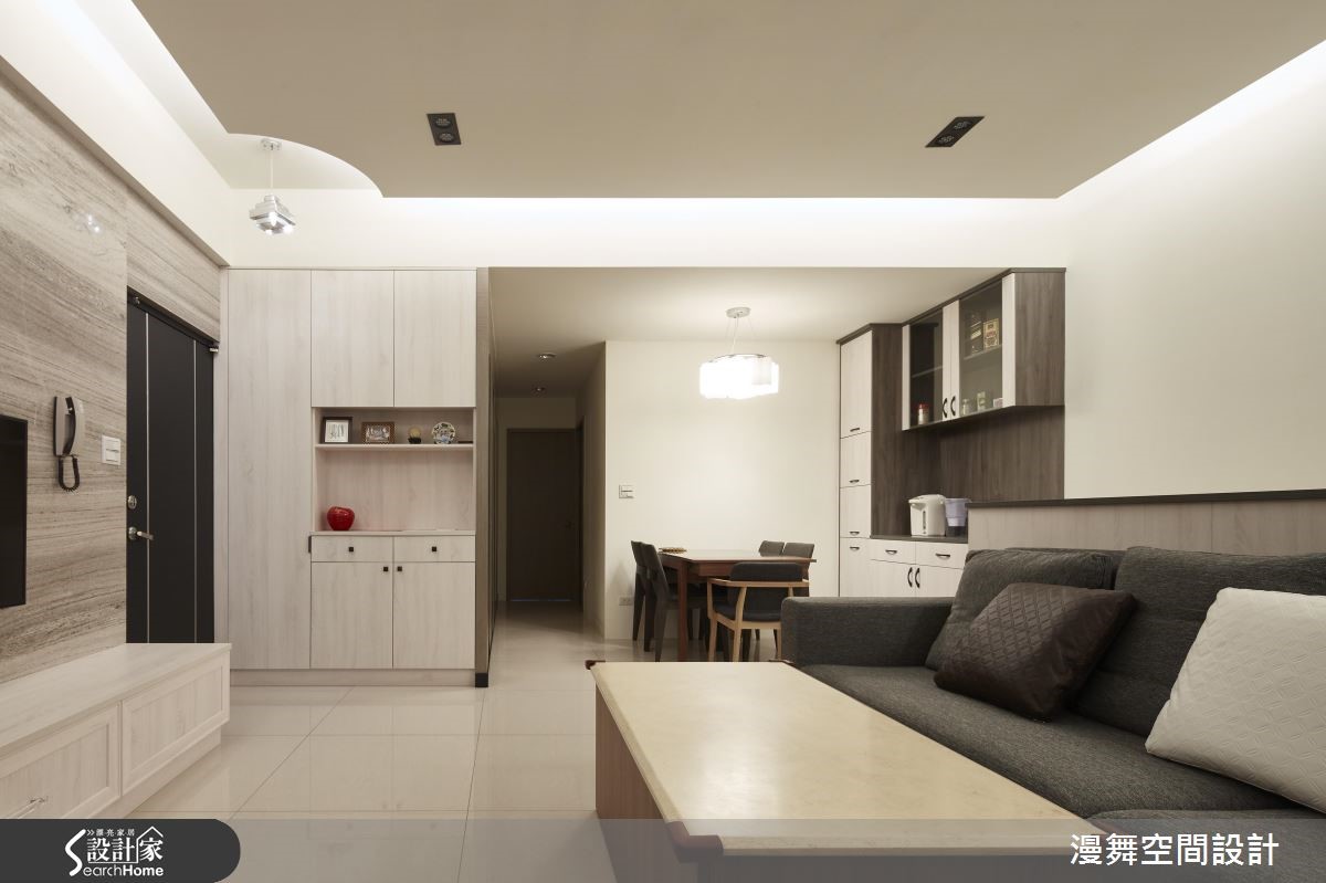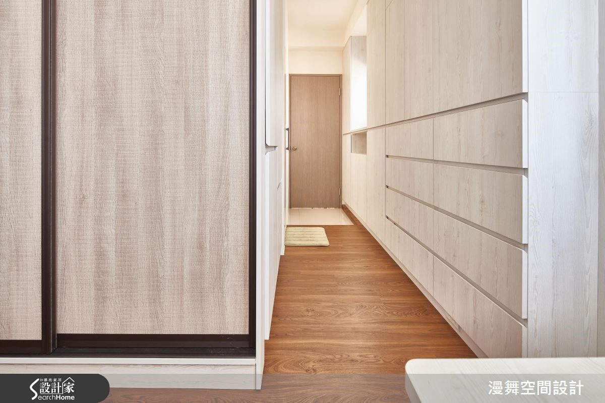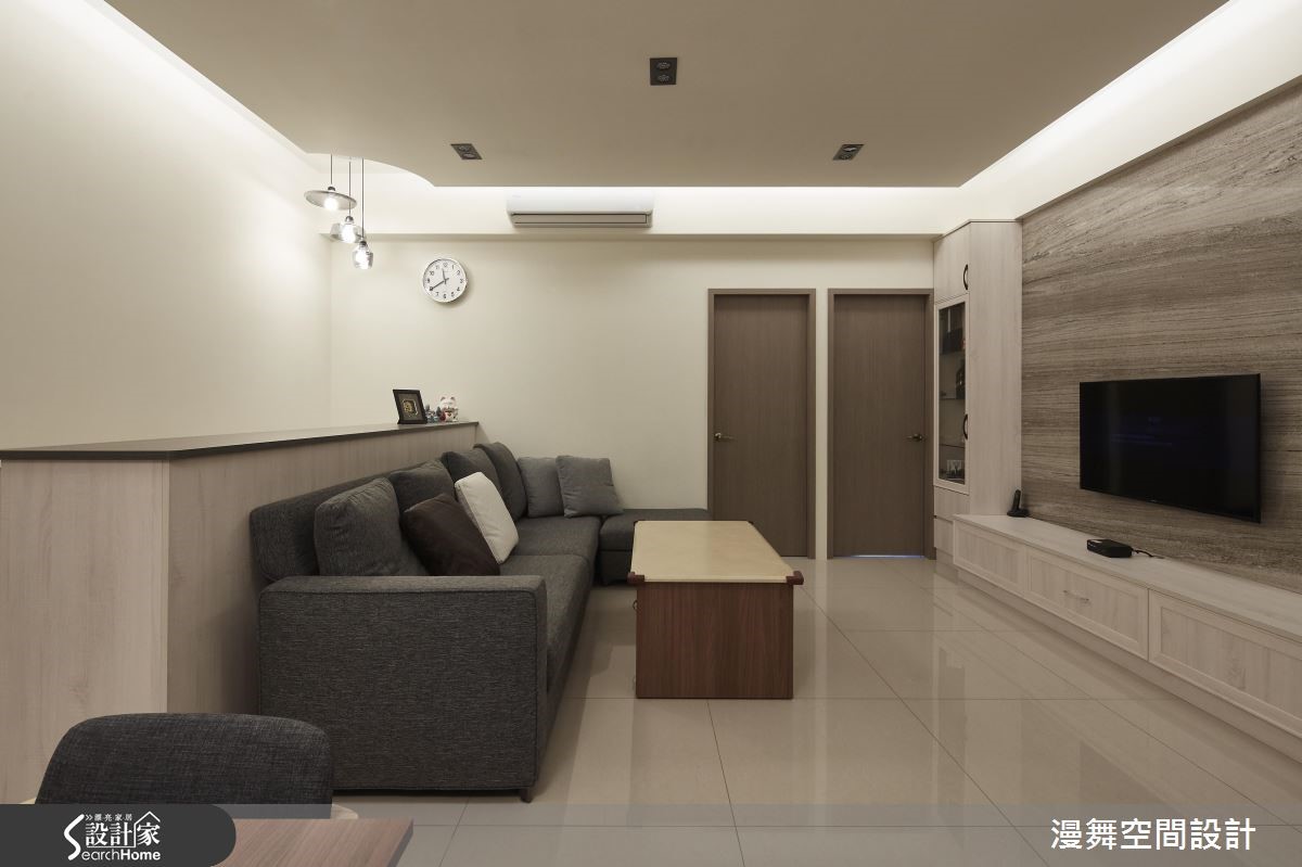 屋龄30余年的老屋,设计师彻底改善壁癌、格局动线、采光不良等问题,将厨房与卫浴挪移,彻底翻转格局,并让客、餐厅采开放式规划,使廊道缩短,有效放大空间,提升生活品质,让三代同堂可共享美好新生活。【微调隔断,公私领域比例均衡】客厅透过大理石电视墙展示天然纹理,辅以整体空间的素净表情,表现简约气质。为了避免电视墙、沙发距离过远,在沙发背后规划开放书房,以收纳柜做出界定,双重满足收纳与区隔需求。内缩既有房间范围,拓大餐厅领域,一旁柜体则扮演了展示及收纳机能,并让卫浴门片隐藏于墙,透过镜面、木纹的穿插拼接,展现具设计感的立面风貌。原先位于房屋底部的厨房,则经过拆解,成为主卧空间。主卧藉着各式收纳与展示柜活化空间,并善用走道两侧规划大容量衣柜,采用浅色木皮的大面积铺叙,让量体轻盈不显压迫;长亲房则将床头延伸拉大,方便长辈收取物品,并导引丰沛采光。