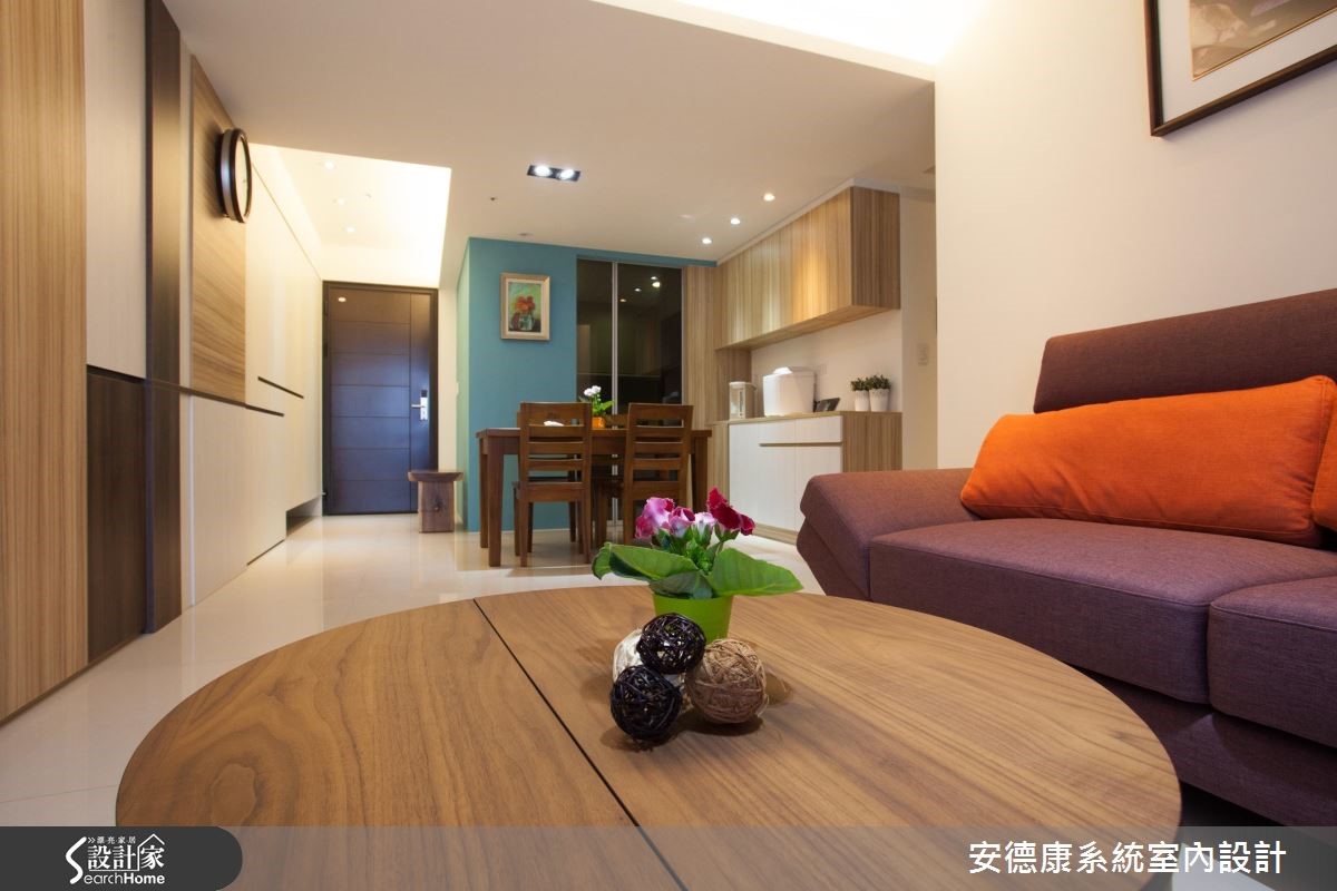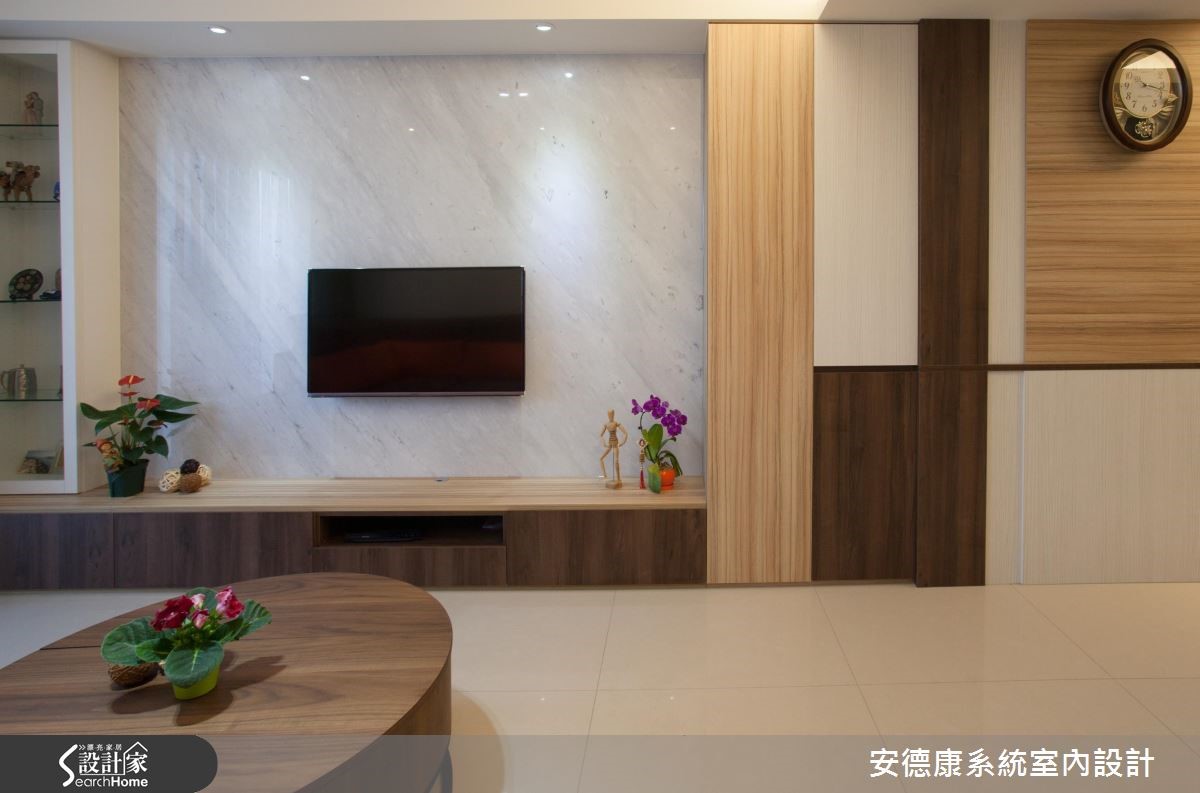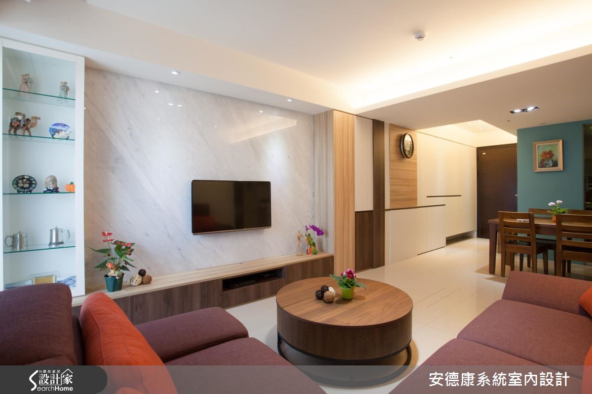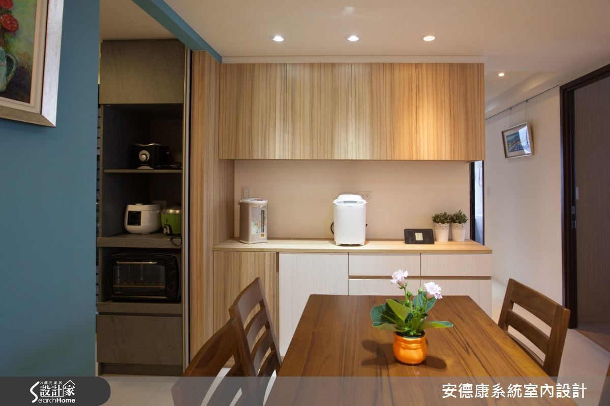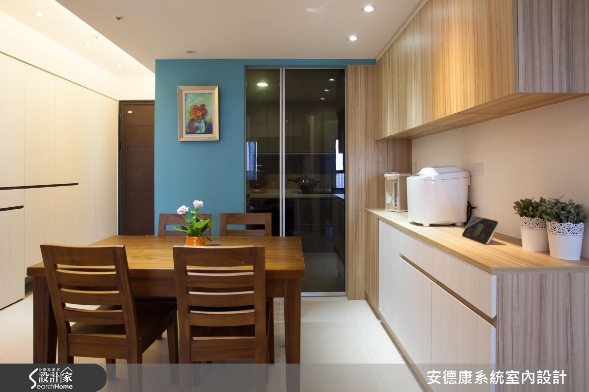 考虑到父母亲的照护需求,屋主一家人从原本的独栋楼搬到现在的单层住家,减少长辈的行走不便。在这次改造中,屋主因已习惯独栋楼宽广的生活空间,期待将有限空间尽可能放大,并且十分注重收纳规划,妥善利用家中每个角落。 【收整柜体不做把手,有效扩容】三室二厅的83平方米居宅,具有格局方正的优势,但主梁高度稍低,设计师巧妙运用客餐厅处的结构梁高低差,在天花处设置间接照明,以柔和灯光模糊梁柱的边角,达到视觉延伸、挑高层次的效果。从玄关至客餐厅的公领域设置了许多收纳柜,采用无把手的门片设计,让整体视觉显得相当简约清爽。电视主墙则利用小雕刻白大理石搭配系统柜,让具有优雅纹理的石材揉合木质温润个性,迸发丰富趣味。餐厨区以土耳其蓝创造清新亮点,并特意以镜面推拉门区隔厨房,有效阻挡油烟散溢,也能保留清透的空间视野。此外,因为卧室空间较小,收纳柜主要选择浅色系,辅以适当空间留白,提升私领域的舒适质感。