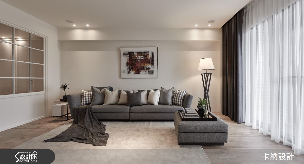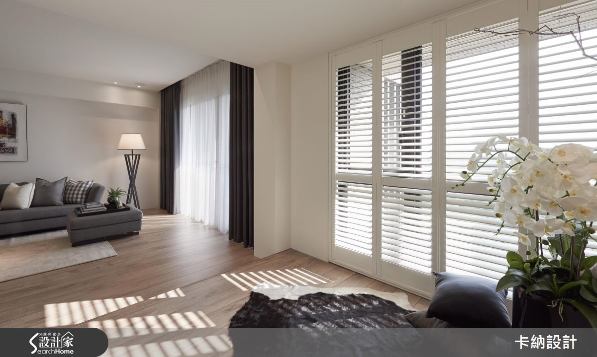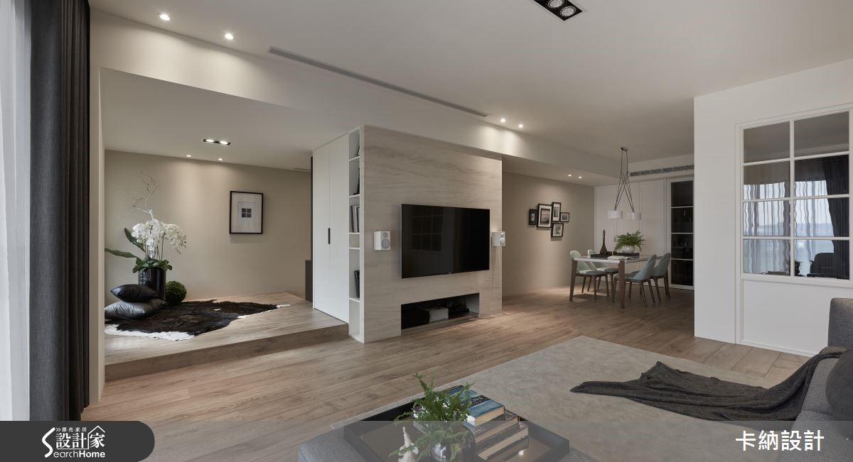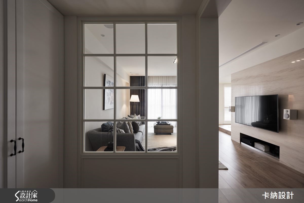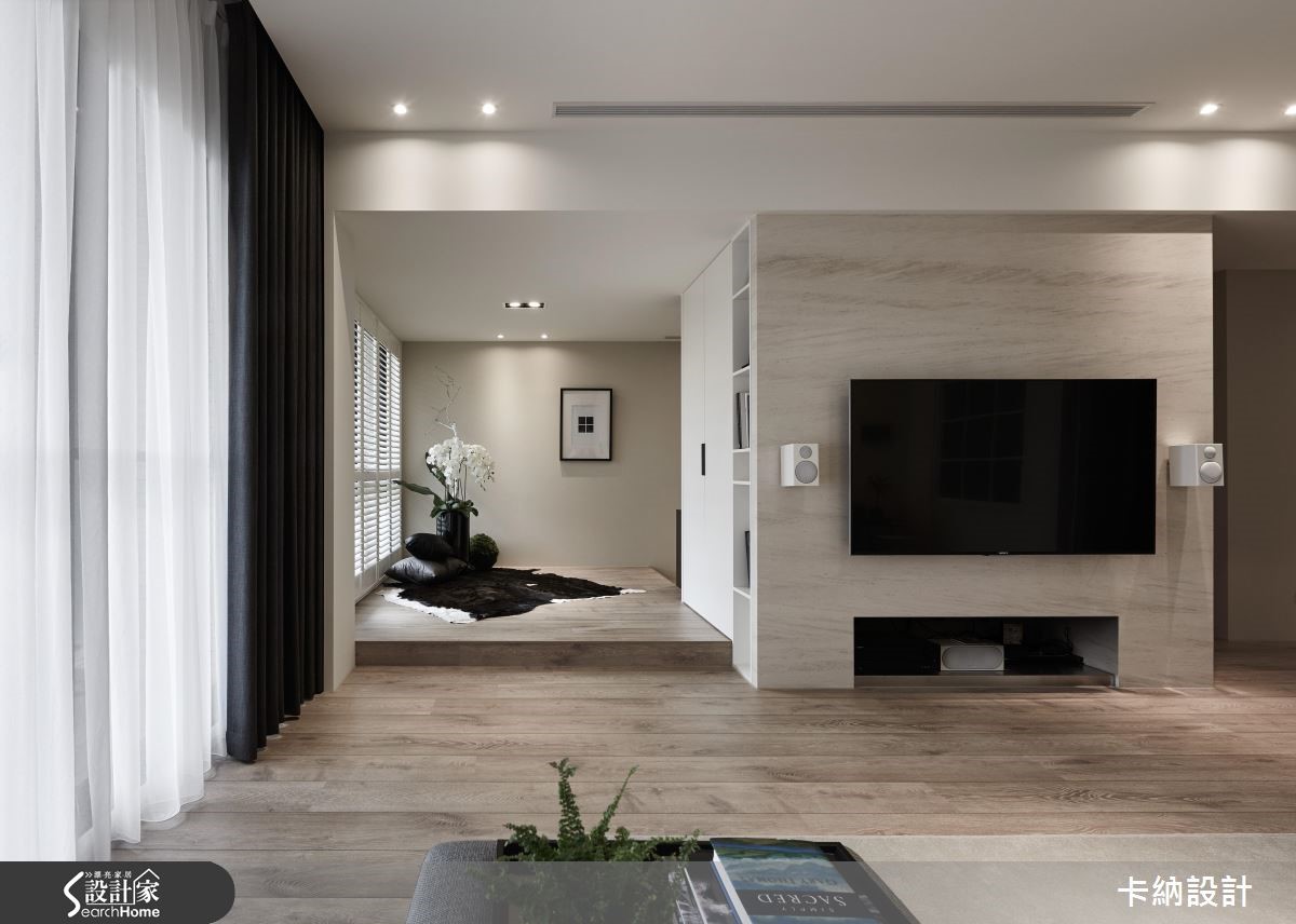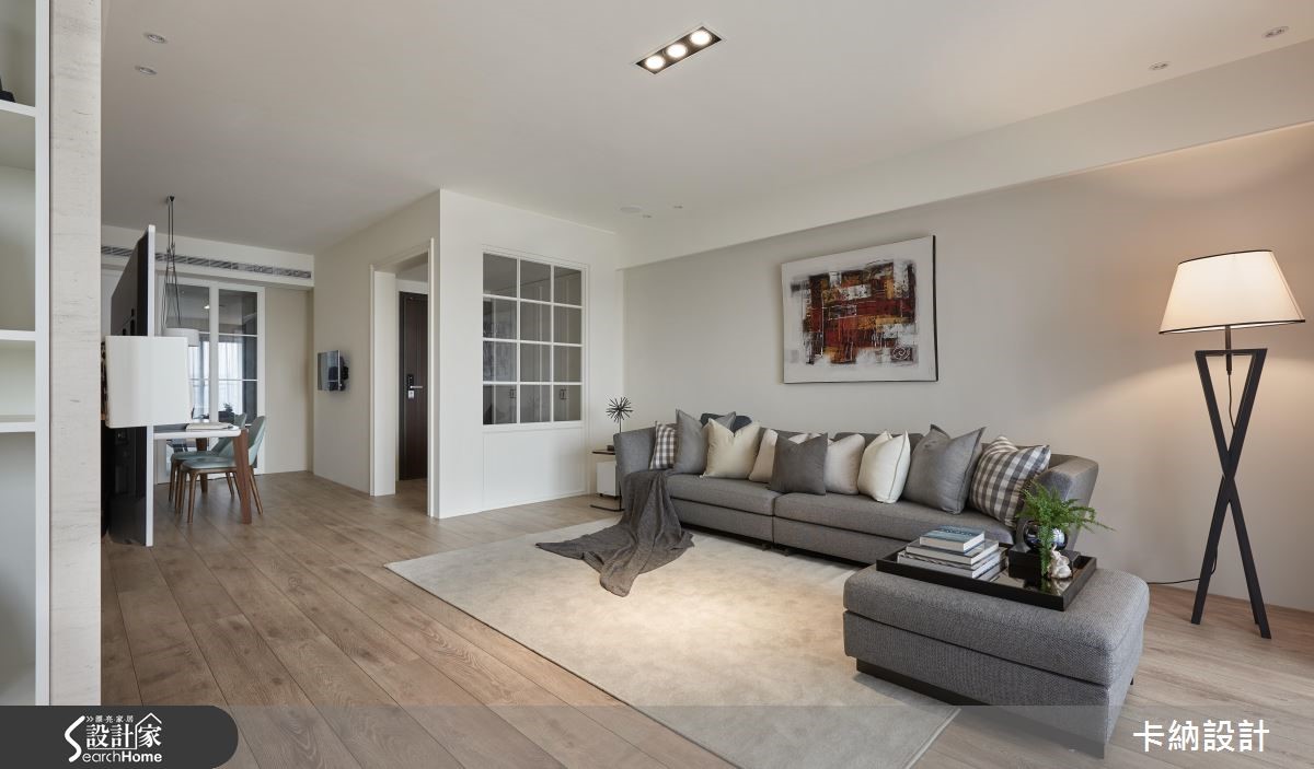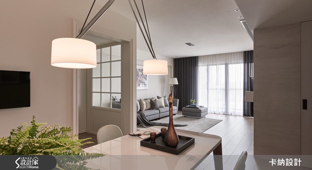 设计师洞见房屋原始格局的缺点,进行格局修正,进而创造流畅的生活动线,并依居一家四口的需求扩增足够的收纳机能,将精致清新的酒店风格注入居家空间,为新生活展开序曲。 【书房隐于电视墙,互动优又私密】比照欧美宅邸的生活习惯,利用廊道玄关加上格窗隔屏,满足收纳、落尘需求。开放空间内以纯白色调与富有情调的嵌灯为基底,并在全室铺设色调轻浅的木地板,设置大地色系的软装与家饰。电视墙则以大理石铺陈,打造精致稳重却不老气的氛围。将电视墙与三面柜进行结合,构筑大量收纳机能;特意将左侧地坪垫高,规划开放和室,既是客厅的延伸,更成为复合式使用场域。同时,别出心裁地利用阶差设计将书房隐身于电视墙后方,兼具隐私与互动度。清爽的用餐空间以线条利落的灯饰与家具搭配照片墙,简约不失温馨感。
