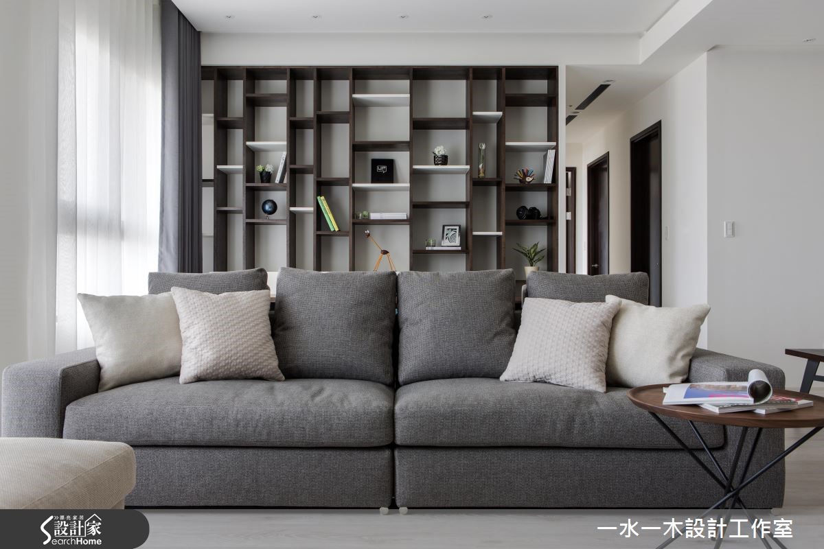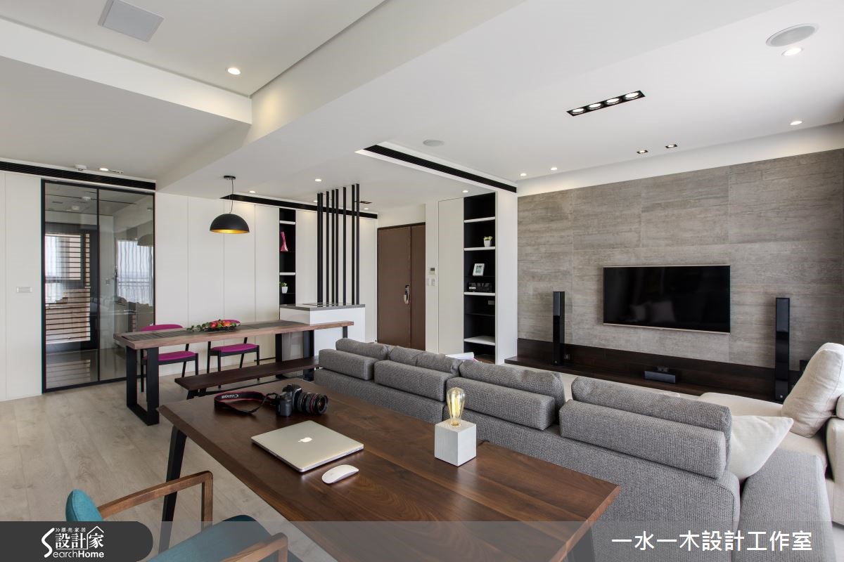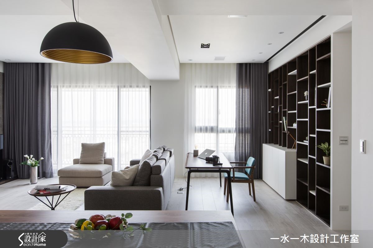 喜欢简单大方风格的屋主,设计师打造开放的公领域格局,使客厅、餐厅与书房连成开阔空间。并注入净透无负担的空间配置、简约优质的现代设计,在线条与对比色彩之中,创造出可让身心沉淀休憩的生活居所! 【中岛搭配格栅,成视觉焦点】85平方米的居家领域,设计师保留大面窗景、引注丰沛采光,使整体公领域浸润在美好的明亮气场中。并让客厅电视墙与沙发相呼应,谱出深灰的沉稳调性。书房、餐厅与客厅则开放串联,形成亲密的空间对话。一旁的餐桌中岛连结格栅线条,把玄关予以简单区划,建构具立体感的视线穿透效果。而除了玄关,更于书房背景底墙置入水平与垂直线条,注入收纳机能的同时,线性的交错也演绎俐落的现代风设计。主卧在平整床头处铺陈深色底调,搭配方正简洁的格局线条,阐述内敛的人文韵致,且保有阳台窗景与采光,让视线得以自室内延伸至户外,享受居高临下的美好景致!