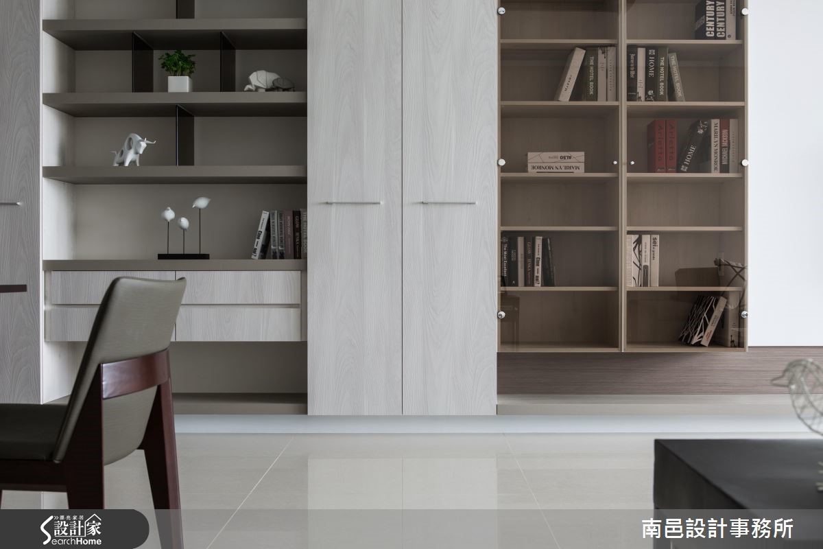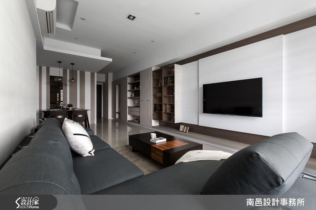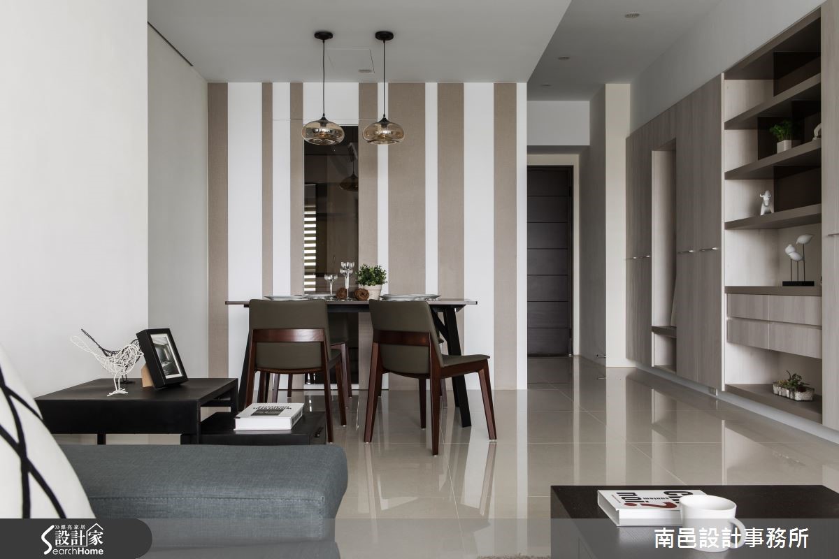 在格局限制之下,这户82平的空间中,设计师给予浅色打底、并导引明亮采光,使空间丝毫不显压迫。同时整合收纳机能、型塑简洁立面表情,将机能与美感一次网罗,快一起走进来看看吧! 【切换不同木色,延伸墙面视觉感】从玄关起始,设计师给予了延伸的立面表情,将柜体、电视墙与门片予以串联。透过层次分明的线条切割、由浅到深的木皮色调转化,拉宽整个主墙画面。并于客厅区域陈设深色家具,以阳光及电视墙的白色背景辅佐轻盈度,带来沉稳不沉重的视觉氛围。餐厅墙面铺贴浅色墙纸,垂直线条带出活泼感,并将门片线条巧妙隐于墙面,保留局部茶玻,无形中与吊灯的净透感相映成趣。卧室则在床头铺贴深色木纹,刻意修饰通往卫浴的入口;并设计立体框架增添变化感,与床头桌相互衔接,串联成一体成型的设计。