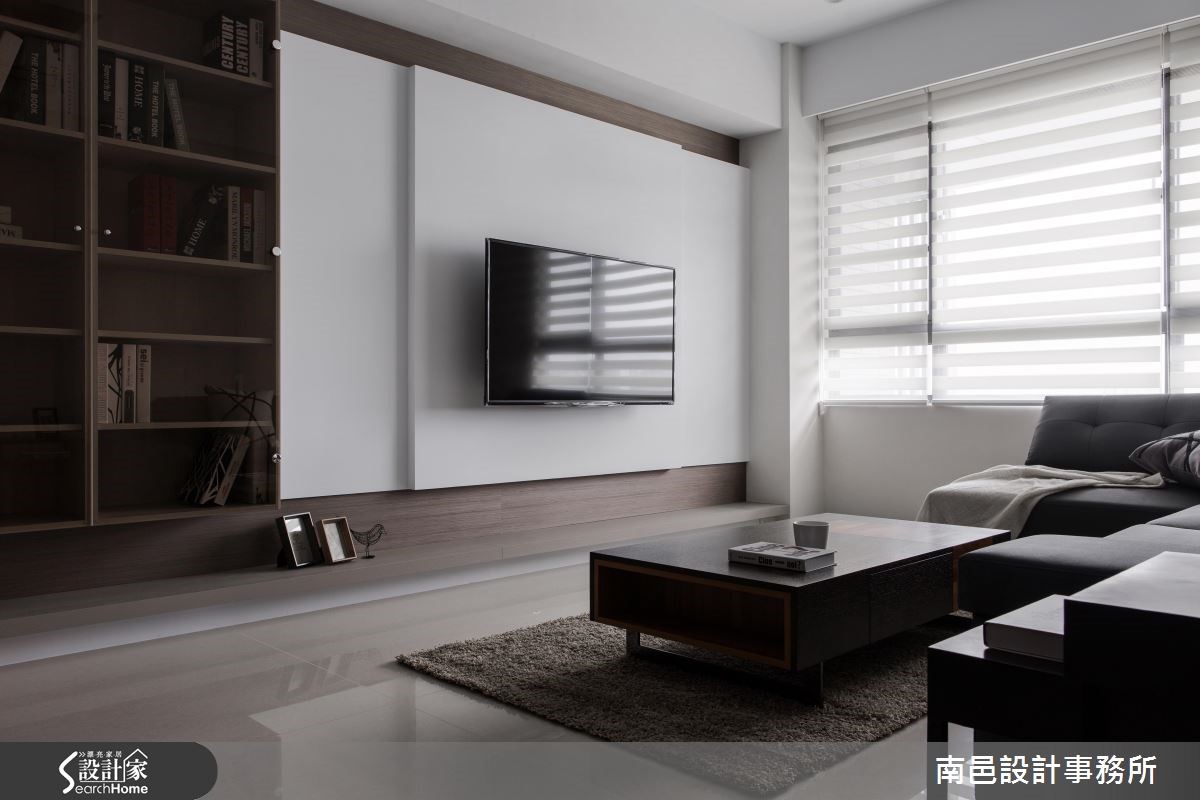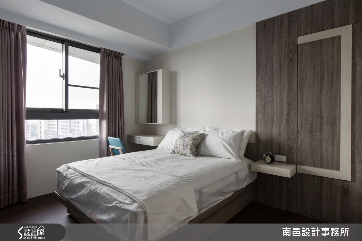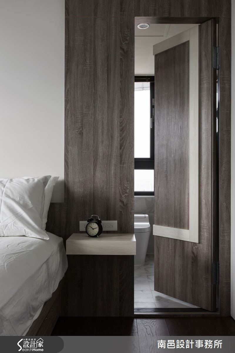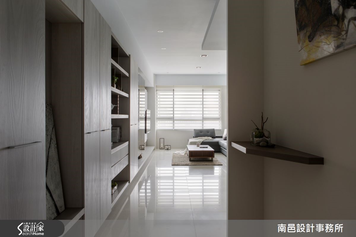 在格局限制之下,这户82平的空间中,设计师给予浅色打底、并导引明亮采光,使空间丝毫不显压迫。同时整合收纳机能、型塑简洁立面表情,将机能与美感一次网罗,快一起走进来看看吧! 【切换不同木色,延伸墙面视觉感】从玄关起始,设计师给予了延伸的立面表情,将柜体、电视墙与门片予以串联。透过层次分明的线条切割、由浅到深的木皮色调转化,拉宽整个主墙画面。并于客厅区域陈设深色家具,以阳光及电视墙的白色背景辅佐轻盈度,带来沉稳不沉重的视觉氛围。餐厅墙面铺贴浅色墙纸,垂直线条带出活泼感,并将门片线条巧妙隐于墙面,保留局部茶玻,无形中与吊灯的净透感相映成趣。卧室则在床头铺贴深色木纹,刻意修饰通往卫浴的入口;并设计立体框架增添变化感,与床头桌相互衔接,串联成一体成型的设计。