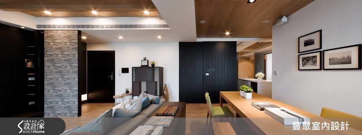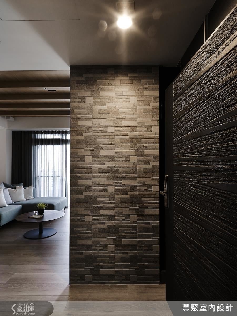 甫入室内的玄关区,丰聚设计利用自然纹理、凹凸错落的进口砖形塑一道屏风,避免室内景况外泄。电视墙延续屏风的材质,配以温润的超耐磨木地板、斜天花板以橡木贴皮构筑,演绎如同小木屋般会呼吸的休闲宅邸。