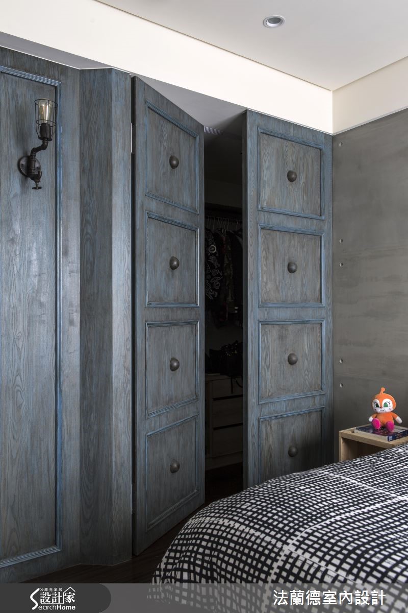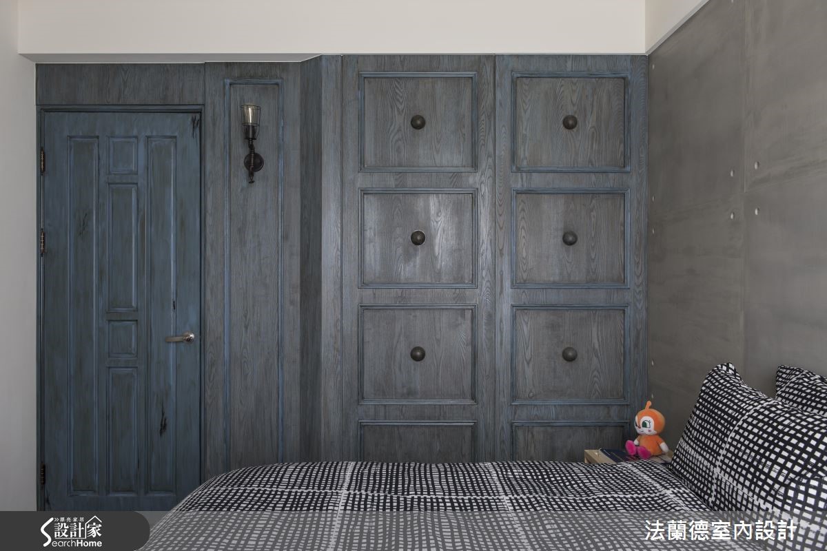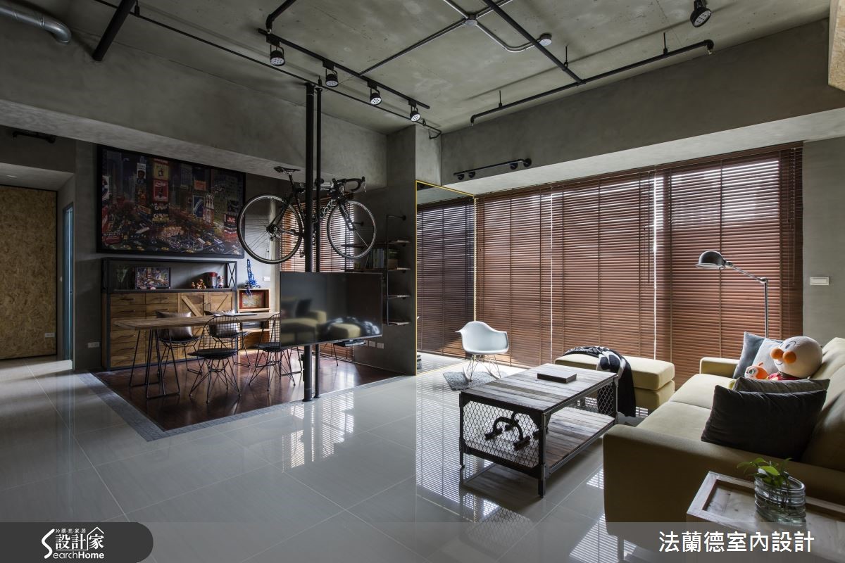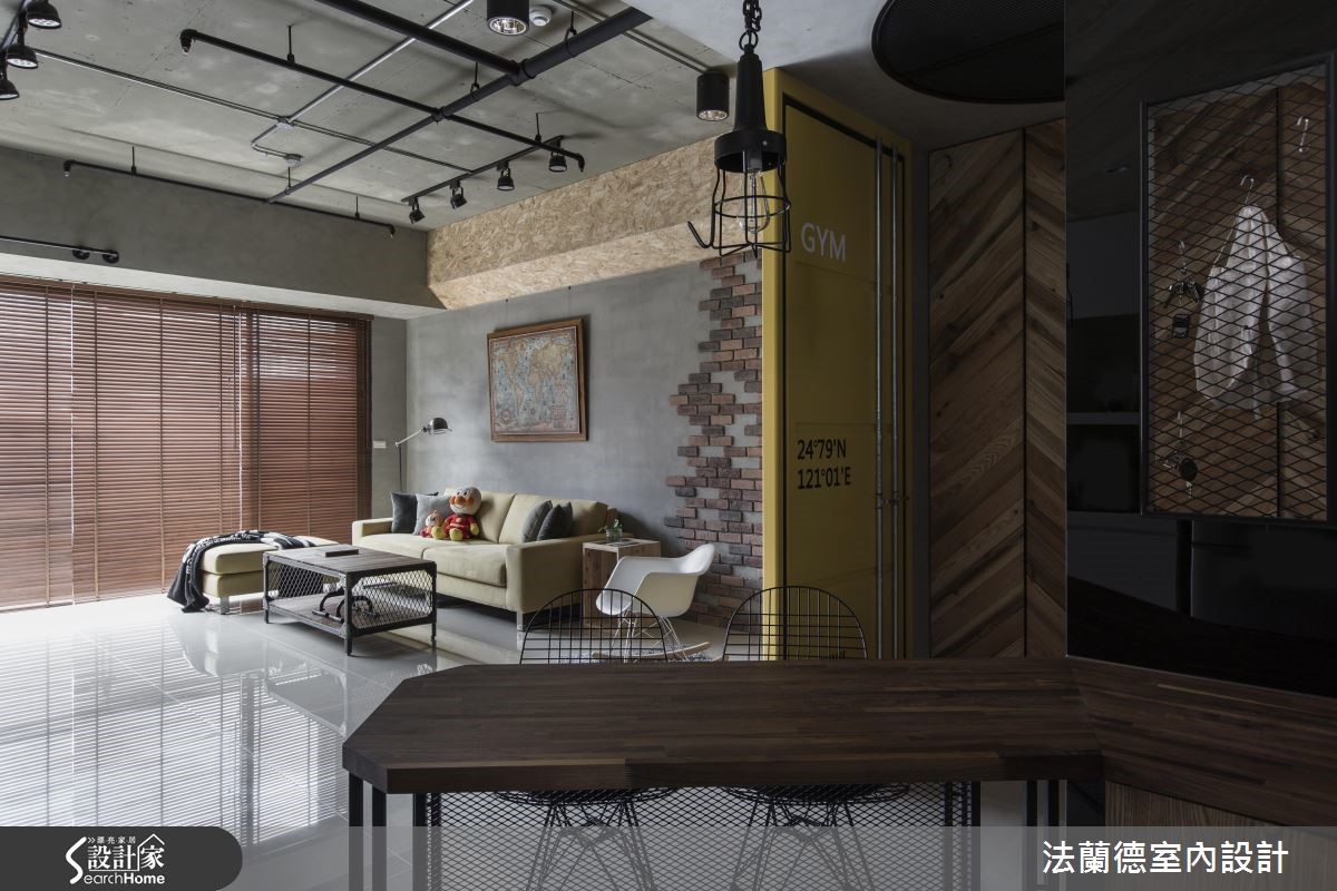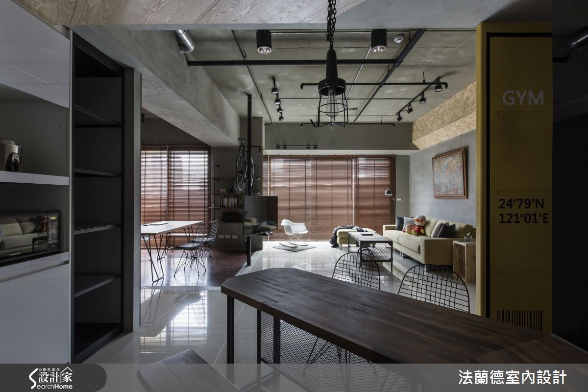 设计师一边面对原先狭小的书房格局、收纳不足的厨房、风格调性不一致等急需解决的问题,另一方面又必须结合屋主对运动、收纳的需求;于是在以Loft风格主导地位之下,将建材以多层次的手法铺排,搭配地道的复古单品,创造时尚多彩的居家空间。【灰色调重工业风,复古又时尚】设计师以灰质水泥为公领域塑造统一性,接着以定制铁件与鲜明色彩创造视觉亮点。玄关以鲜黄货柜门作为空间转折,视觉效果相当抢眼,门片上烙上屋主的英文名、生日与屋子坐标;左侧的定制网状铁柜更衍伸出创意立面收纳。公领域以重工业感的灰系色调为主视觉,以全开放设计拓增书房格局、达到开阔成效。配合屋主的需求,将运动元素与空间融合,利用嵌在梁上的水管作为单杠,并将旋转电视架及自行车架结合,增添酷靓帅气风格。利用集合性木料与红砖面为客厅背墙增添随兴氛围,复合式书房则利用定制铁件、木质家具与大面积黑板墙打造复古视觉。主卧室选择了单宁色的特殊复古漆及清水模质感床头墙,创造仿旧舒眠空间。
