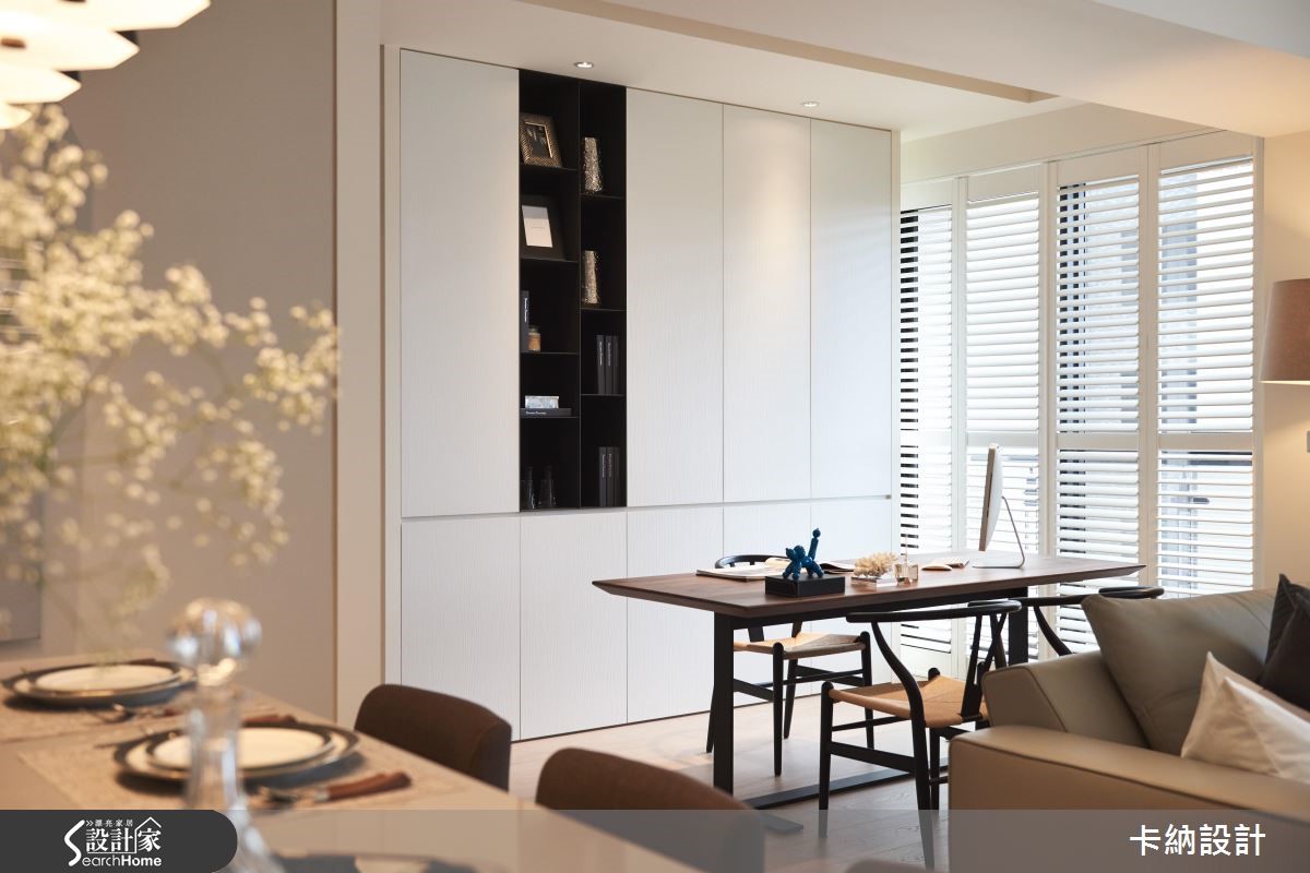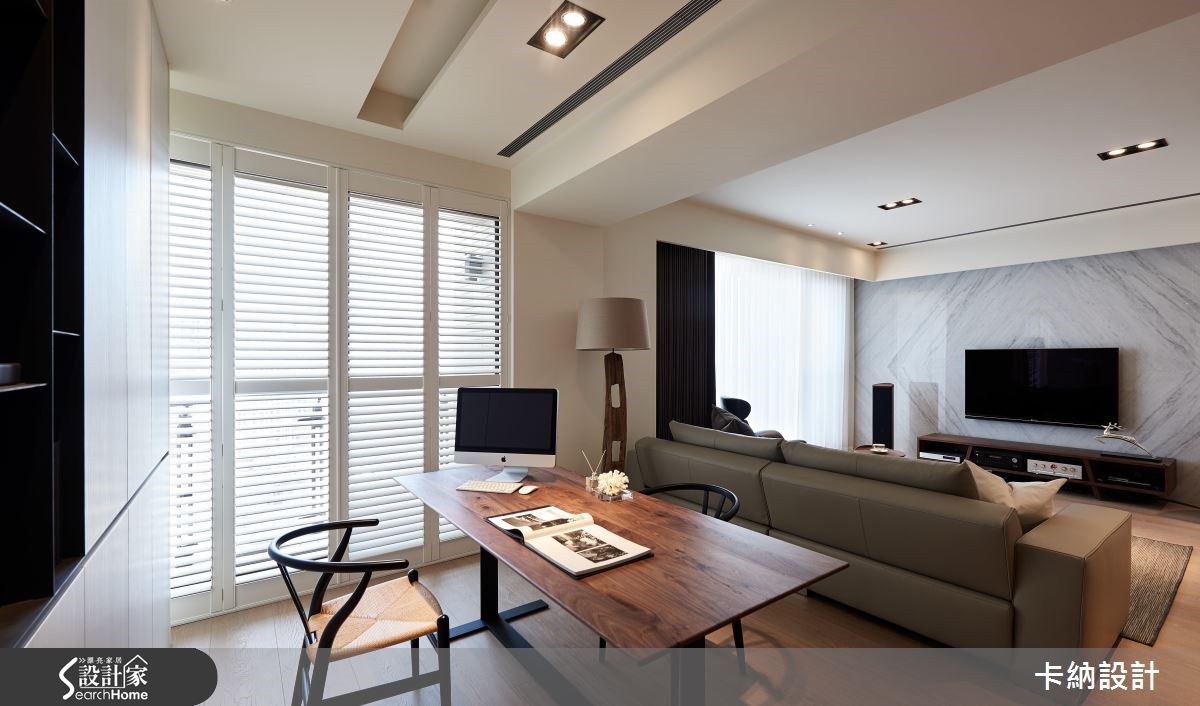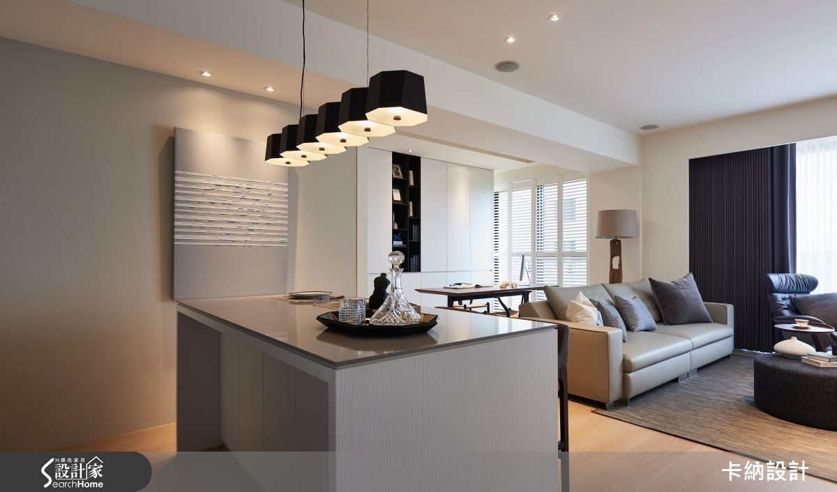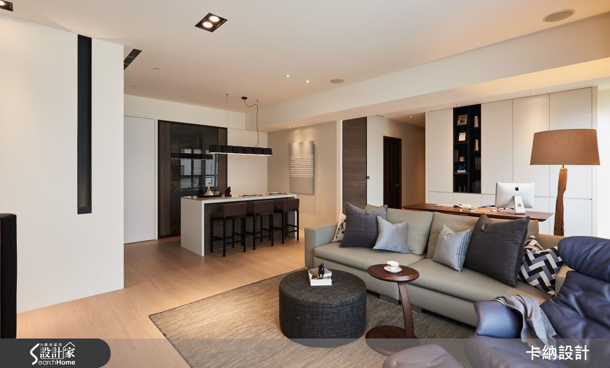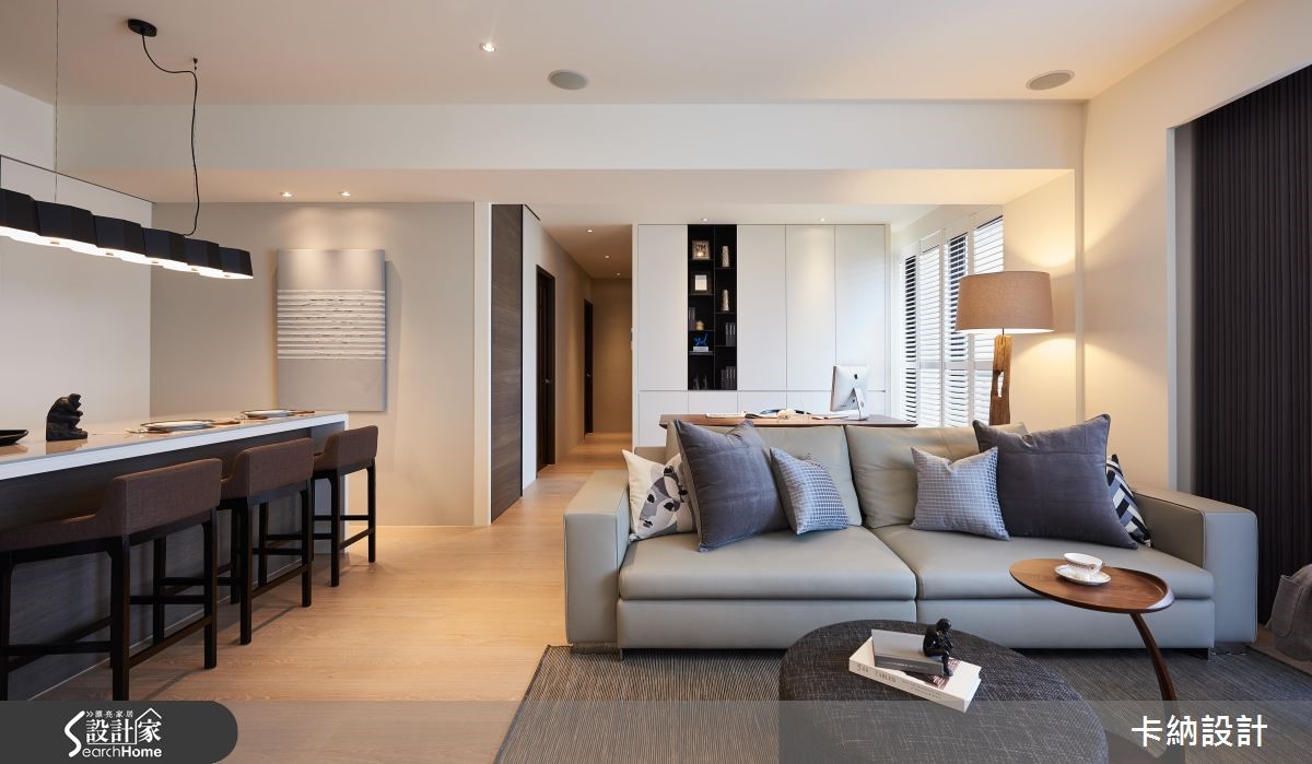 132平方米的现代风住家,设计师让客厅、餐厅等格局平均分布,着重流畅开阔的动线和视野,并注入返璞归真的大地色彩,将颜色纷扰降低,提供可喘息缓冲的空间,快跟着小编一起走进来看看吧! 【简洁天地线条,营造安定平衡感】公领域呈开放格局,天花和地面收整线条,赋予安定平衡的空间节奏。全室没有复杂装饰,仅透过木质、铁件或软装铺排,在白色背景之中妆点大地色与沉静幽蓝,营造柔和的色阶层次,搭佐晕黄的自然采光或灯光照映,活化居家表情。餐厅配置吧台取代制式餐桌,与厨房之间规划深色玻璃门片加以界定,在餐区点缀吊灯点亮气氛,搭配墙上艺术挂画,让用餐时光备感惬意舒适。书房则纳入公共区域,与客厅、餐厅形成开放互动,书柜借着黑白对比色带来利落的视觉层次。
