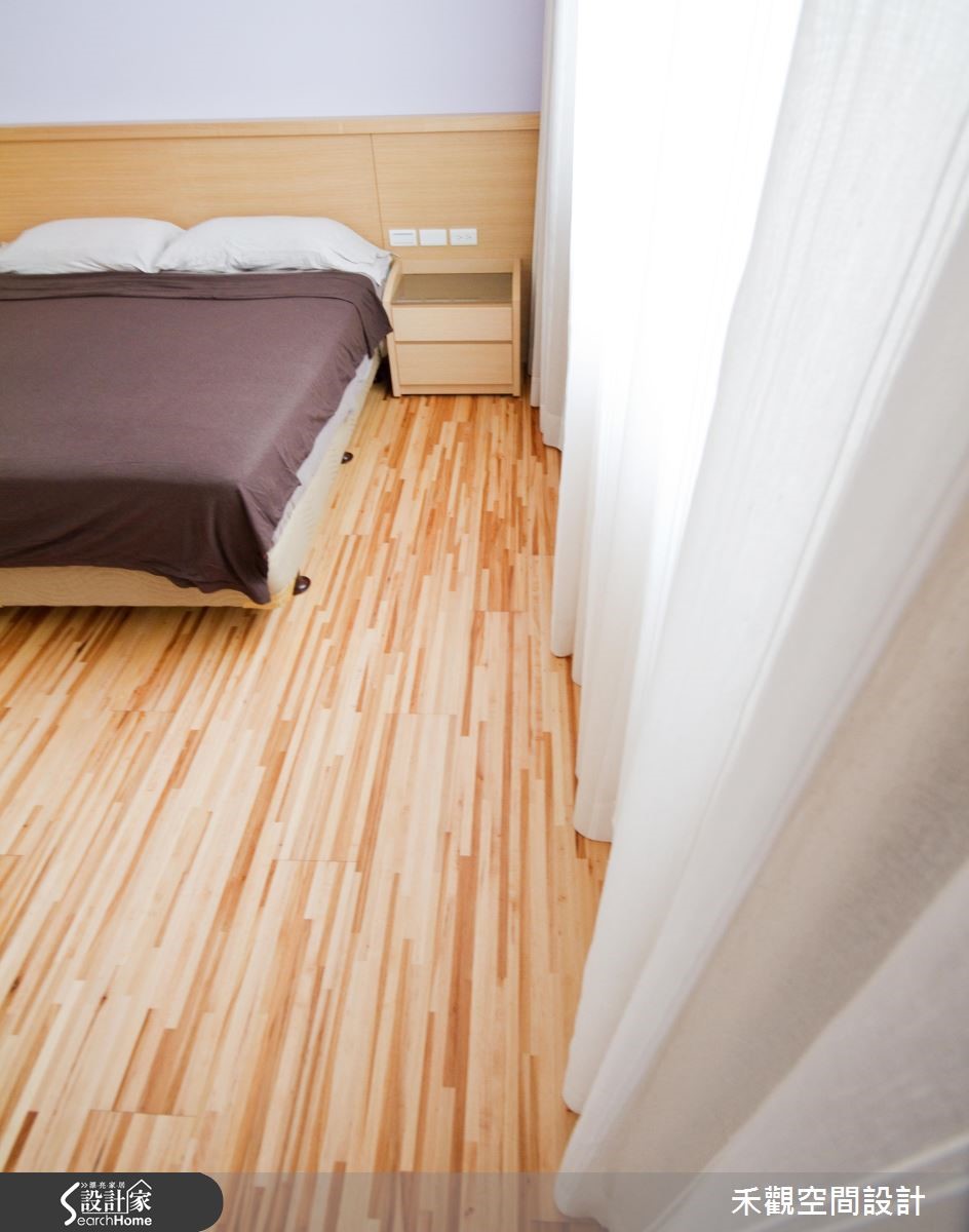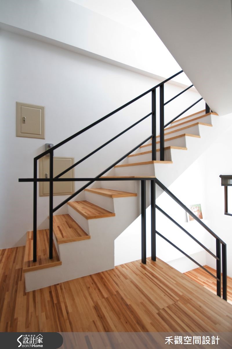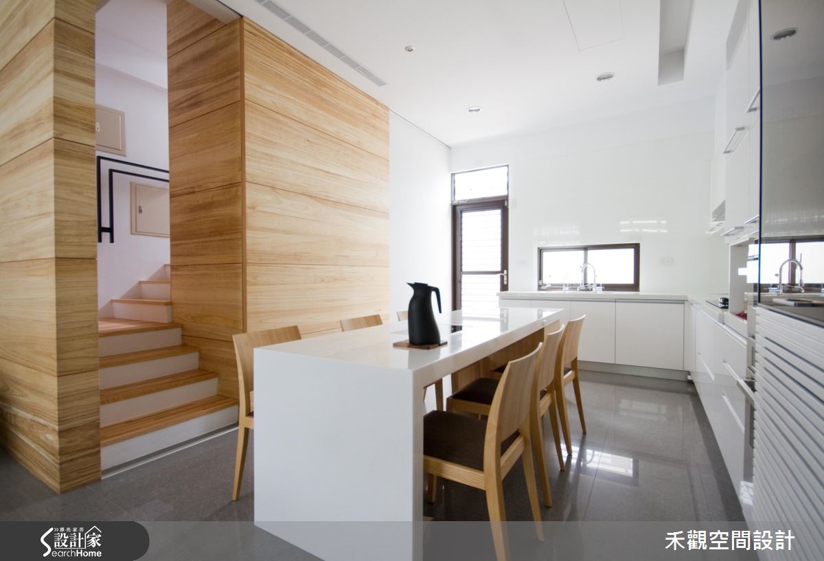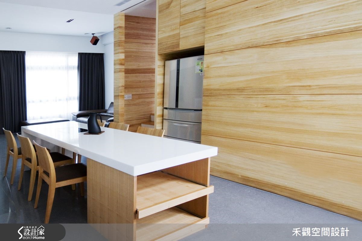 想要自然无负担的生活空间,就要善用天然建材和简化的设计线条。藉着木纹和石材的自然纹路,并将收纳机能隐藏于无形,使空间仿佛浑然天成,打造出富有人文气息、兼具休闲风格的生活场景。【鲜明木纹,空间更为活泼】设计师运用大量木皮,让空间保持一致协调性,透过木质显著的自然纹理强调休闲气息,采灰色石材堆砌电视墙,注入立体的层次感,使主墙跳出不一样表情,同时配置稳重的深色皮沙发,平衡整体空间的深浅色调。因应吊隐式空调主机位置,餐厅顺势包覆半边天花,给予客餐厅不同的高低落差。中央则规划内嵌电磁炉的中岛餐桌,侧面也不浪费,融入实用收纳机能,以洗练的白色呼应周边厨具,展现清爽简洁的氛围。转身沿着楼梯而上,踏阶延续了鲜明的木纹线条,让视觉更显丰富。并搭接黑色铁件架构,呼应整室悠闲风情。步入卧室后,则可见低高度的寝具配置,搭配低水平线的柜体,藉此降低空间视线,创造亲和力十足的纾压气场。