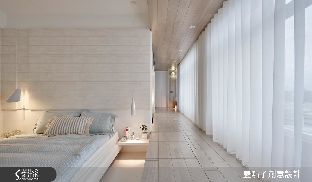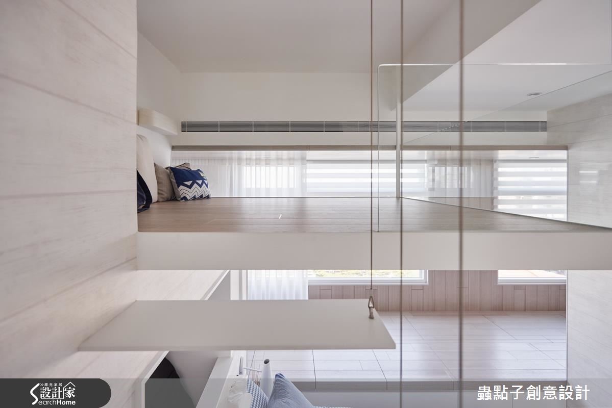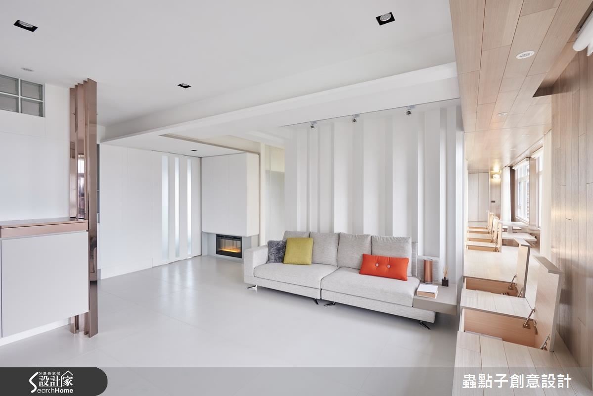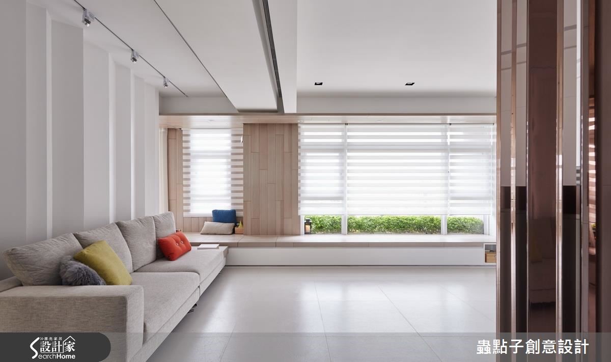为了促成明亮氛围,设计师打破制式的4室2厅格局,采以轻盈的白色为底调,并顺应光影不同时段的角度变化给予设计,刻意模糊空间边界,以光廊串联整体场域,让阳光、空气可恣意流动,成为生活中的绝佳养分! 【破除传统隔断思维,空间更宽敞】设计师破除传统隔断的思维,型塑宽阔舒适的空间感,藉由廊道与缝隙规划,使门墙之间的分野变得模糊,让光线成为居家主角。材质上刻意将木皮染白呼应整体,仅穿插少许金属、跳色抱枕点亮视觉,隐约刻画精彩的细节。设计师在沙发墙做出立体起伏的线条造型,搭衬户外阳光照射,构成深浅明暗变化,赋予视觉律动感,并让线条元素延伸至窗帘,无论是水平方向的斑马帘、或充满垂直皱褶的落地窗纱,共组趣味的对话。笔直延伸的飘窗,构成场域间的密切串联,不仅坐拥采光与风景,更暗藏升降桌与收纳空间,以复合设计完善生活中的需求。而主卧内则加入跃层设计,破除制式的格局模式,并让上下层保有透空视觉,不仅达到放大场域效果,更予人漫步云端的趣味感!