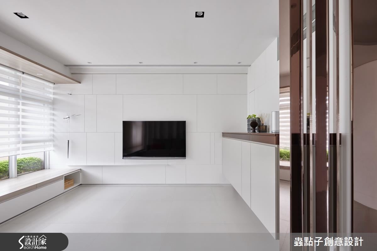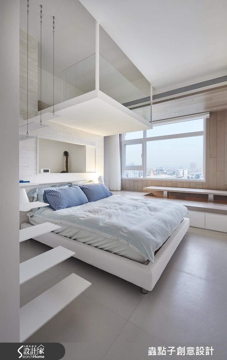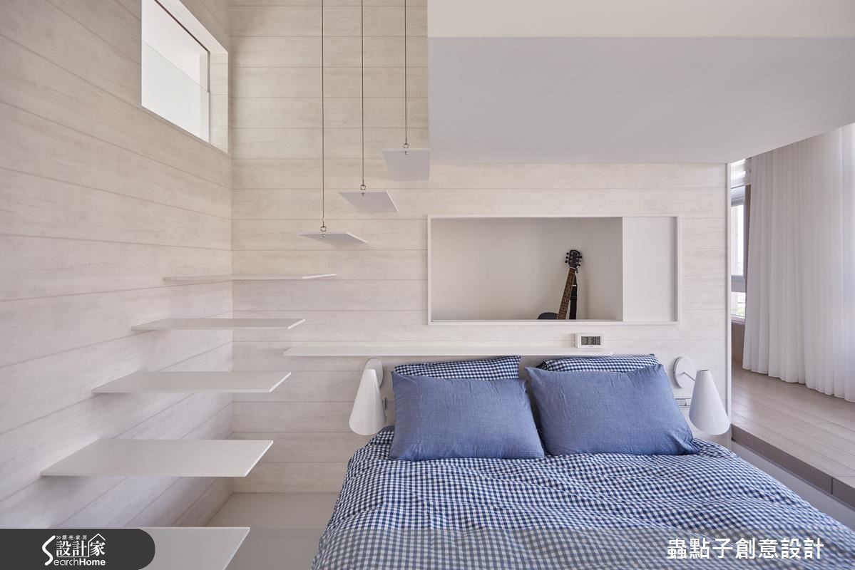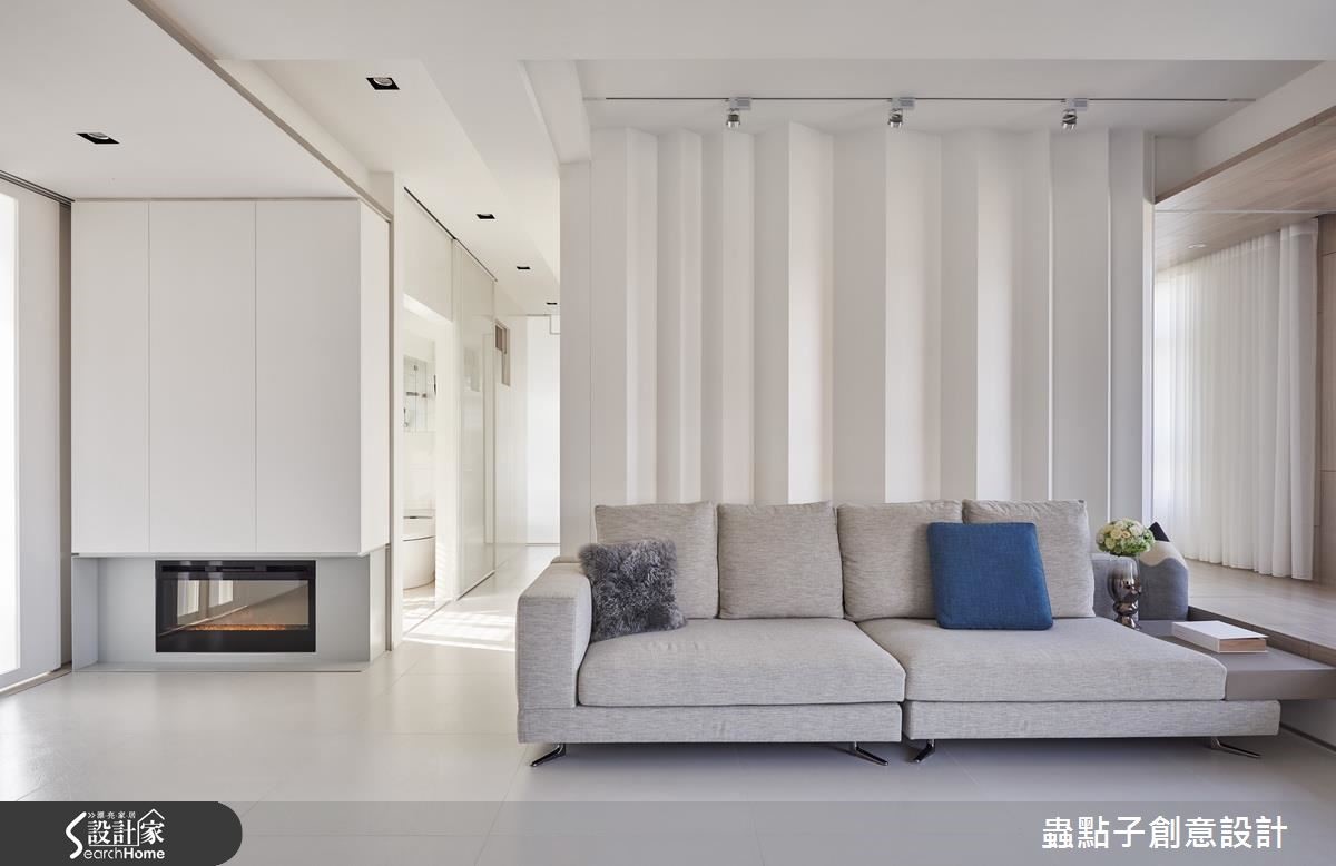 为了促成明亮氛围,设计师打破制式的4室2厅格局,采以轻盈的白色为底调,并顺应光影不同时段的角度变化给予设计,刻意模糊空间边界,以光廊串联整体场域,让阳光、空气可恣意流动,成为生活中的绝佳养分! 【破除传统隔断思维,空间更宽敞】设计师破除传统隔断的思维,型塑宽阔舒适的空间感,藉由廊道与缝隙规划,使门墙之间的分野变得模糊,让光线成为居家主角。材质上刻意将木皮染白呼应整体,仅穿插少许金属、跳色抱枕点亮视觉,隐约刻画精彩的细节。设计师在沙发墙做出立体起伏的线条造型,搭衬户外阳光照射,构成深浅明暗变化,赋予视觉律动感,并让线条元素延伸至窗帘,无论是水平方向的斑马帘、或充满垂直皱褶的落地窗纱,共组趣味的对话。笔直延伸的飘窗,构成场域间的密切串联,不仅坐拥采光与风景,更暗藏升降桌与收纳空间,以复合设计完善生活中的需求。而主卧内则加入跃层设计,破除制式的格局模式,并让上下层保有透空视觉,不仅达到放大场域效果,更予人漫步云端的趣味感!