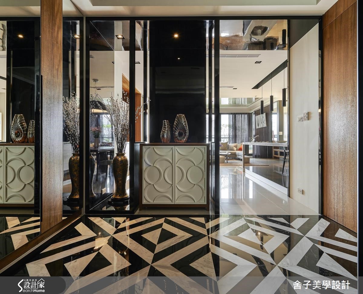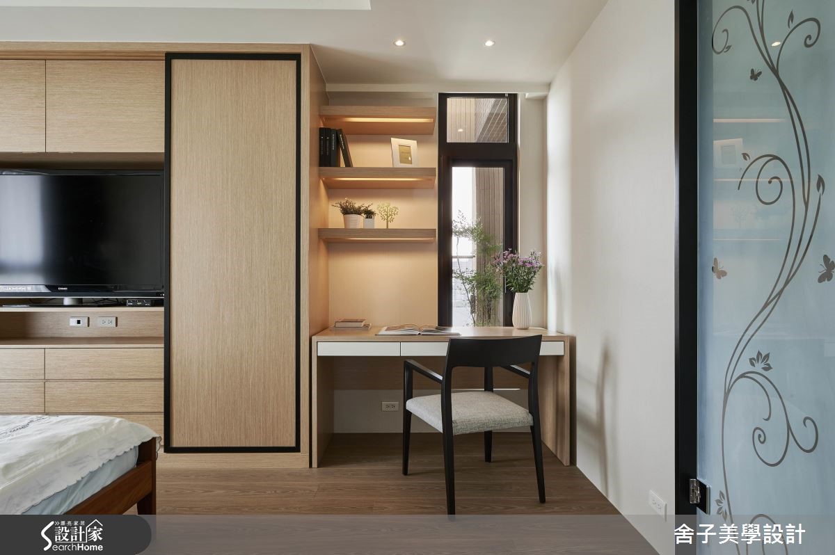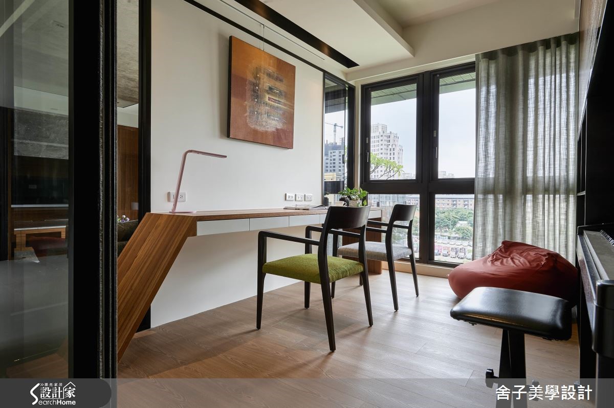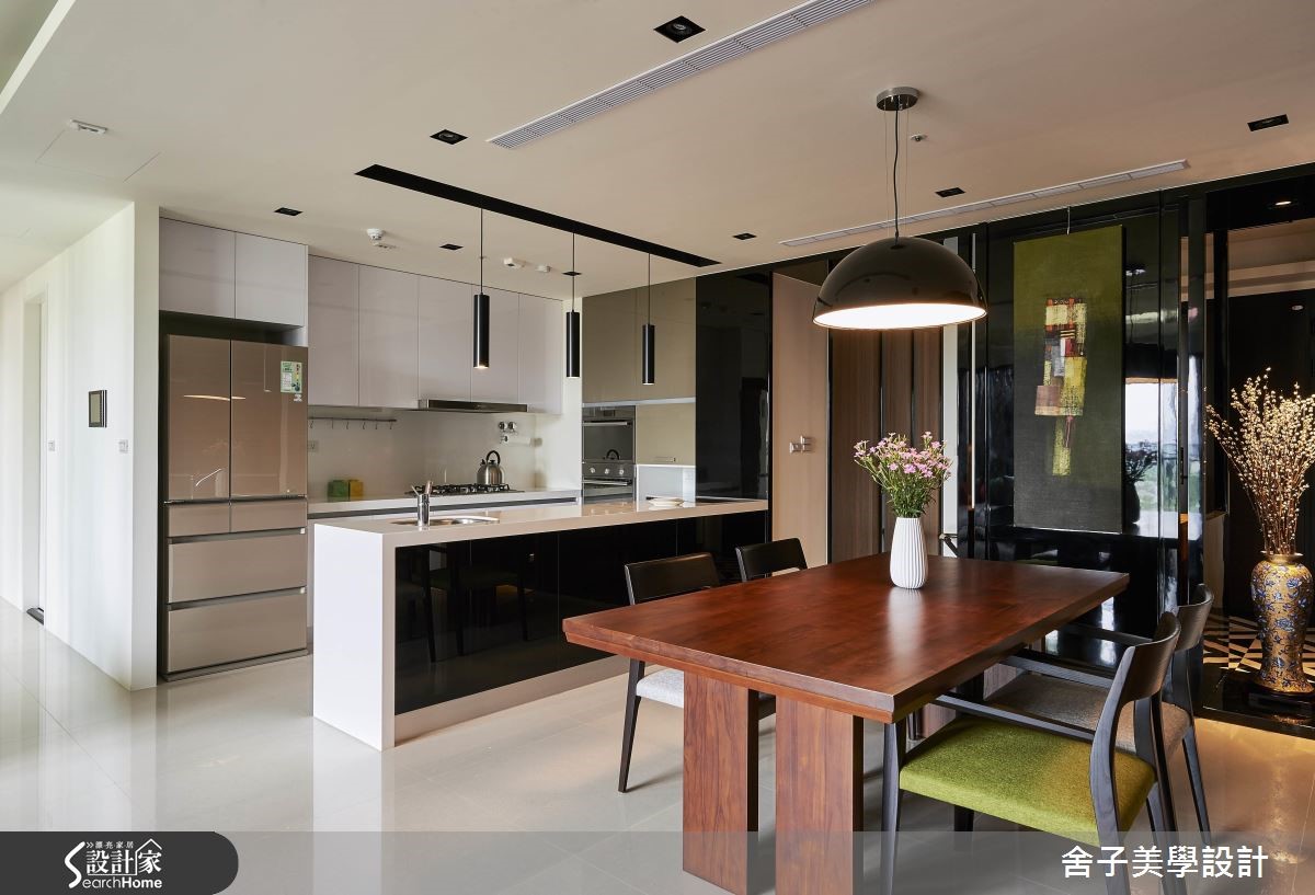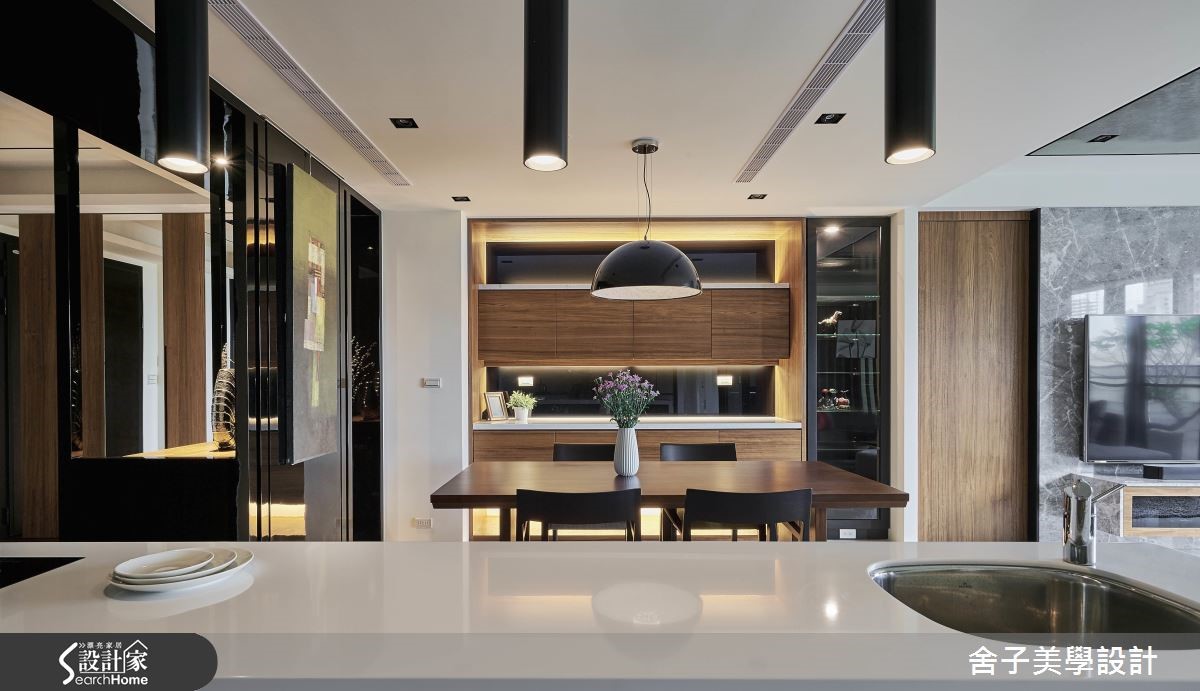 46 坪现代宅,坐拥三面採光的优秀条件,设计师给予大面积窗户导引明亮氛围,并因应一家四口喜爱阅读的习惯,规划全家皆可使用的书房场域,满足屋主一家对于生活的想像,快跟着小编一起走进来看看吧!玄关选用黑白大理石铺陈地坪,以菱形跳色的拼接形式强化立体度,并透过黑色钢琴烤漆为背景、搭配家饰陈列,建构大器的入门端景;客厅电视墙採大理石搭配木皮,底部嵌入悬吊柜体,成就樸实沉稳的立面表情,天花板特别以银箔纸染金衬出低调奢华感,沙发墙则突破制式形式,作出格栅搭配画作带出些许禅风底蕴,两侧佐以清玻处理,保有场域之间的通透串联;厨房呈开放形式,运用黑白色调阐述优雅质感,搭配实木餐桌、木纹餐柜,将现代感与自然悠閒风格完美连结;书房则被视为一家四口的生活重心之地,隔间加入清玻材质,延续整体空间感,并规划斜角造型书桌,以俐落的转折演绎现代风韵;主卧在电视墙铺述木皮纹理,释放自然人文质感,电视旁则连结书桌,藉着植栽、阳光构筑一处舒适的阅读小角落!小编的最爱卧房更衣间选用喷砂玻璃门片,并点缀藤蔓图腾语彙,替空间增添优雅与曼妙!