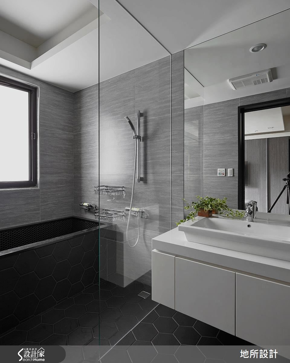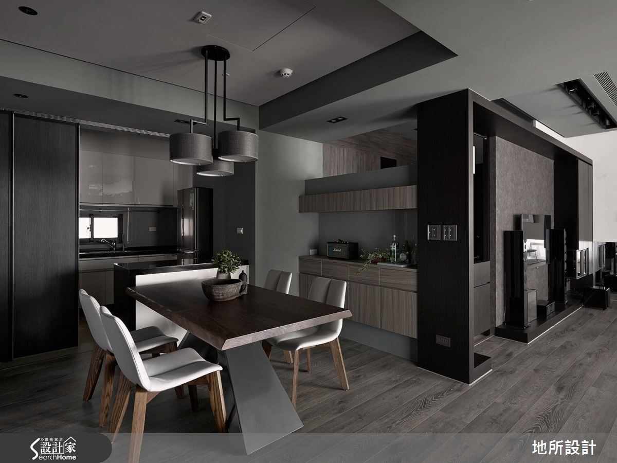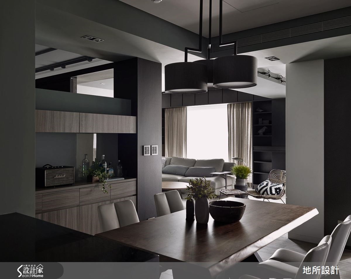 在高冷灰的时尚空间中,其实这是一个为亲子生活所规划的住宅。突破一般常见的格局配置思考,设计师让客厅转向,动线自然连贯餐厨空间,打造适合陪伴孩子、阅读绘本,并且好收纳的居家生活。【沿窗设置柜体,扩增收纳机能】整体空间选用屋主夫妻所喜爱的深邃色调,搭配细致的木纹、金属以及镜面等不同材质,呈现精致而舒适的生活情境。为了让使用空间更为广阔,客厅特地转向,以落地窗为生活背景,便多了左右延伸的空间,也能安排儿童游戏区,能随时与家人互动。为了扩增收纳量,除了在客厅两侧墙面设置柜体,沙发后方也沿着窗框做出U字收纳柜,不浪费任何空间。餐厅与玄关的隔断除了界定领域,更加入收纳机能性,刻意采用不及顶的局部镂空设计,保留光线与视野的通透性。走进主卧室,床头墙以刷漆及木皮染色拼接,一道细腻的金属线性从中划分疆界,延伸至另一侧床边,则可看见镜面烤漆柜与精致玻璃灯,运用质感单品点缀,诠释生活的时尚态度。设计师也将时髦的特质延伸至卫浴空间,墙面选择富有感性的浅灰纹理。地面则采用黑色六角砖,并延续至浴缸的转折立面,满足屋主夫妻对于摩登生活的期待。