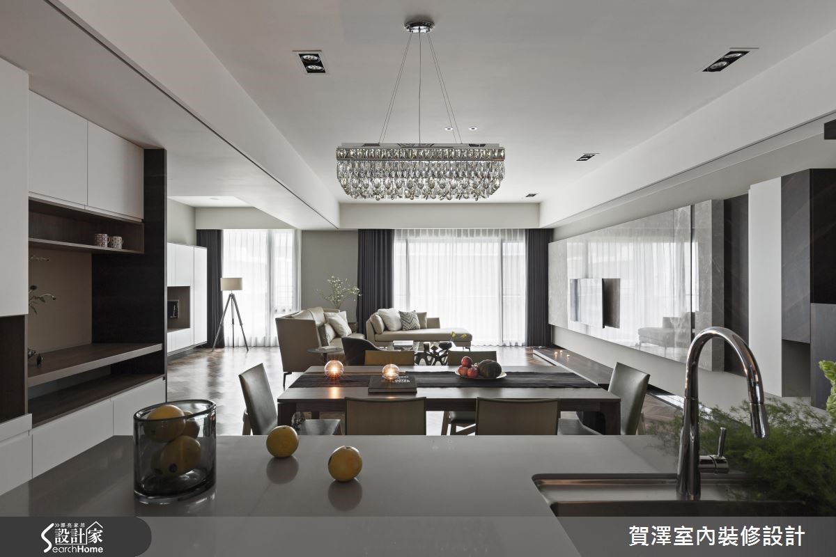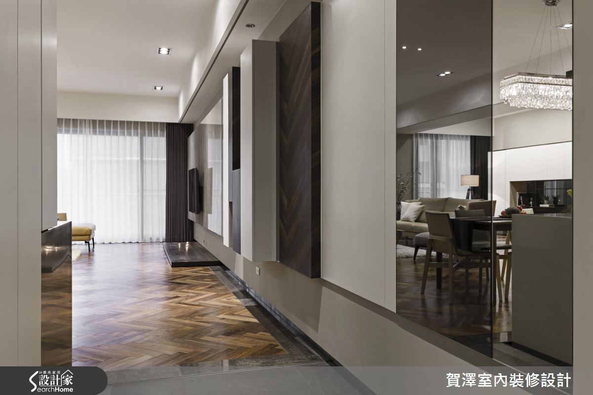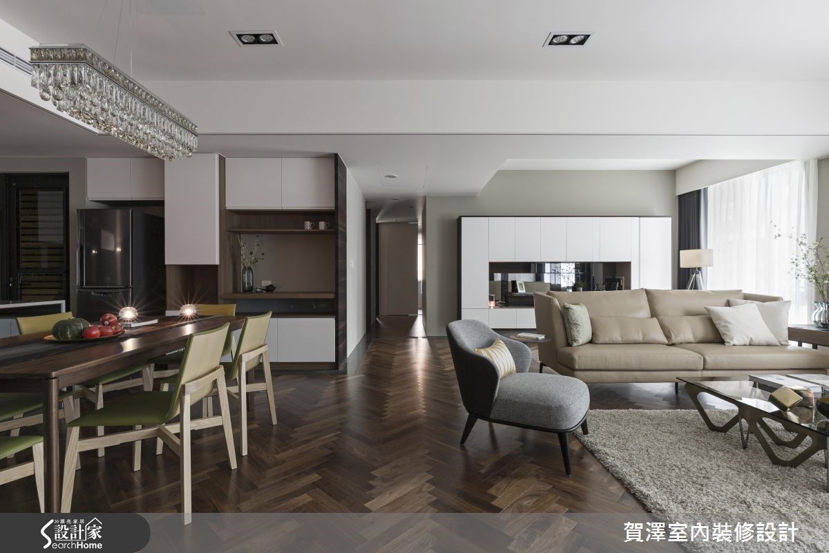 宽广的单层空间,作为屋主平时休閒度假用途,设计师从毛胚屋阶段开始,重新配置格局,增设3间居室,并保留开阔大器的公共领域,藉由实木皮、大理石、灰镜等不同材质的搭配堆叠,让屋主能在此展开舒适而不失质感的假期生活。【开阔尺度、舒心自在的氛围】具艺术个性的展示柜,由玄关延伸至电视墙,运用了黑檀木皮、烤漆、铁件、大理石、灰镜与灯光等多样的材质搭配,创造出丰富的视觉风景。公共区域包含广阔的客厅区及开放式餐厨,开阔的空间让动线变得自由随性,也拥有良好的视野。地坪采用大面积的木质复古人字拼,细腻摹画充满文艺感的线条架构,营造浪漫的异国情调。而客厅旁的大面落地窗,则为生活迎入明亮饱满的亮度,渲染慵懒放松的度假氛围。厨房运用大量灰镜增添质感,而透过镜面映射,也有放大空间的视觉效果,餐桌上方以精致吊灯作为焦点,让餐饮时光奢华上演!私领域融入更衣室、梳妆台等丰富机能,卫浴更保有宽敞尺度,并拥有宜人窗景和充裕採光,盥洗时也能舒适自在。
