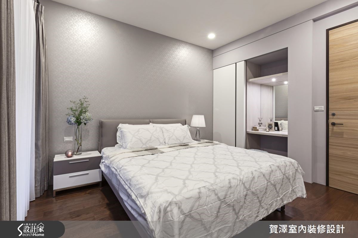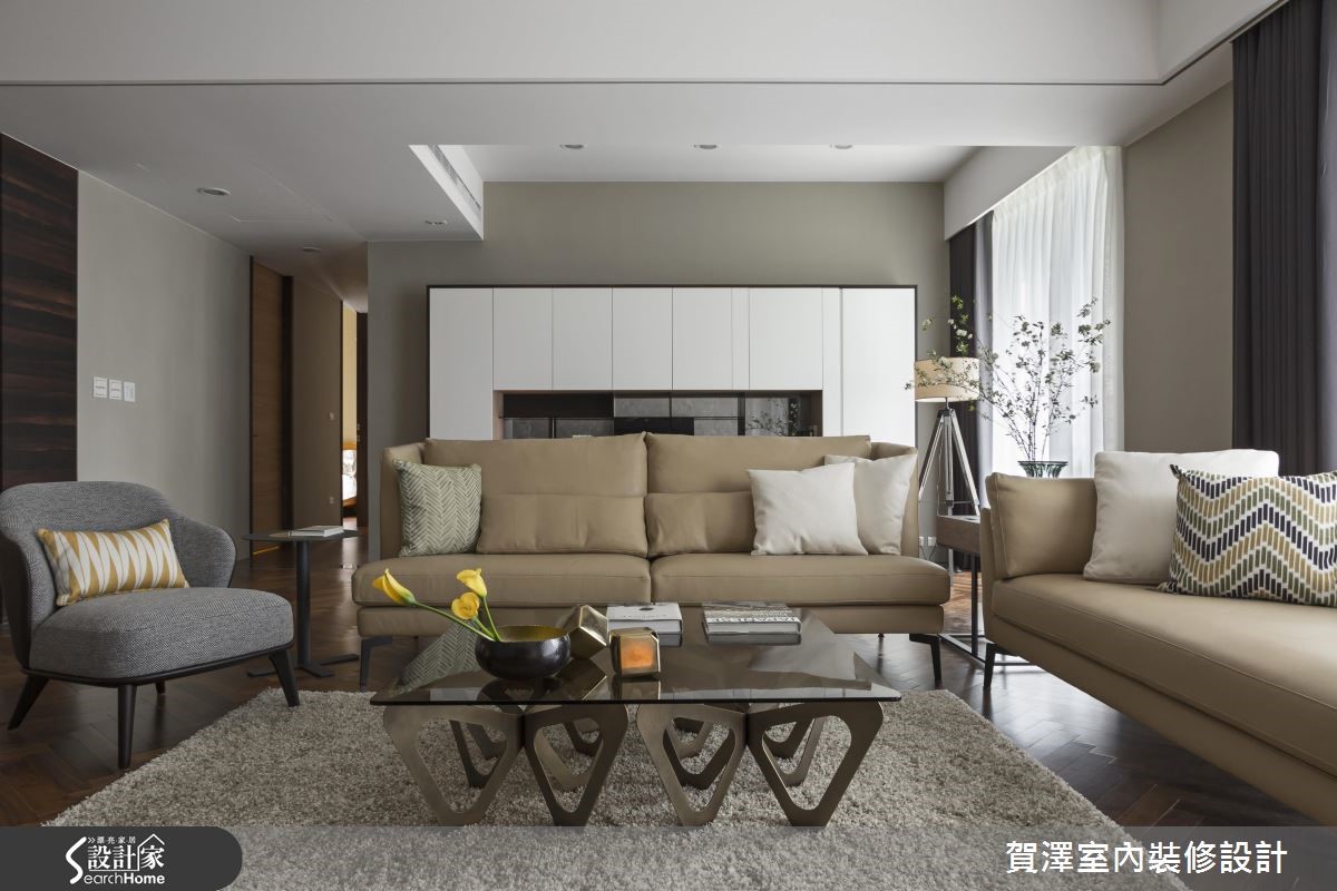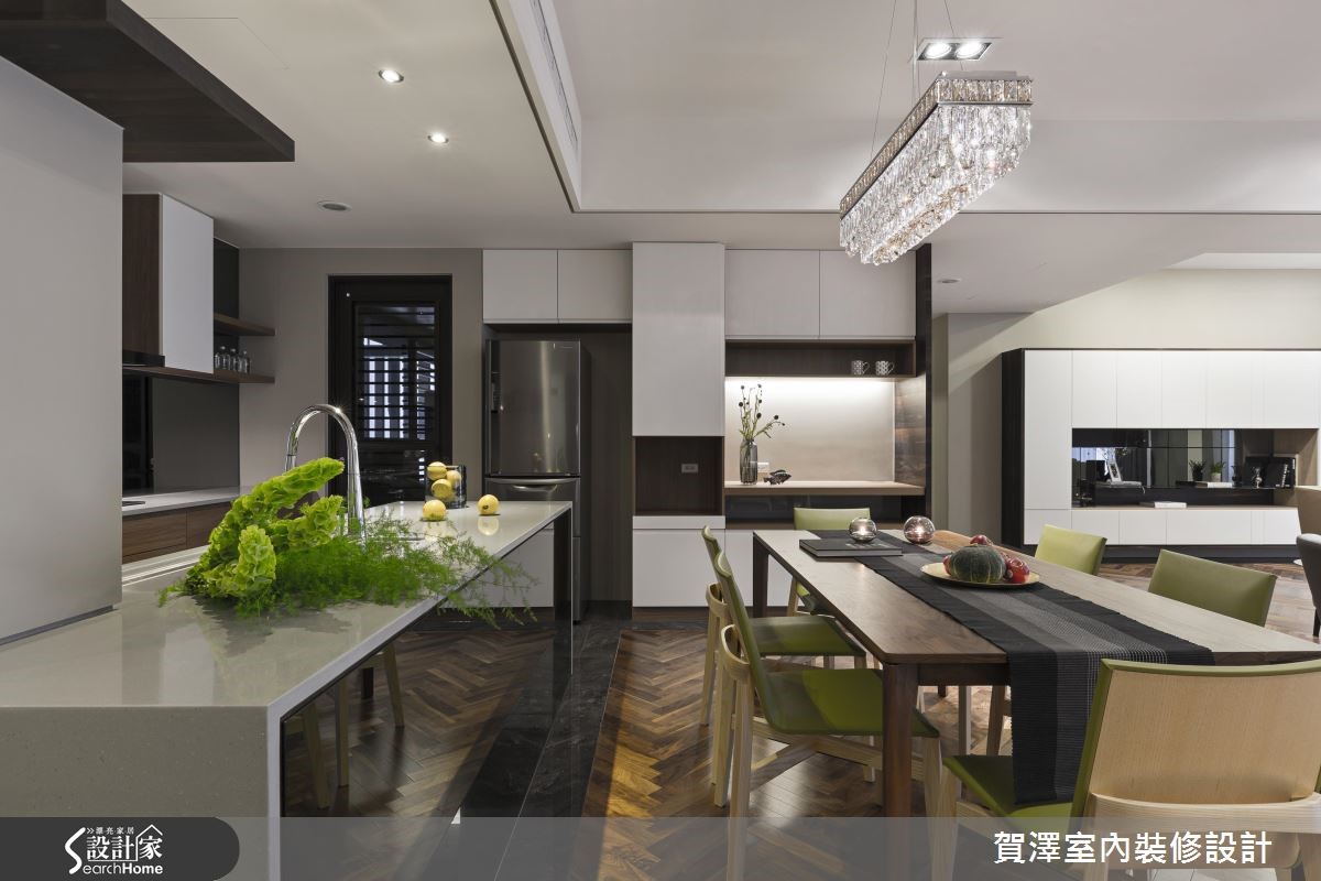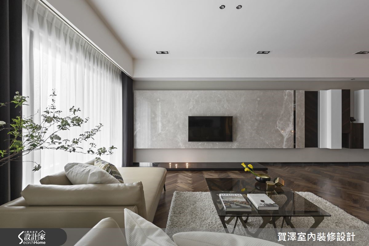 宽广的单层空间,作为屋主平时休閒度假用途,设计师从毛胚屋阶段开始,重新配置格局,增设3间居室,并保留开阔大器的公共领域,藉由实木皮、大理石、灰镜等不同材质的搭配堆叠,让屋主能在此展开舒适而不失质感的假期生活。【开阔尺度、舒心自在的氛围】具艺术个性的展示柜,由玄关延伸至电视墙,运用了黑檀木皮、烤漆、铁件、大理石、灰镜与灯光等多样的材质搭配,创造出丰富的视觉风景。公共区域包含广阔的客厅区及开放式餐厨,开阔的空间让动线变得自由随性,也拥有良好的视野。地坪采用大面积的木质复古人字拼,细腻摹画充满文艺感的线条架构,营造浪漫的异国情调。而客厅旁的大面落地窗,则为生活迎入明亮饱满的亮度,渲染慵懒放松的度假氛围。厨房运用大量灰镜增添质感,而透过镜面映射,也有放大空间的视觉效果,餐桌上方以精致吊灯作为焦点,让餐饮时光奢华上演!私领域融入更衣室、梳妆台等丰富机能,卫浴更保有宽敞尺度,并拥有宜人窗景和充裕採光,盥洗时也能舒适自在。