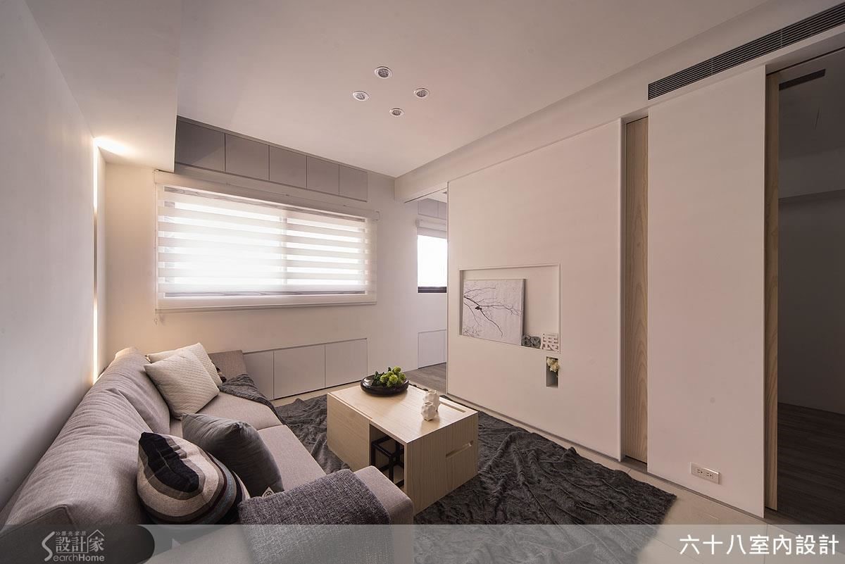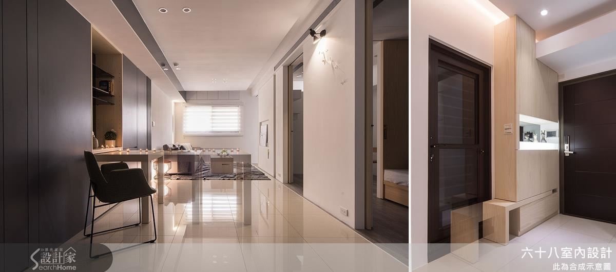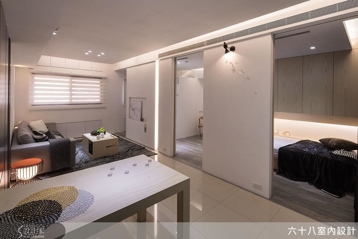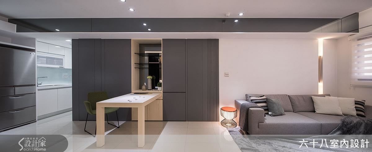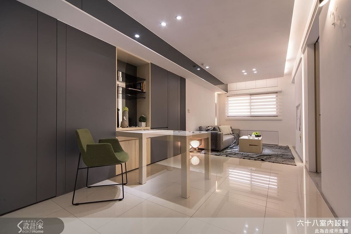 将仅仅63平方米的空间精准切分为4房2厅,利用开阖自如、宛如魔术方块的机能定制家具,在收放之间为居家空间创造流畅动线。更善用人工照明,在材质与光源间创造明亮。【复合机能,激发小户型实用创意】设计师以”机能迭加”概念,创造居家多维利用性,动线与家具间的移动关系皆经过缜密的计算。玄关以加入实木皮柜体完整收纳功能,将移动式穿鞋椅结合镂空柜体,丝毫不影响行进动线。以高效机能为设计主轴,利用能随需求拉伸的定制家具,为小户型与狭窄动线创造宽敞生活空间!客厅主墙与通往私领域的木质门片结合,并在吊顶与墙面凹槽内装设间接照明,搭配背墙长型嵌灯,形成富有层次的风景。开放式空间抹除客、餐厅的界线,仅以深浅色调作为空间划分,一张伸缩式长桌作为灰色隐藏式柜体的延伸,发展用餐、工作的复合机能,同时为狭窄的走道保留流畅动线。推拉门打通卧房与复合式阅览空间,降低封闭感,并利用大量柜体塑造收纳量。