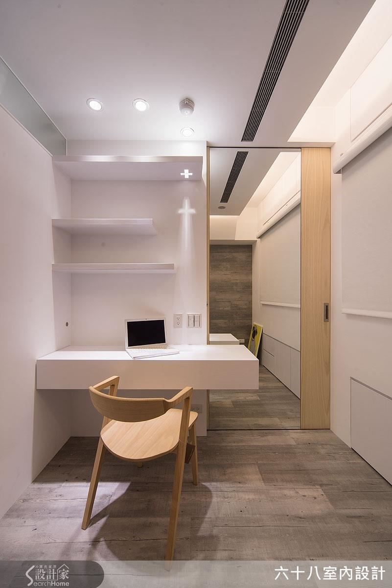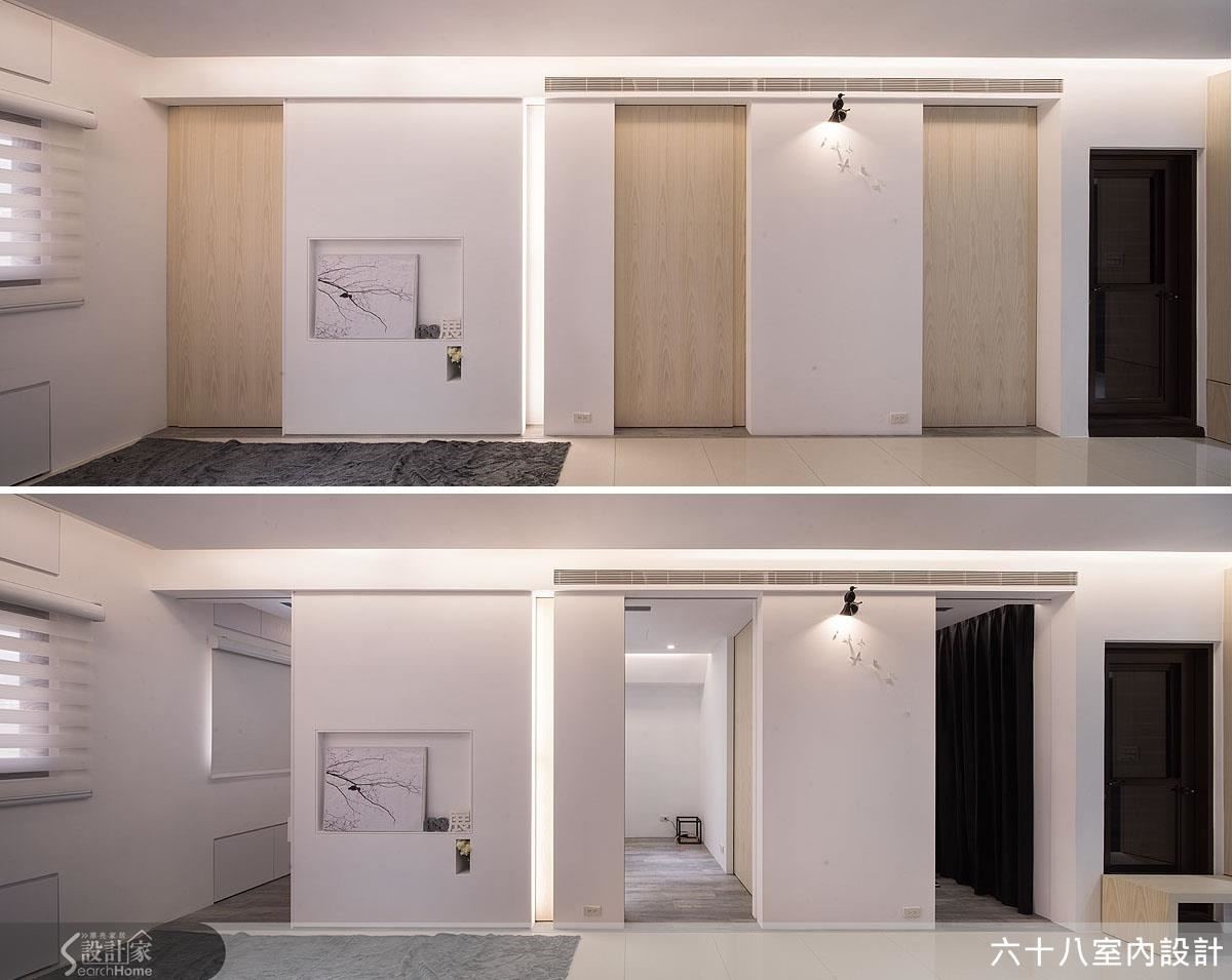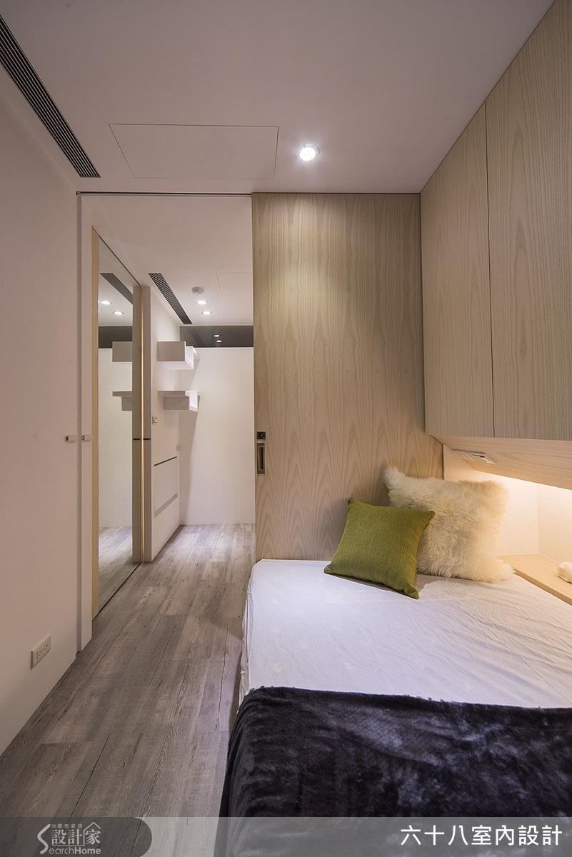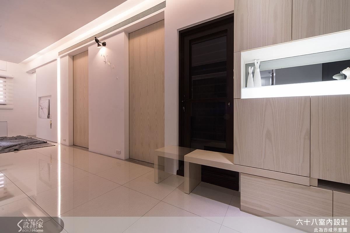 将仅仅63平方米的空间精准切分为4房2厅,利用开阖自如、宛如魔术方块的机能定制家具,在收放之间为居家空间创造流畅动线。更善用人工照明,在材质与光源间创造明亮。【复合机能,激发小户型实用创意】设计师以”机能迭加”概念,创造居家多维利用性,动线与家具间的移动关系皆经过缜密的计算。玄关以加入实木皮柜体完整收纳功能,将移动式穿鞋椅结合镂空柜体,丝毫不影响行进动线。以高效机能为设计主轴,利用能随需求拉伸的定制家具,为小户型与狭窄动线创造宽敞生活空间!客厅主墙与通往私领域的木质门片结合,并在吊顶与墙面凹槽内装设间接照明,搭配背墙长型嵌灯,形成富有层次的风景。开放式空间抹除客、餐厅的界线,仅以深浅色调作为空间划分,一张伸缩式长桌作为灰色隐藏式柜体的延伸,发展用餐、工作的复合机能,同时为狭窄的走道保留流畅动线。推拉门打通卧房与复合式阅览空间,降低封闭感,并利用大量柜体塑造收纳量。