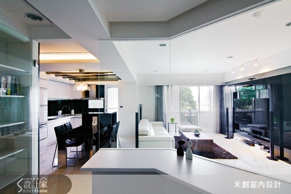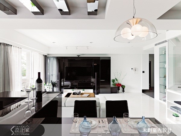 邻近河堤,拥有充沛阳光绿意的住宅空间,是父母送给儿子的新婚礼物。设计师重新修改不适宜的格局,纳入贴心的生活机能,并以屋主喜爱的黑白色调,打造时尚的新婚幸福宅。 【通透视野与采光,烘托黑白优雅】整体色调采用男屋主偏爱的黑白对比,客厅以一整面黑色玻璃烤漆带出质感,透过材质映射效果,反映窗外的绿意景致,在时尚简洁中保有感性的生活温度。餐厨区机能齐备,包含用餐餐桌和两人吧台,天花处的镂空金属格栅增添灯光的变化,在一片黑白时髦之中,增添浪漫的生活情调。书房则运用玻璃隔断,让视野穿透,也更加贴近与另一半相处的距离。主卧室铺上暖木色地板,为利落的对比色调增添温馨感,丰富的收纳和机能,更显舒适感。此外,为长辈贴心规划的孝亲房,除了基本机能安排,也利用半身高的双面柜体,区隔出一个阅读小天地。