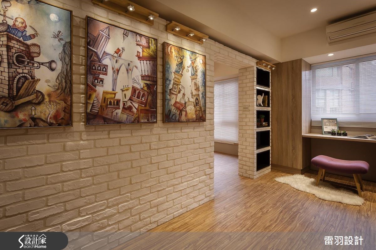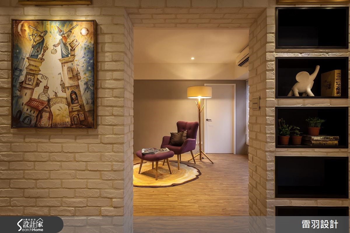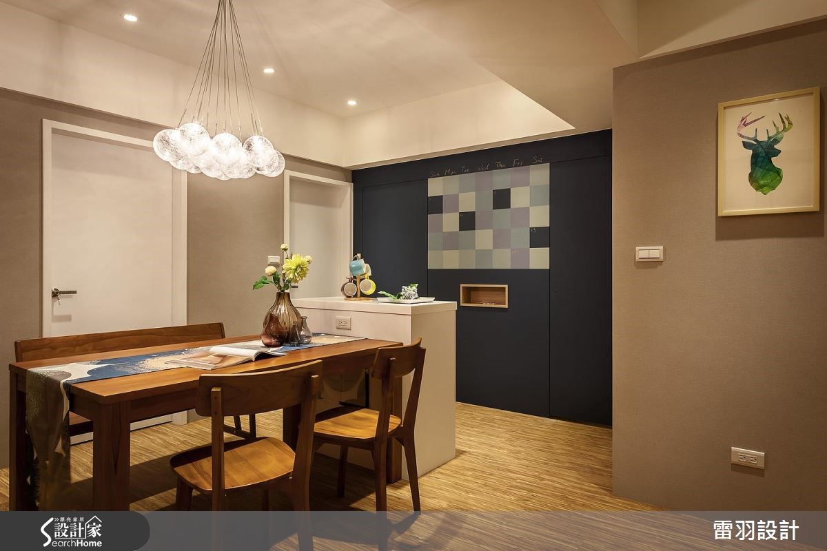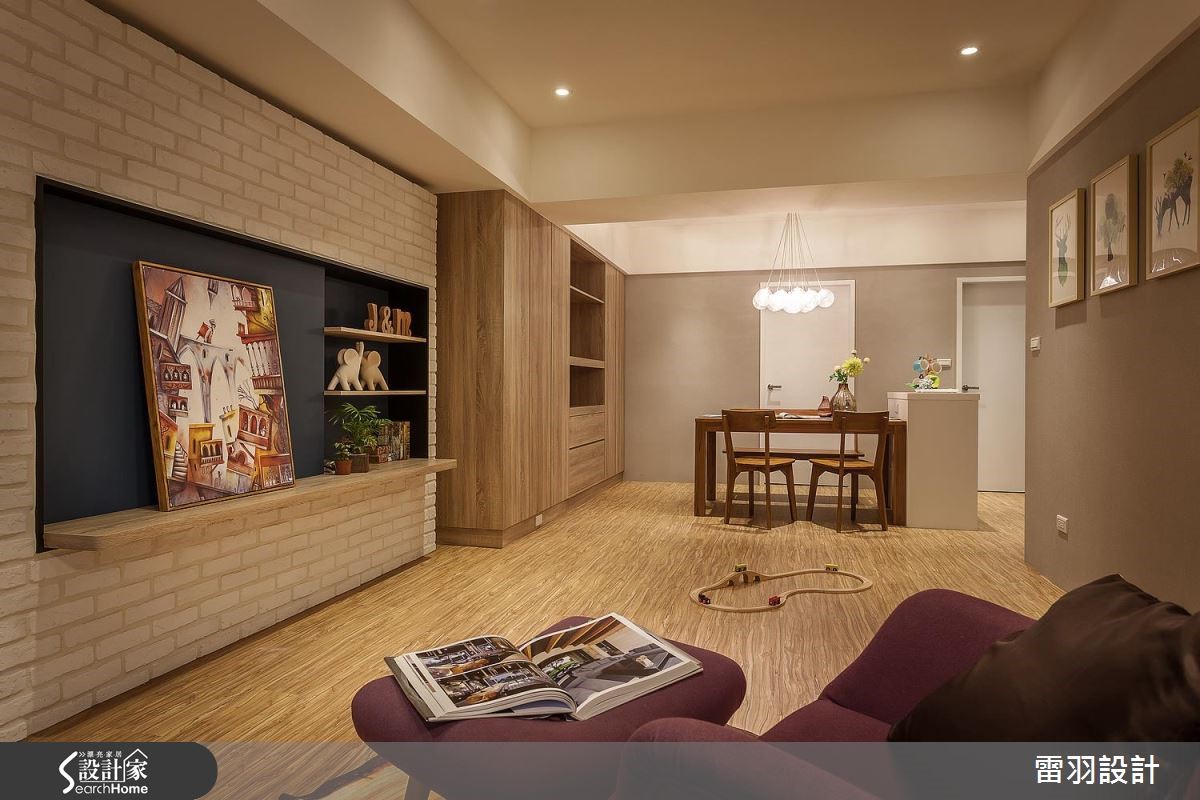 年轻新婚夫妻、刚出生的孩子和家中长辈,家庭成员涵括不同世代的98平方米居宅。除了机能的规划,更希望让家更有温馨感,因此步入室内,设计师以整面文化石墙和木质,作为入门后的视觉印象,洋溢着北欧风的温暖质朴。【色彩和挂画,洋溢活泼北欧味】因为孩子刚出生,年轻的屋主夫妻期待能营造出家的温馨感,在设计沟通时,便提出希望能有一个开放式书房,让全家人都能一起读书、上网。因此设计师调整进门动线,将玄关和书房空间合并,藉此解决景深不足的问题,让空间更显放大。同时开放书房墙面采用文化石铺陈,搭配童趣挂画,塑造休闲的共读氛围。书房两侧留出入口,即转入客、餐厅空间。客厅的沙发主墙运用大地色系铺陈,与深蓝电视墙相对。餐厅延续同样色系,同时涂上黑板漆,搭配格状色块,还能化身生活行事历,提升家人互动频率。至于收纳部分,在主卧室则特别预留婴儿床位置、玩具收纳柜、充足的衣物储藏,以及设置飘窗区。齐备的机能性,方便新婚夫妻照看孩子,而且不必担心打扰到长辈作息。