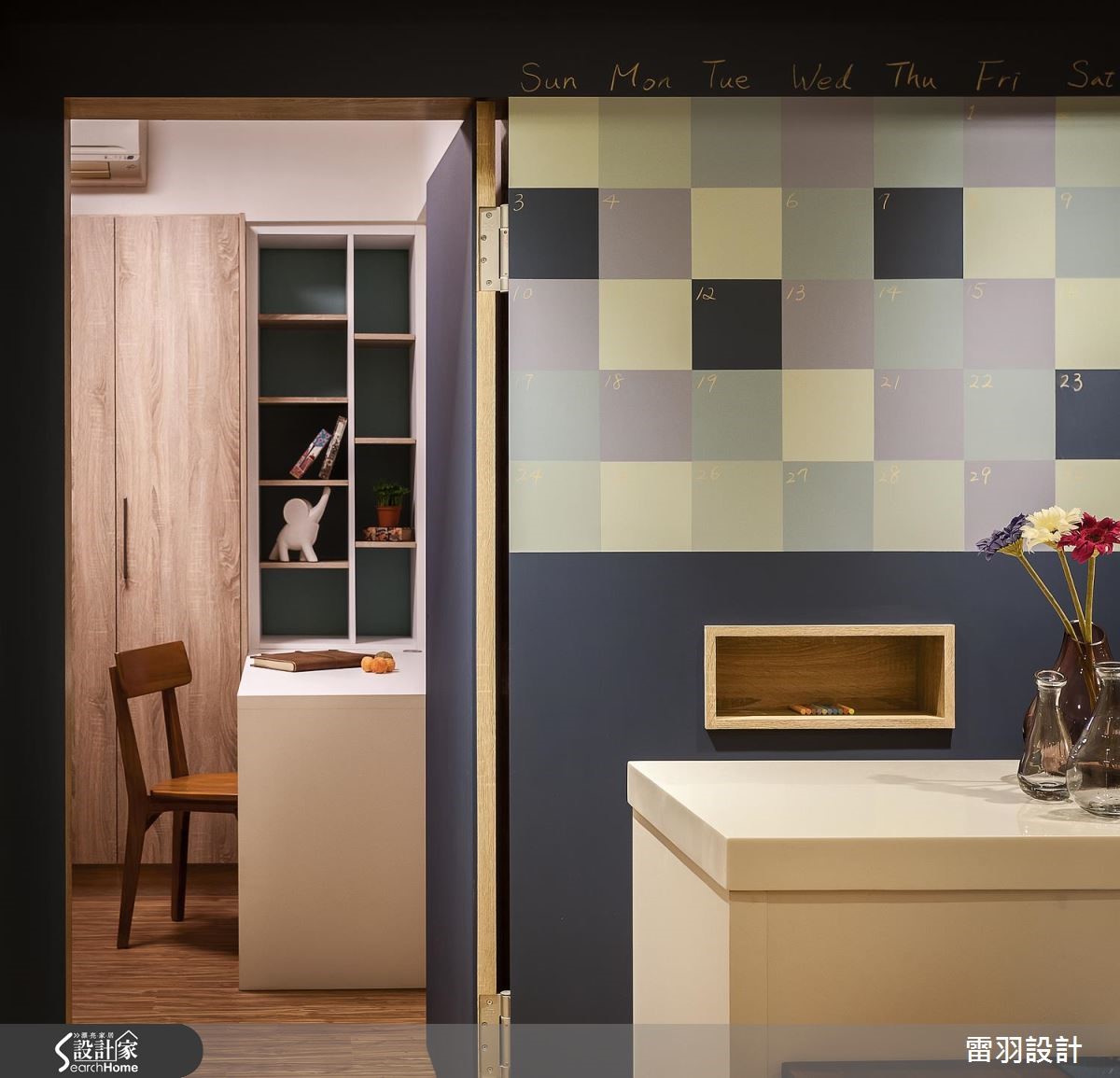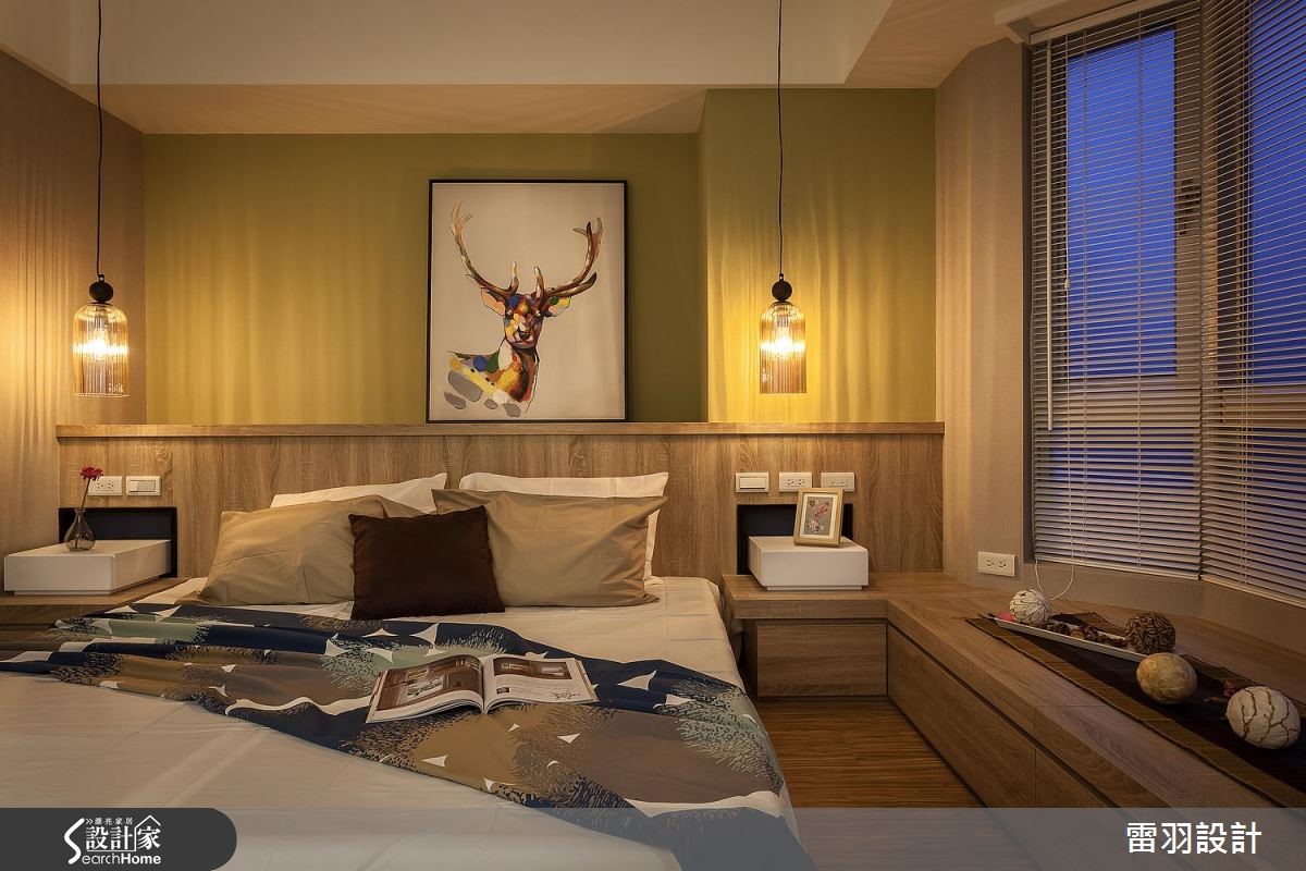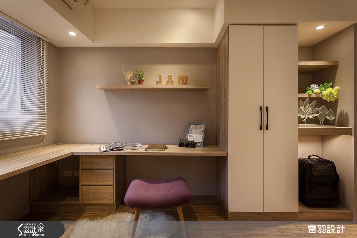 年轻新婚夫妻、刚出生的孩子和家中长辈,家庭成员涵括不同世代的98平方米居宅。除了机能的规划,更希望让家更有温馨感,因此步入室内,设计师以整面文化石墙和木质,作为入门后的视觉印象,洋溢着北欧风的温暖质朴。【色彩和挂画,洋溢活泼北欧味】因为孩子刚出生,年轻的屋主夫妻期待能营造出家的温馨感,在设计沟通时,便提出希望能有一个开放式书房,让全家人都能一起读书、上网。因此设计师调整进门动线,将玄关和书房空间合并,藉此解决景深不足的问题,让空间更显放大。同时开放书房墙面采用文化石铺陈,搭配童趣挂画,塑造休闲的共读氛围。书房两侧留出入口,即转入客、餐厅空间。客厅的沙发主墙运用大地色系铺陈,与深蓝电视墙相对。餐厅延续同样色系,同时涂上黑板漆,搭配格状色块,还能化身生活行事历,提升家人互动频率。至于收纳部分,在主卧室则特别预留婴儿床位置、玩具收纳柜、充足的衣物储藏,以及设置飘窗区。齐备的机能性,方便新婚夫妻照看孩子,而且不必担心打扰到长辈作息。