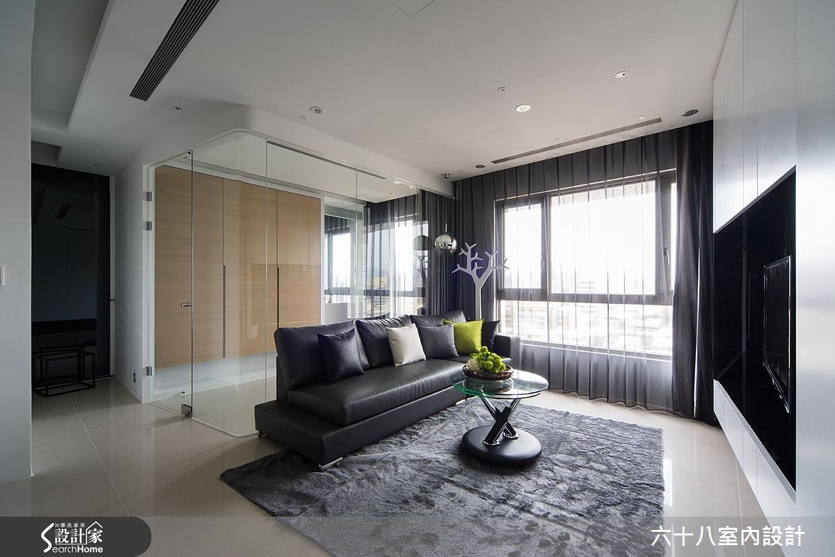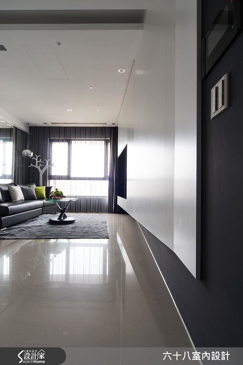 设计师运用立面延伸与通透建材,创造出扩容效果,并给予前卫线条、简约色调,让小居宅也能坐拥大器的现代风韵,卧室、客厅之间配置收纳柜兼隔断墙,以一体两面的设计手法,充分网罗每一吋居家坪效!【清玻璃隔断,维持视野连贯性】设计师运用机能立面串联玄关与电视墙,并整合收纳柜体,藉由些微的角度转折、拉出延伸线条,拓展墙面开阔尺度。再以白色为底,加入合宜比例的黑色调,使画面清爽。而为了保有空间宽敞,书房配置大面积清玻隔断,维持客厅的贯通视野,使采光可流通无阻。餐厨区域则呈开放规划,给予清爽的白色底调,在轻简配置之下,实践实用的生活机能。寝卧保留了窗景优势,于天花做出倾斜设计、丰富线条层次,且融入局部的黑色调,衬托纯粹的净白质地,彰显黑与白的简约魅力。