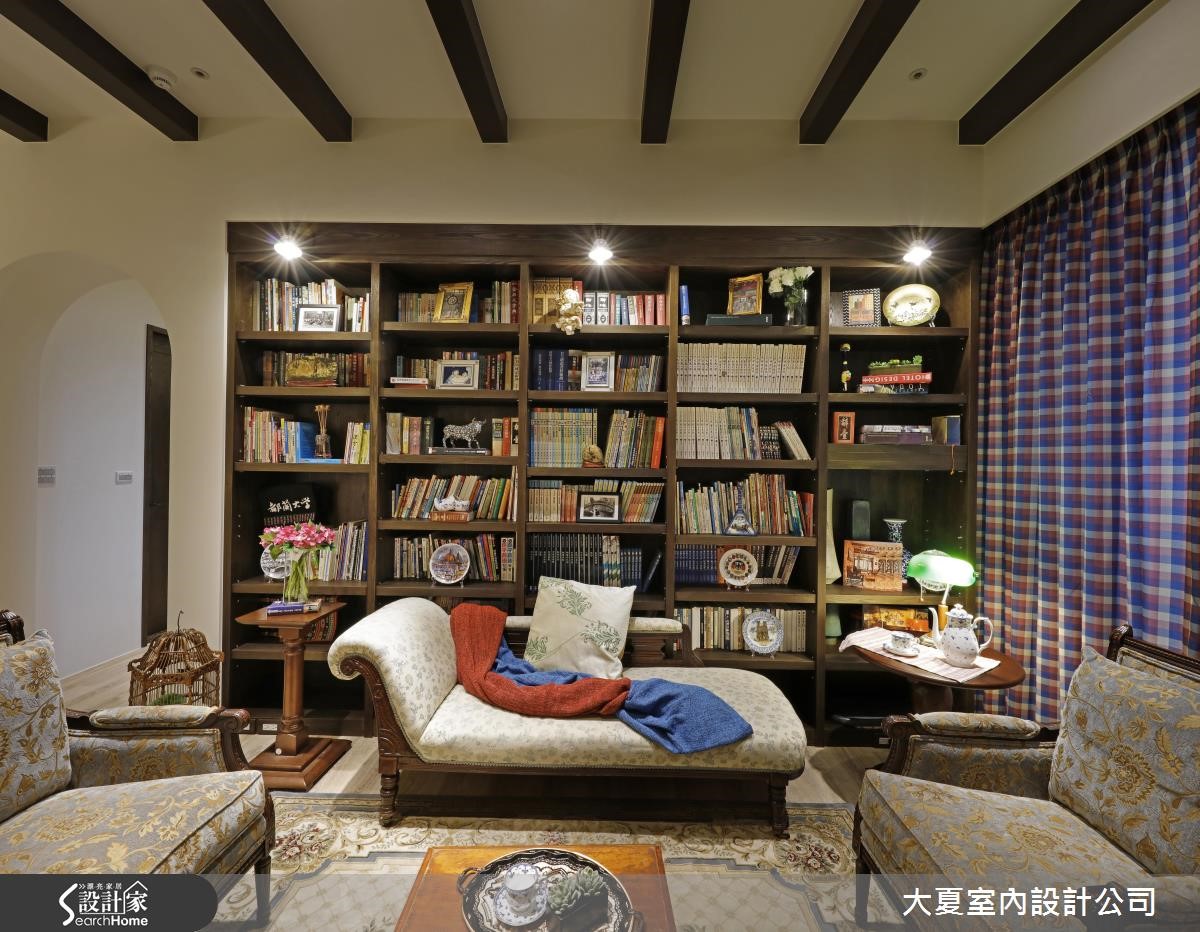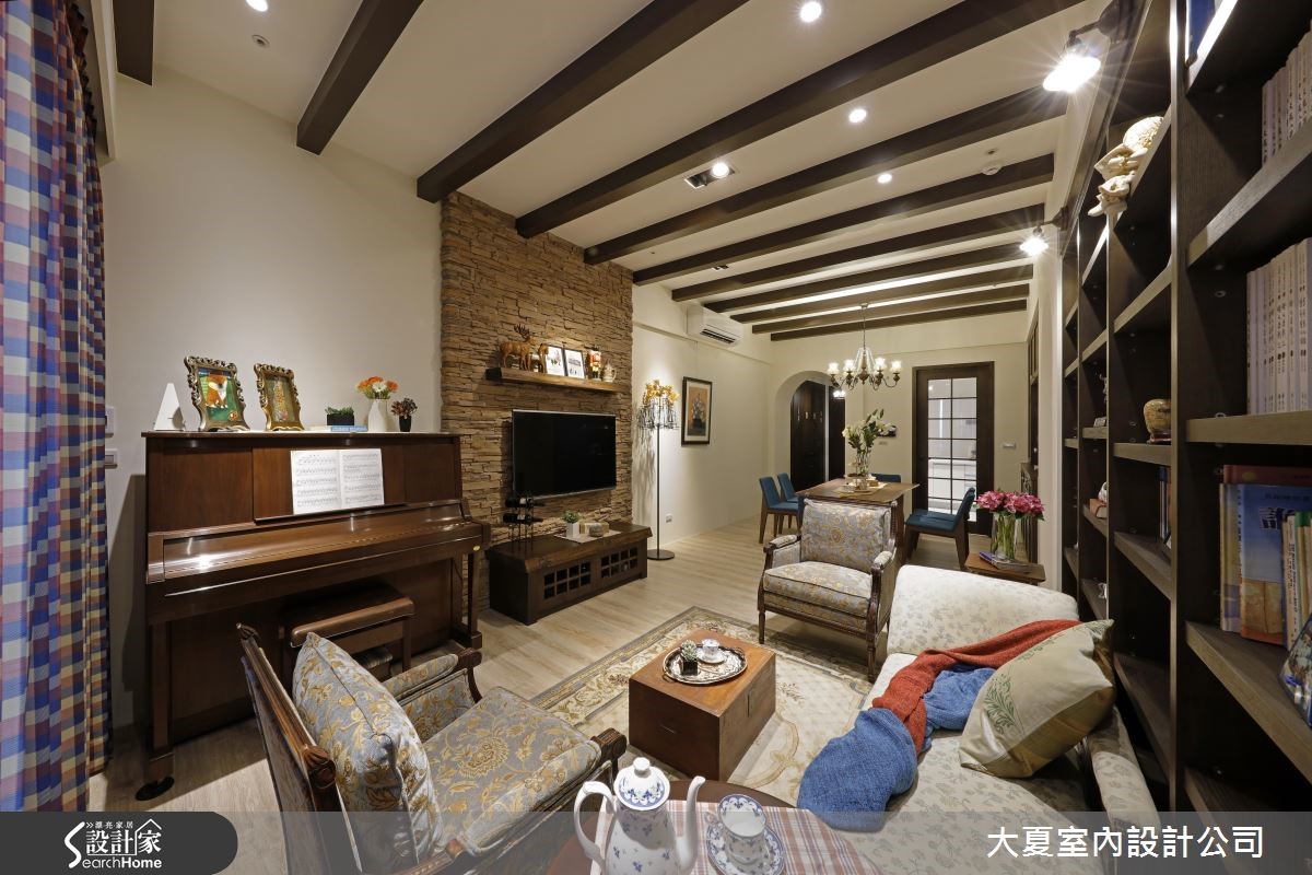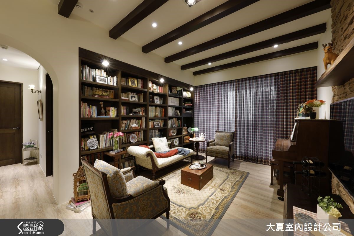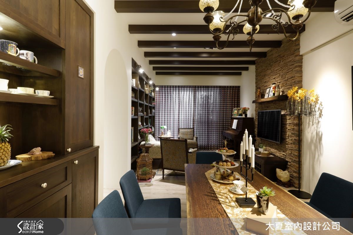 设计师网罗木书架、长型餐桌、悠扬琴声等元素,并运用大量质感家具,营造出纯正的英式乡村风格,体现随兴不失优雅的生活态度,快跟着小编一起走进来看看吧!【运用拱形元素,流泻经典风格】设计师让客餐厅开放相连,于沙发墙规划整座落地书墙,搭配流线优美的古典家具、钢琴摆设等,使空间俨然成为浓厚英国风的小型图书室。天花则加入规律的木作格栅,走廊入口皆采用拱门元素,注入古典气息。以石材砌筑的电视墙,作为客餐厅的分界,餐厅墙面加入柜体规划,不仅满足收纳机能,更做出局部开放置物台面,整合餐柜与展示功能。并选用具有实木质感的餐桌椅,以带有现代感的浅蓝色彩调合木色,注入宁静雅致的用餐情境。