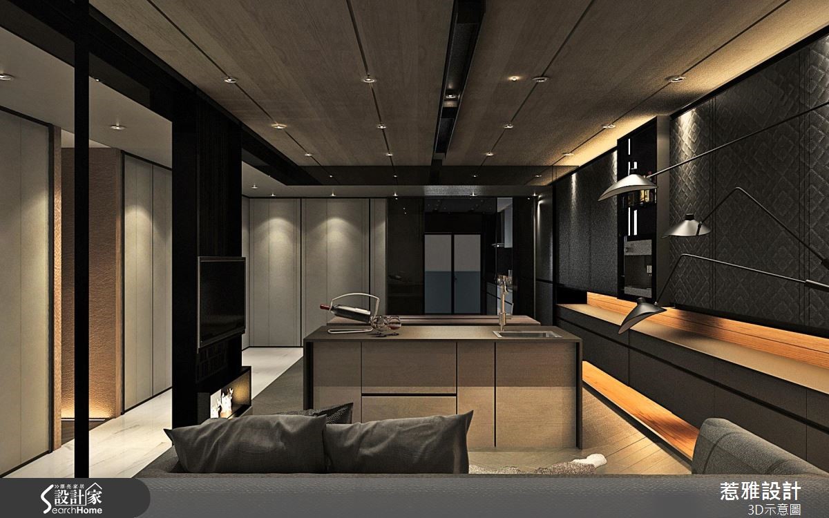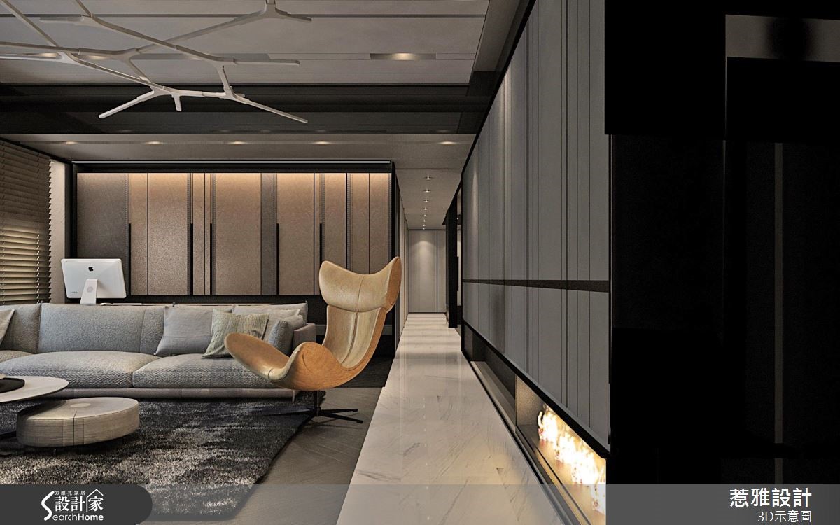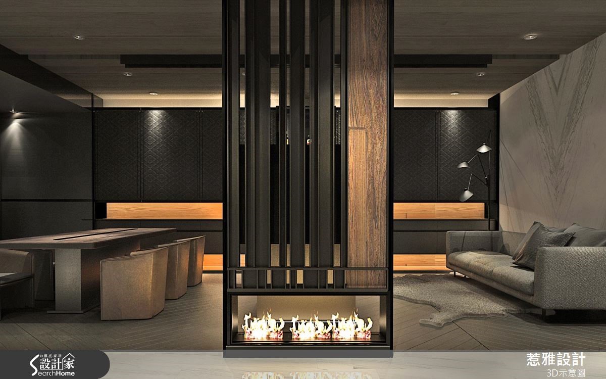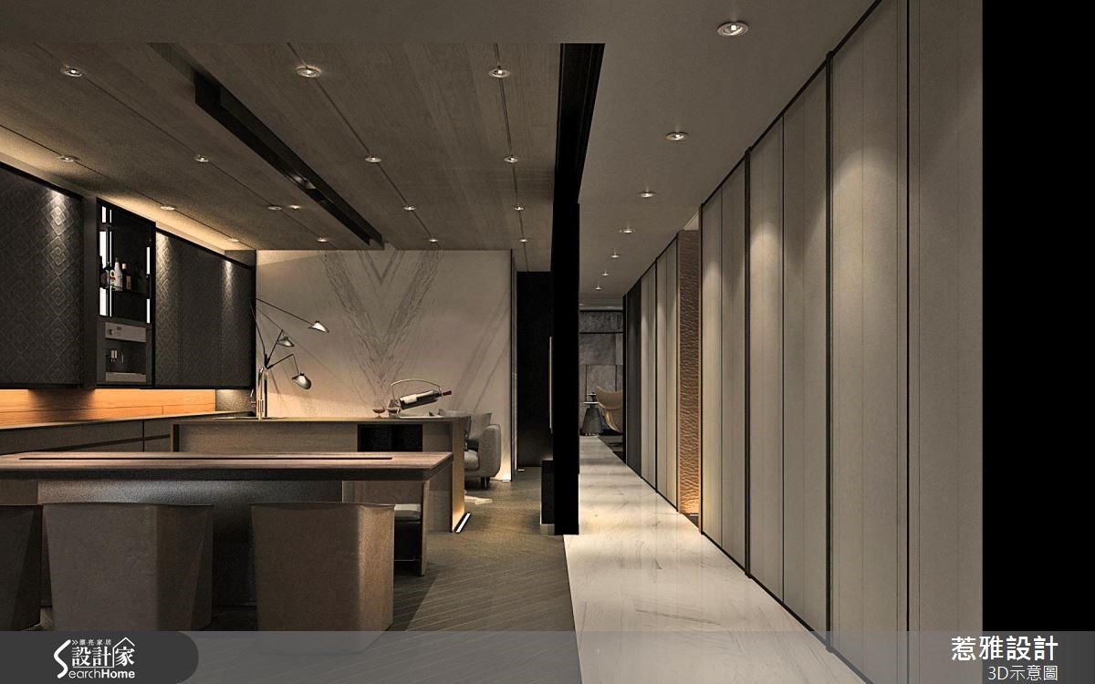 314平方米豪邸,透过镜面、黑铁、钛金属等材质,为从事金融业的屋主,打造低调奢华居家,不仅兼顾机能,也注重质感的堆砌,定制属于居住者的精致品味。【沉稳理性线条,引注雅痞气质】步入这处精品宅邸,神秘、沉稳的色调,以及充满秩序性的线条,勾勒出都会雅痞所钟爱的居家轮廓,客厅运用切割和半悬空的造型,展现粗犷原石的视觉张力,后方留有开放式书房,在色彩、灯光和线条的建构下,让空间气质更显知性优雅。【多功能吧台,小酌餐饮皆宜】长型廊道纵向串联动线,并在餐厨区纳入中岛吧台、电视墙和舒适的沙发,适合小酌聚会或是日常休闲,在家中就能尽情品味生活。私领域的规划媲美精品酒店,包含更衣室及卫浴等机能,利用大理石材、沉稳木质,调制时尚风采。