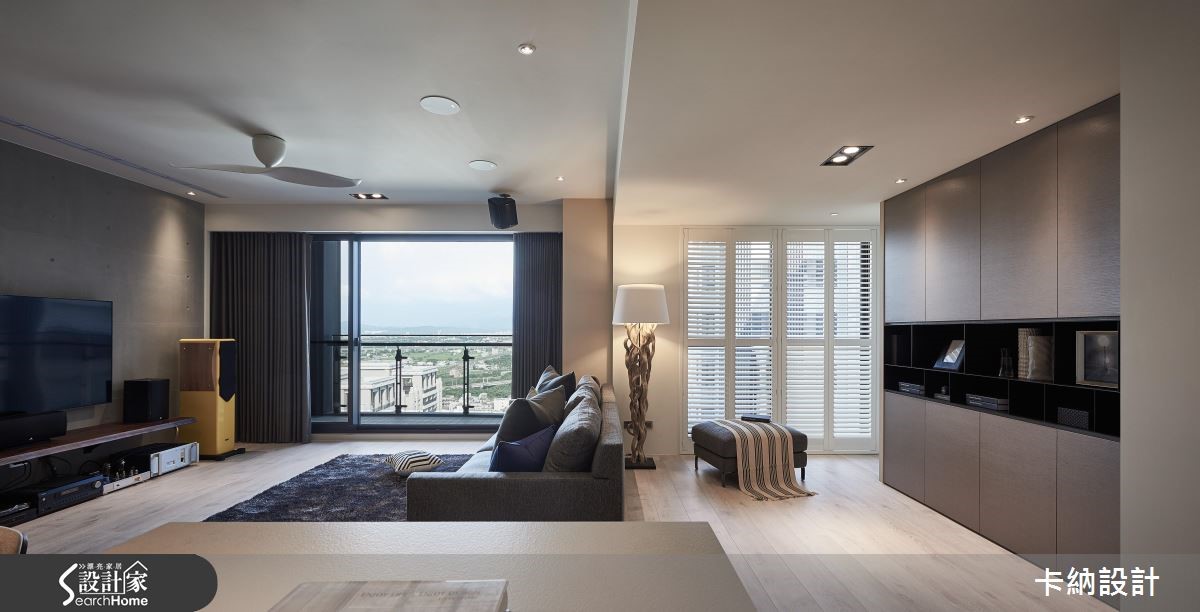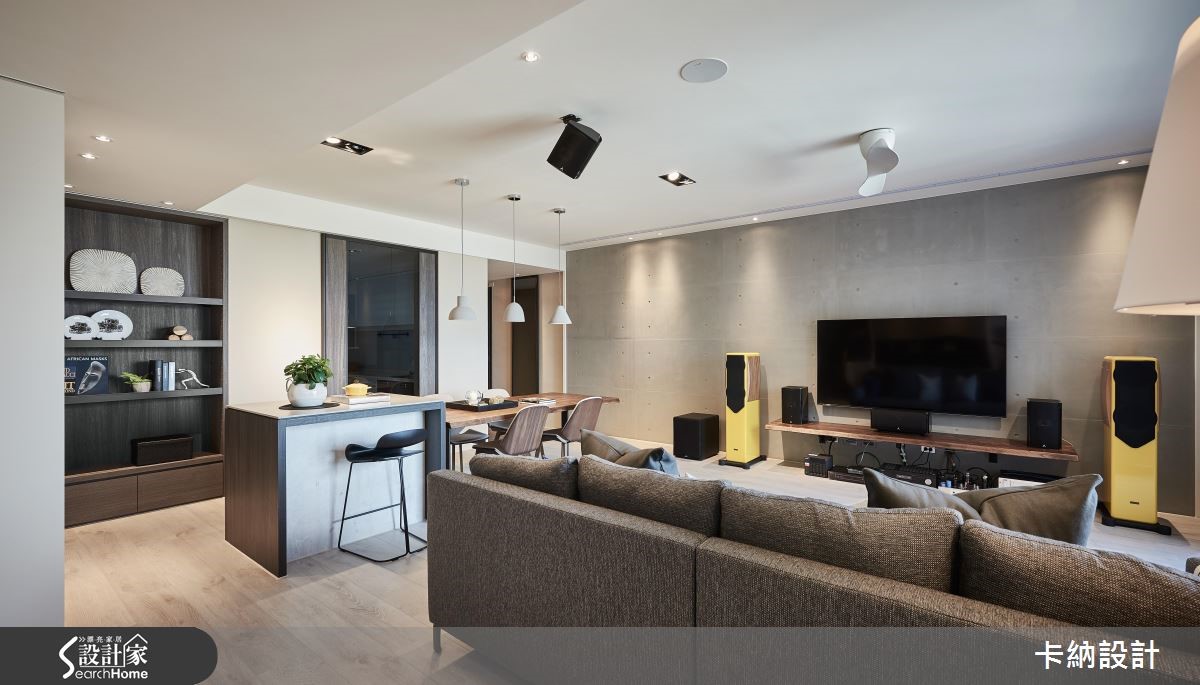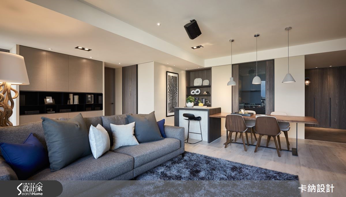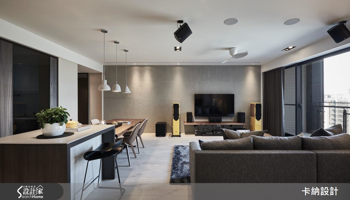 99平方米的两人世界,设计师考虑到屋主视听设备较多,于是加入充裕实用的收纳机能,格局稍做微调,展现生活空间的深度与广度,打造出宽阔明亮的现代好宅,快跟着小编一起走进来看看吧! 【明亮采光 以自然材质柔和情境】走进空间,可见仿清水模建材建构而成的电视主墙,恰好呼应沙发与地毯的灰阶,衬着窗外明亮日光,映出自然和谐的生活画面,并在稳重基调之中,透过音响、抱枕点缀鲜明色调,带出几许活泼意趣。同时,利用开放式格局,让客厅、餐厅形成一体,造就宽敞视感,使中岛与木质餐桌连结延伸,于墙面挂上斑马纹画作,构成亮丽背景。一旁配置木纹展示柜体,与木框灰玻厨房门片、玄关空间相映成趣,运用虚实框景的排列,完美切分整道立面。卧室床头铺陈灰色质感墙纸,对应柜面的深色木皮,营造让人心绪沉淀的沉稳韵致。墙边一角则配置桌椅,打造成开放小书房,让人可在房间内上网或处理公事,充实私领域的生活机能。