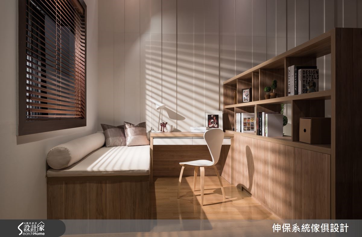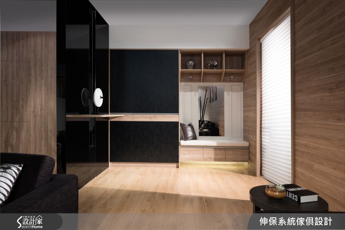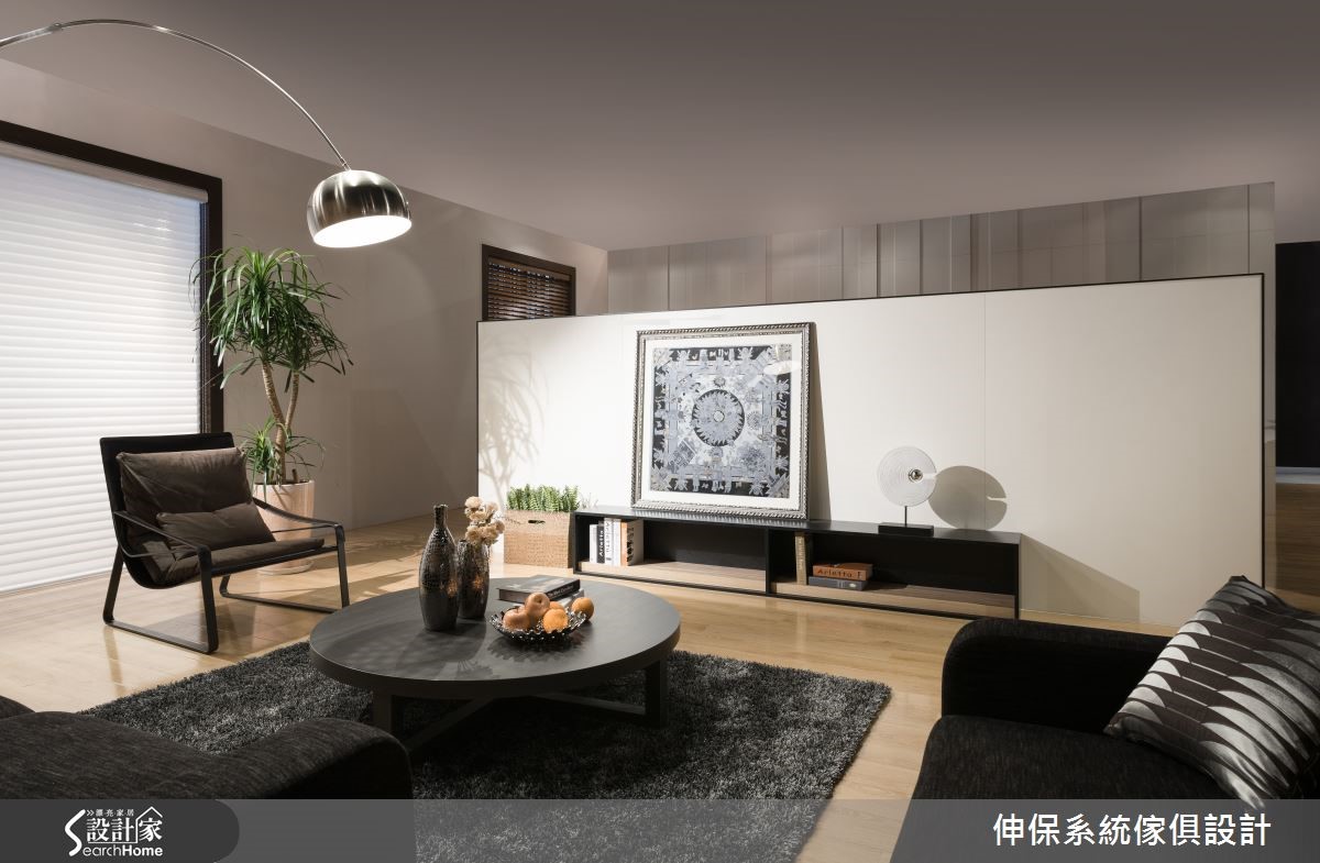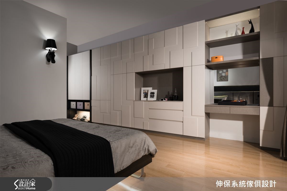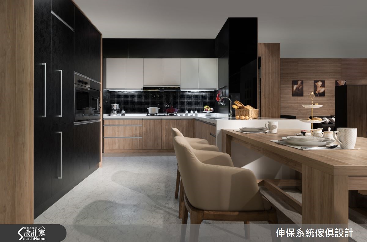 设计师以独到美学概念植入居所,兼顾空间机能与设计细节,让系统柜的可应用性无限增大。再透过混搭风的设计,成就198平方米居所的美好蓝图,成功迎合屋主的期待。【收纳柜兼具区分空间,机能满载】穿鞋柜加入耐重的五金挂衣钩,配置落地鞋柜,满足衣物、鞋子的收纳需求,并置入穿衣镜便利整装仪容,落实机能与美感。开放客餐厅以半高电视墙做出分界,且双面皆可收纳,扩增机能。餐厨将中岛台面与餐桌相互延伸,侧边配置整面嵌入式电器柜,透过黑色、轻盈木质的完美分布,让柜体轻盈不厚重。餐厅一角则做了精实利用,打造开放书柜,并陈列书桌椅与飘窗,成为备菜烹调之余,研读食谱或小憩片刻的秘密基地。卧室做出大面积电视墙,内部植入衣柜功能,利用系统板材厚薄的高低差,营造立体墙面表情。床头主墙则给予异材质拼凑,带出色调与纹理差异,搭衬具质感的家饰妆点,建构高品味的氛围。