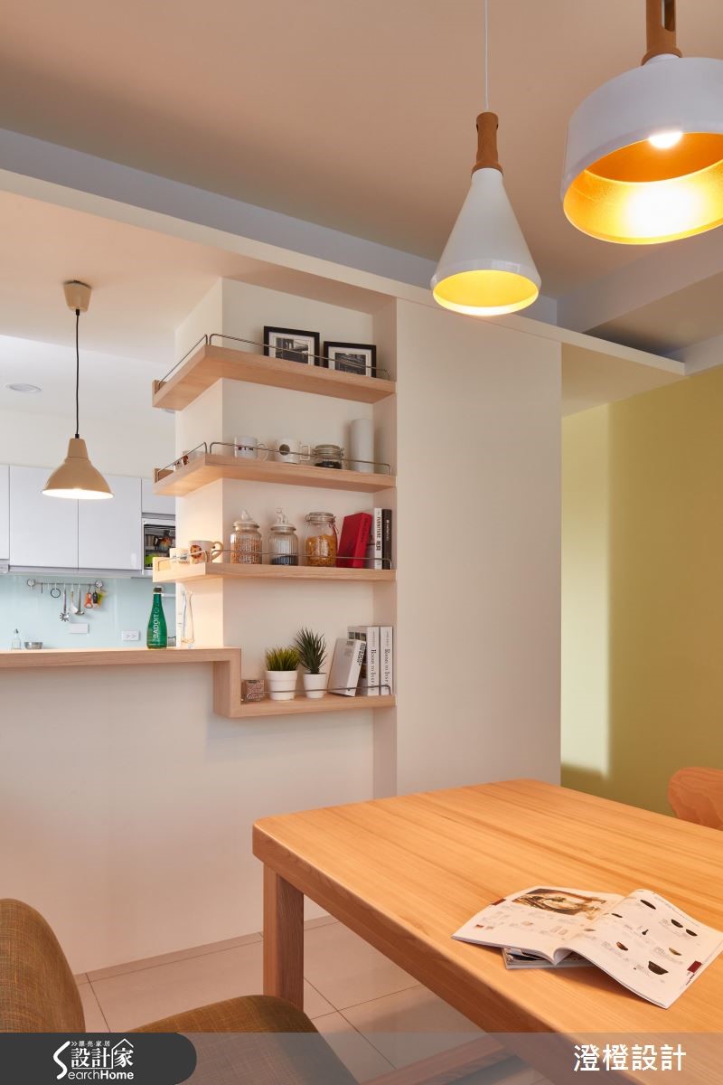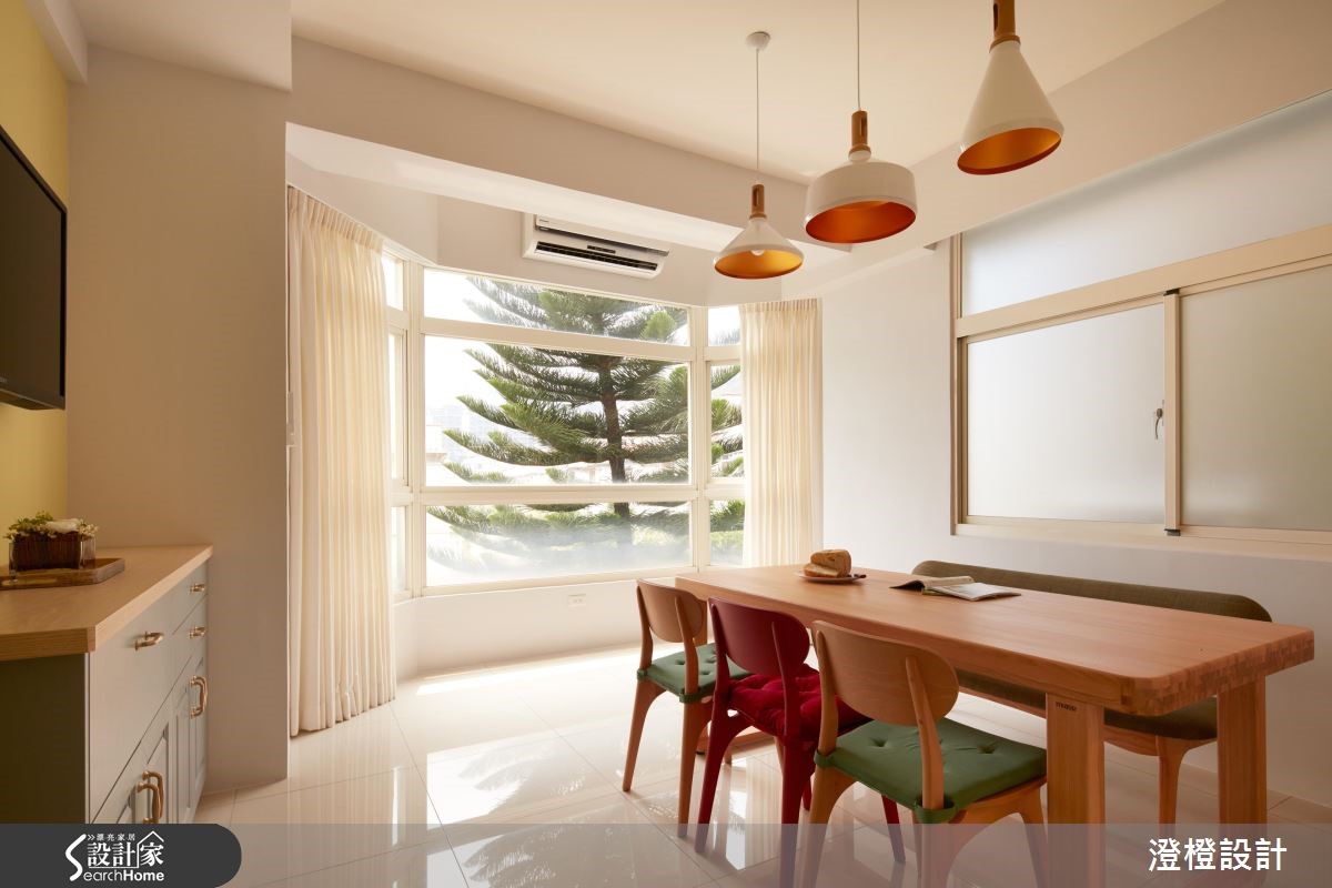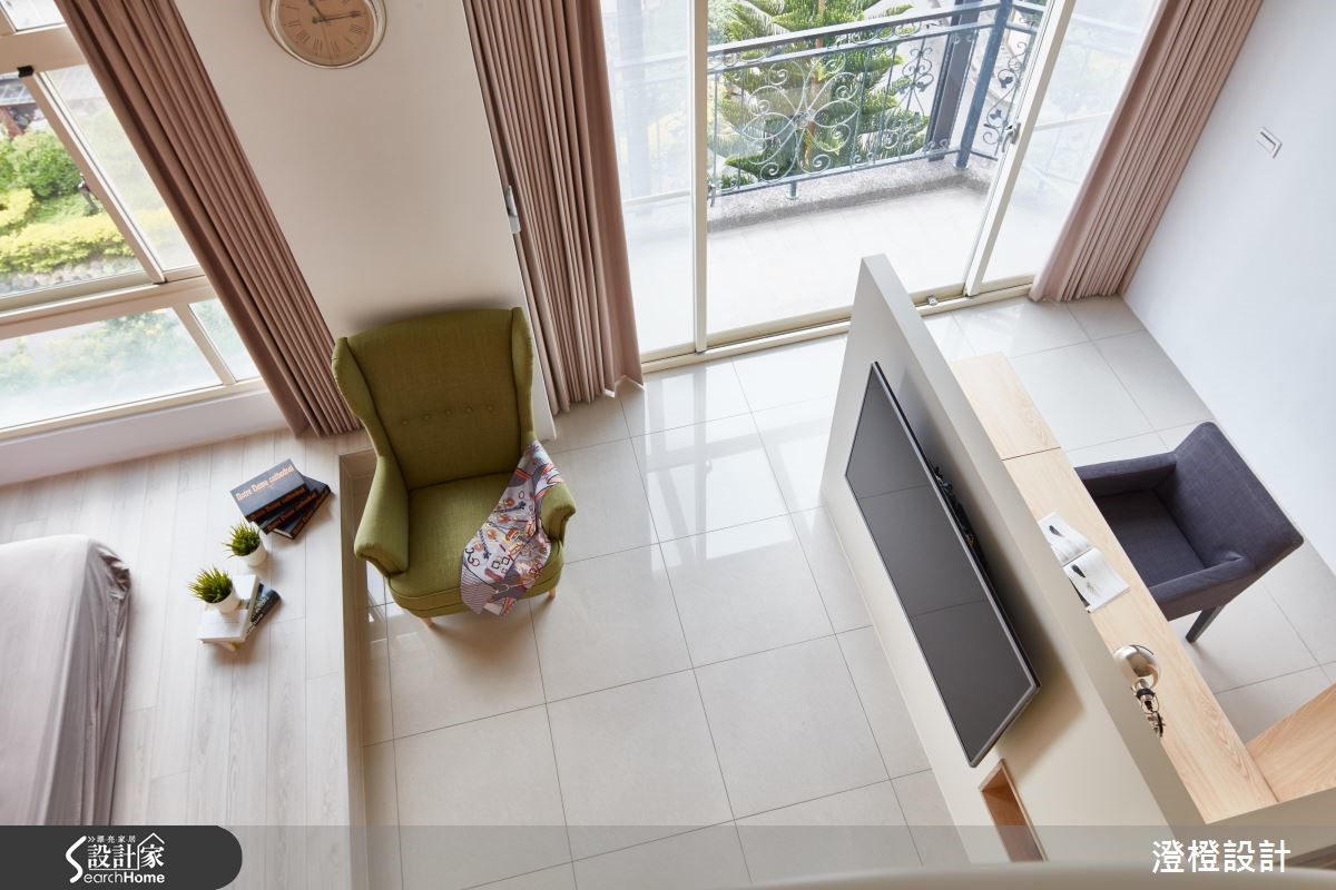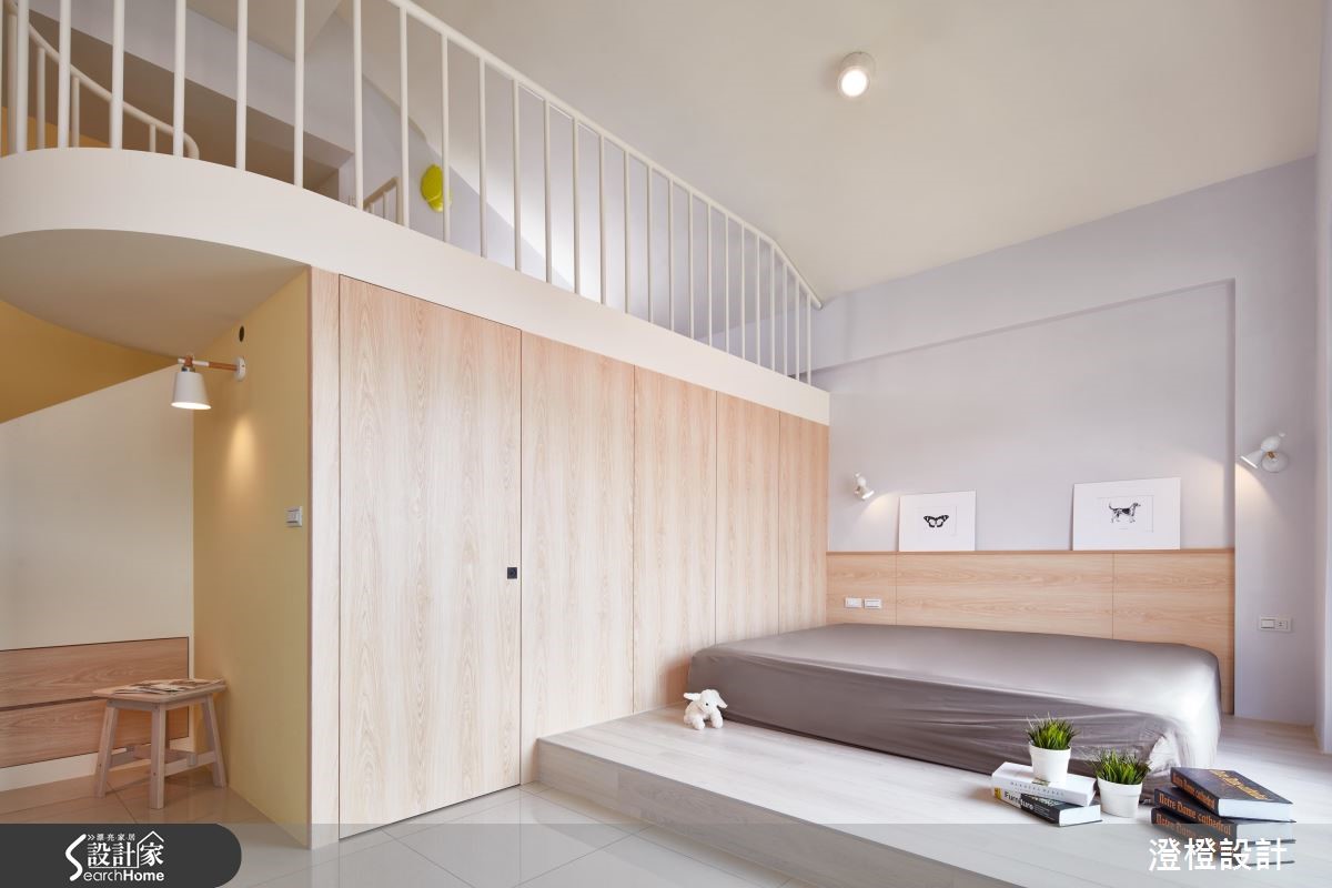四层楼的别墅,设计师透过窗景导入美好山景,并挹注缤纷色彩,让室内、户外都满载生命力,替家中孩子带入森林乐园般的美好想象。【创造居家游乐场的美好生活】空间大量采用环保板材、无毒低甲醛涂料,地坪则铺陈进口超耐磨地板,让空间除了具备家的意义之外,还多了游乐场的童趣意义。柜体则取用钢刷橡木皮包覆,并在柜体、桌体边缘给予45度安全导角,兼具生活的安全性。 餐厨区以白色为底,揉入橄榄绿墙面与鲸灰色柜体,瞬间点亮场域,搭配恰如其份的家具陈列,传递有温度的视觉观感。主卧以柔和淡紫色做铺陈,挹注舒眠氛围,并凭着空间挑高优势,规划跃层作为女儿的专属游戏区,让亲子可在卧房内保有良好的亲密互动。