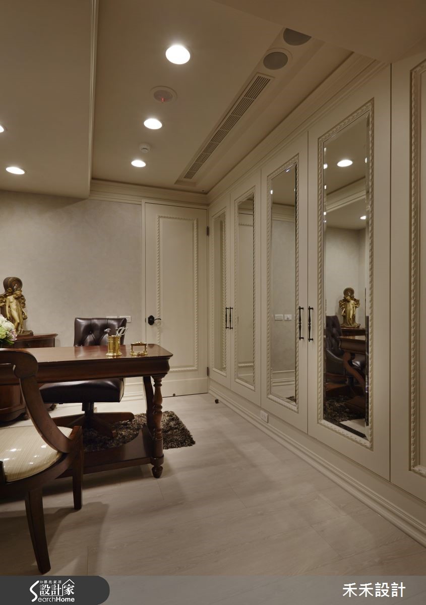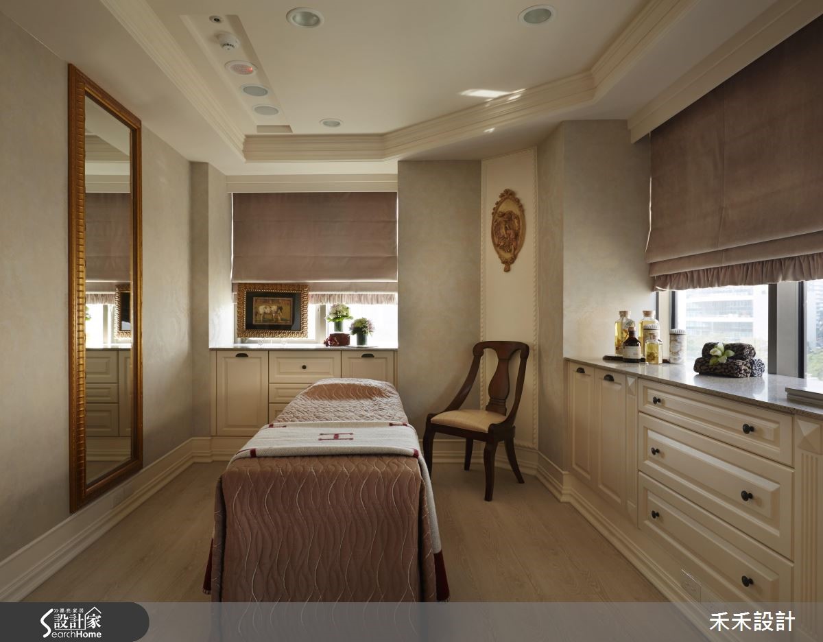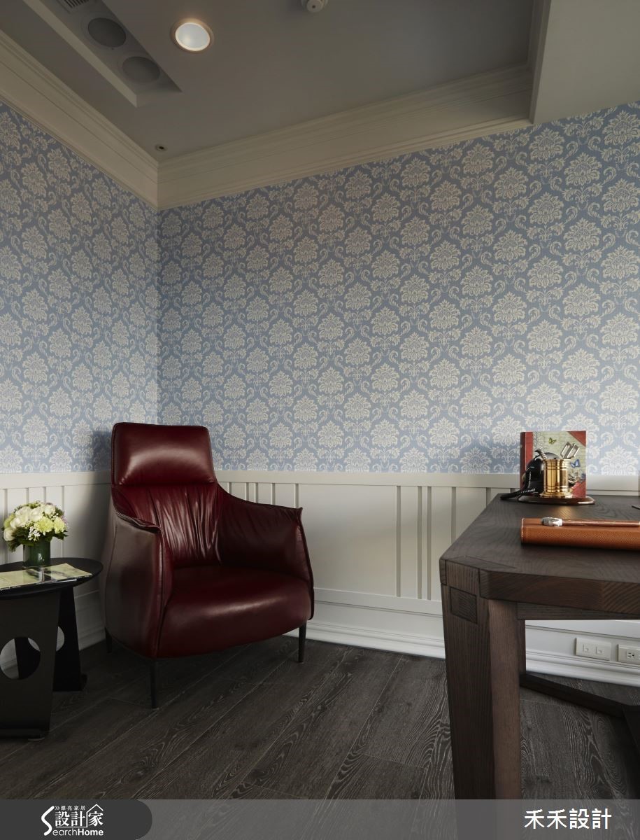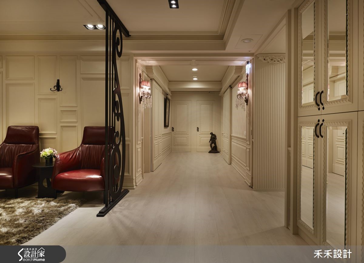 有别于一般医院诊所的冰冷感,设计师将老屋重新改造,变身成为古典风医美诊所,以线板、壁炉、家饰等多种材质交互运用,让空间兼具柔美与质感,打造出亮而不艳的雍容美感。【纳入线板和镜面,烘托轻奢氛围】跳脱一般医美诊所的氛围,整体环境融入细腻的线板,并规划壁炉体现美式氛围。搭配红色皮椅,烘托整体华丽氛围。同时,加入镜面材质或雕花屏风,摆脱立面在视觉上的压迫感,创造行云流水的流畅动线。咨询诊间采以蓝色墙纸,与柜体、壁板铺陈轻柔的背景,地坪则选用深色木地板营造稳重感,并导引窗景增加采光,创造令人安心的问诊情境。诊疗间规划柔和灯光,搭配典雅的柜体和墙纸,无形提升诊疗质量。