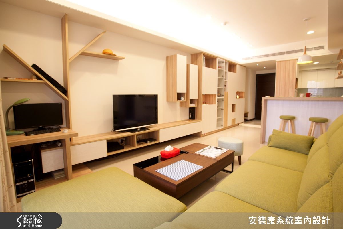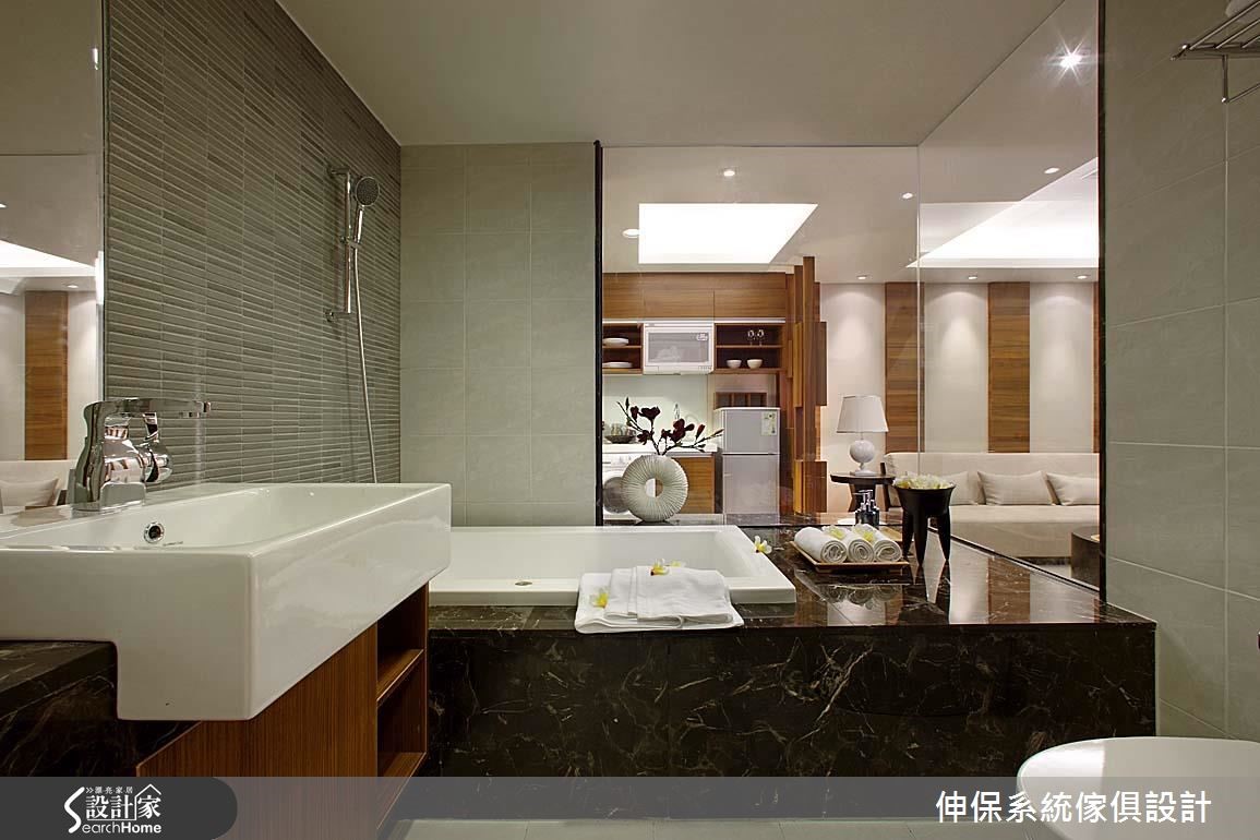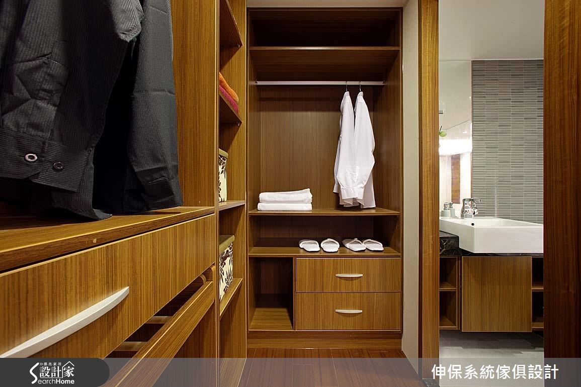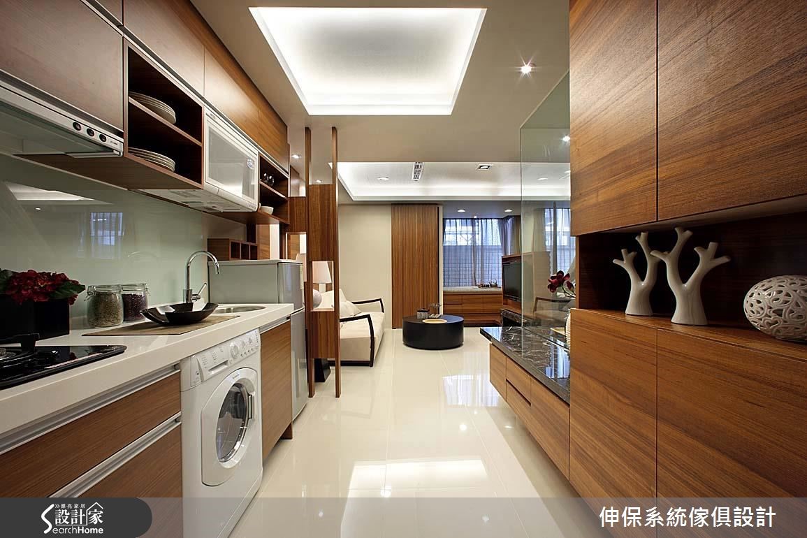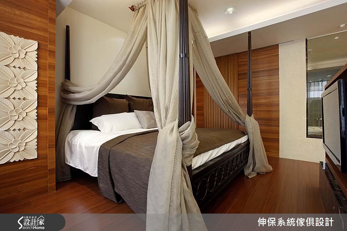 系统板材对于设计团队来说,早已不仅仅是应用在柜体、厨具等机能性领域,更能以精致、拟真的材质,打造各式足以媲美木作的造型。而这间56平的小户型,屋主本身希望回到家就能放松,因此巧妙融入巴厘岛的风情打造度假氛围。【镂空隔屏助攻,造开放视野】针对单身女屋主的浪漫需求,设计师使用仿柚木系统板材搭配抿石子元素,营造放松氛围。将收纳柜体与一字型厨房分别设于玄关走道两旁,以系统板材打造的镂空隔屏为界,向内延伸为全开放设计。空间中央则设置可180度旋转的电视墙,巧妙划分客厅与卧房。设计师利用系统板材施工快速、健康环保的优点,为屋主规划线条利落、机能性十足的更衣室,同时应用在飘窗,让屋主享有独处天地之余,更获得良好收纳机能。卧房摆上一张有着帐幔的四柱大床,加上南洋国家常看见的栀子花造型,为舒眠空间营造villa般的地道飨宴。
