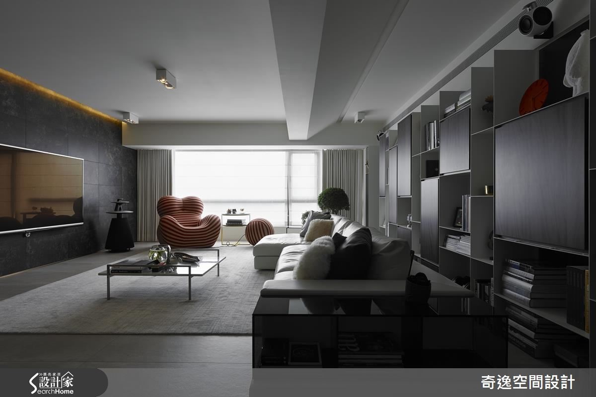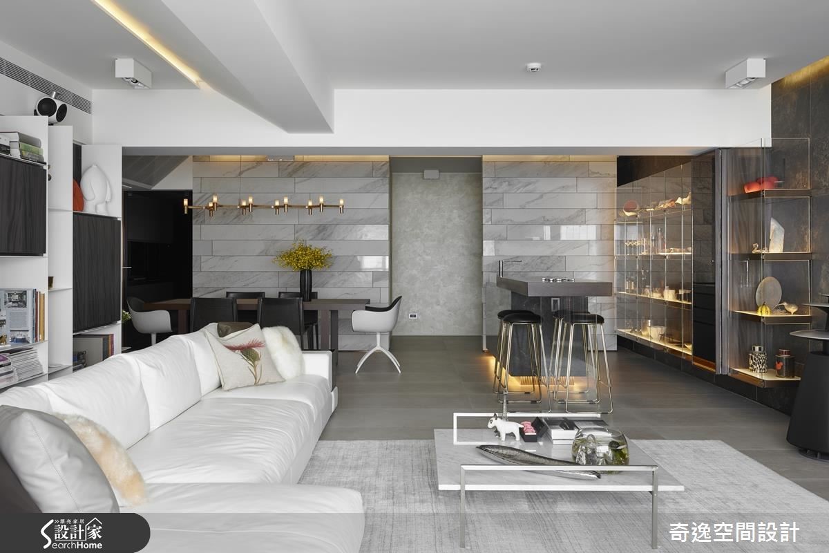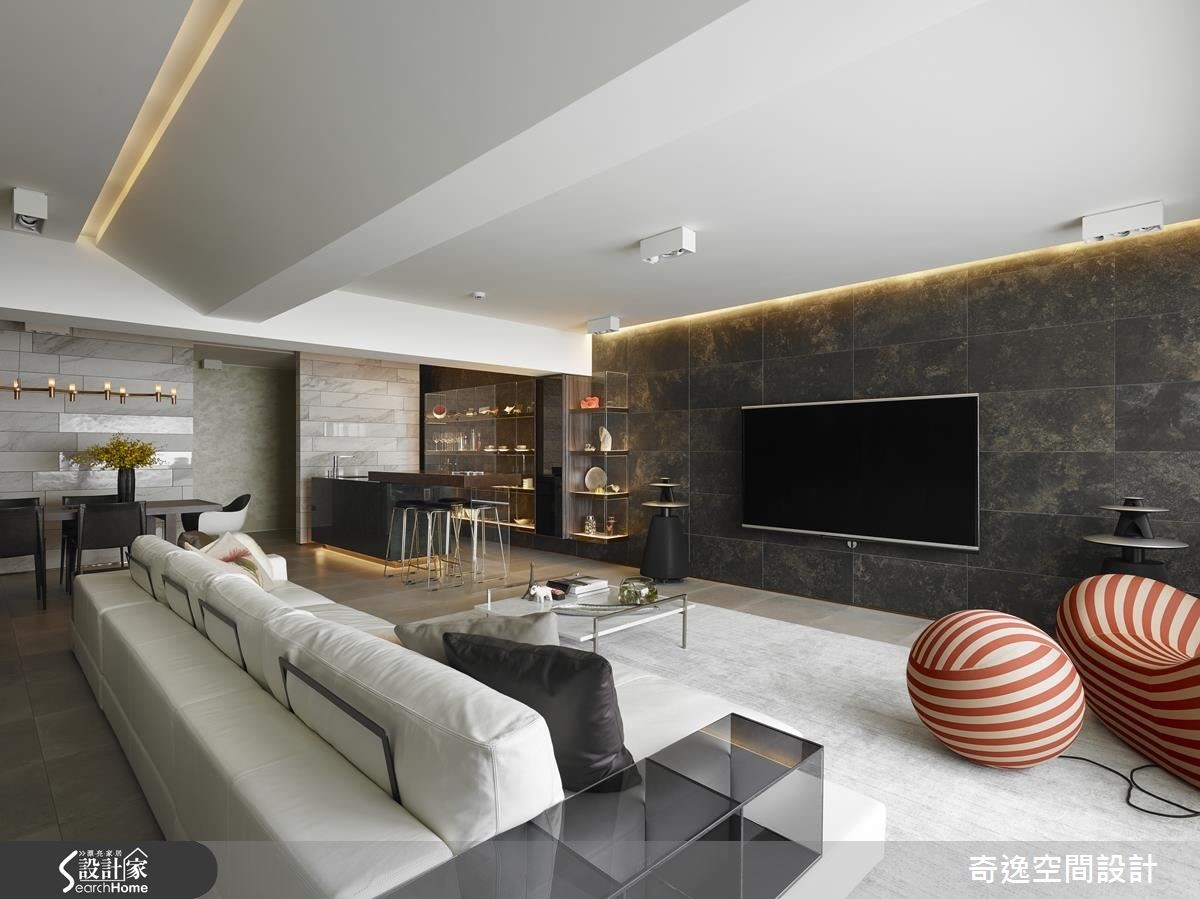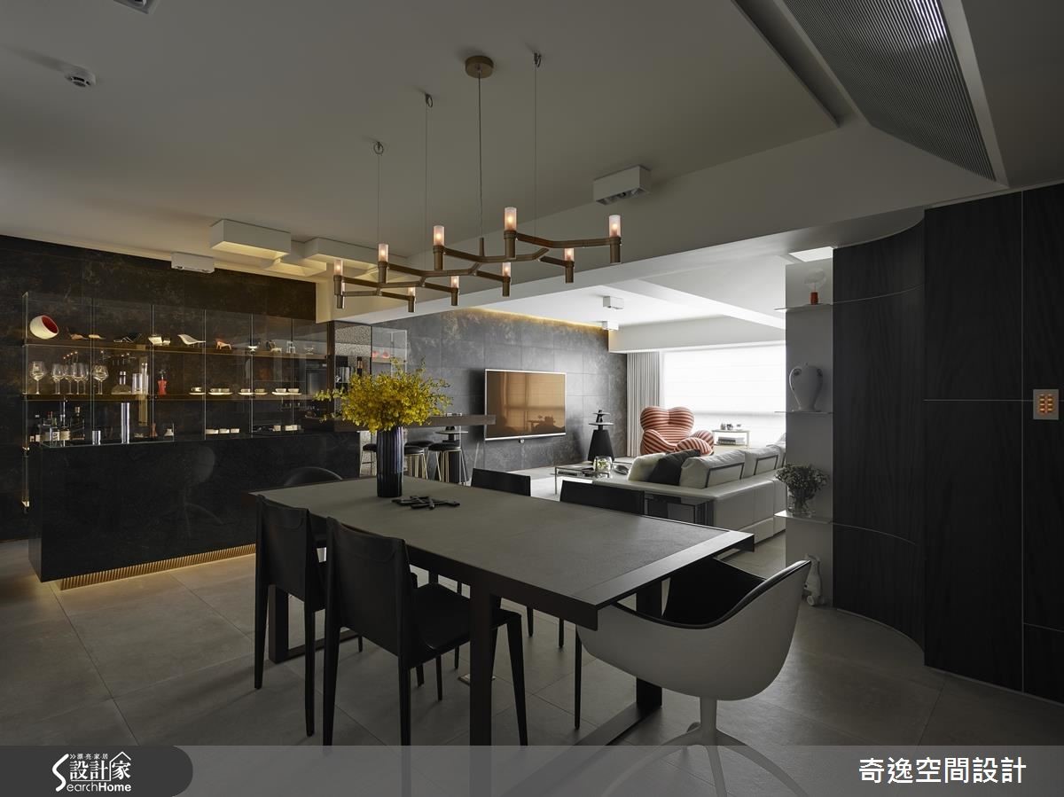 有着30年历史的145平方米居家,有着楼高过低、梁柱横亘等老屋常见问题,设计师重新布局公领域动线,采用简约的天花设计避开梁柱,为屋主一家打造宛如豪宅的时尚气势。【L型公领域凸显采光与窗景优势】设计师采”隐恶扬善“手法,成功化解老屋缺点并放大既有优势:先处理楼高问题,设计师舍弃封板施作,保留天花原始高度;针对无法封板而显现的大梁,则在天花采用斜面设计,化解巨大的压迫感。为了完整凸显屋案既有的采光与窗景优势,设计师将客厅180度转向,形成L型公领域安排,成功将户外充沛的绿意延揽入室。在拓增室内空间方面,利用12米的金属砖电视墙打造延伸效果,与后方以绍皮纹木皮结合金属框架的沙发背墙相互呼应。