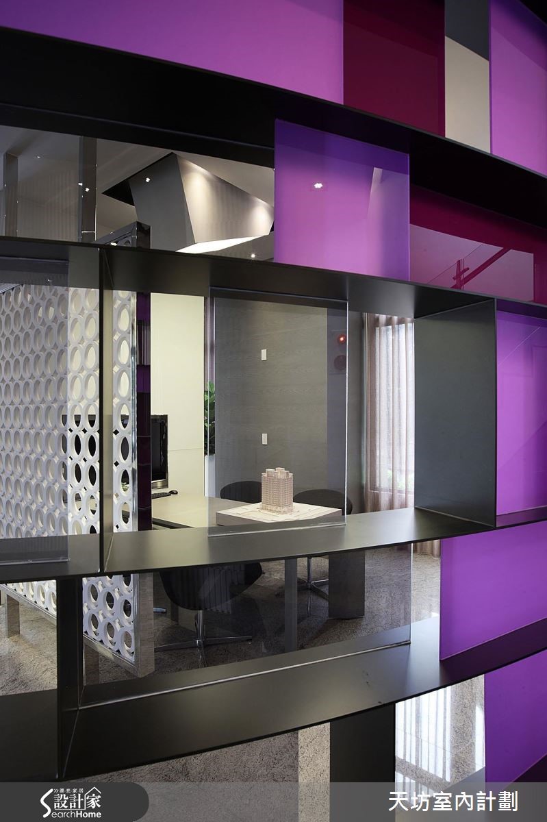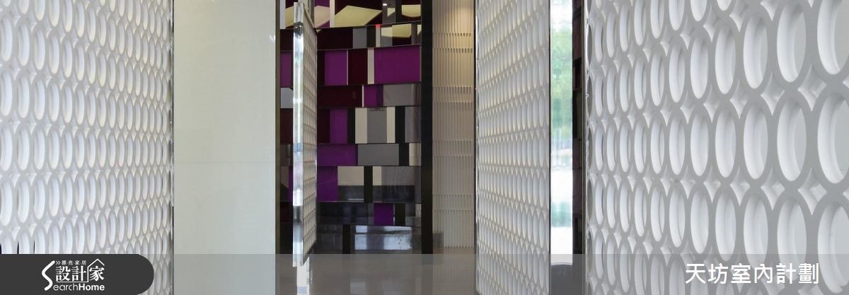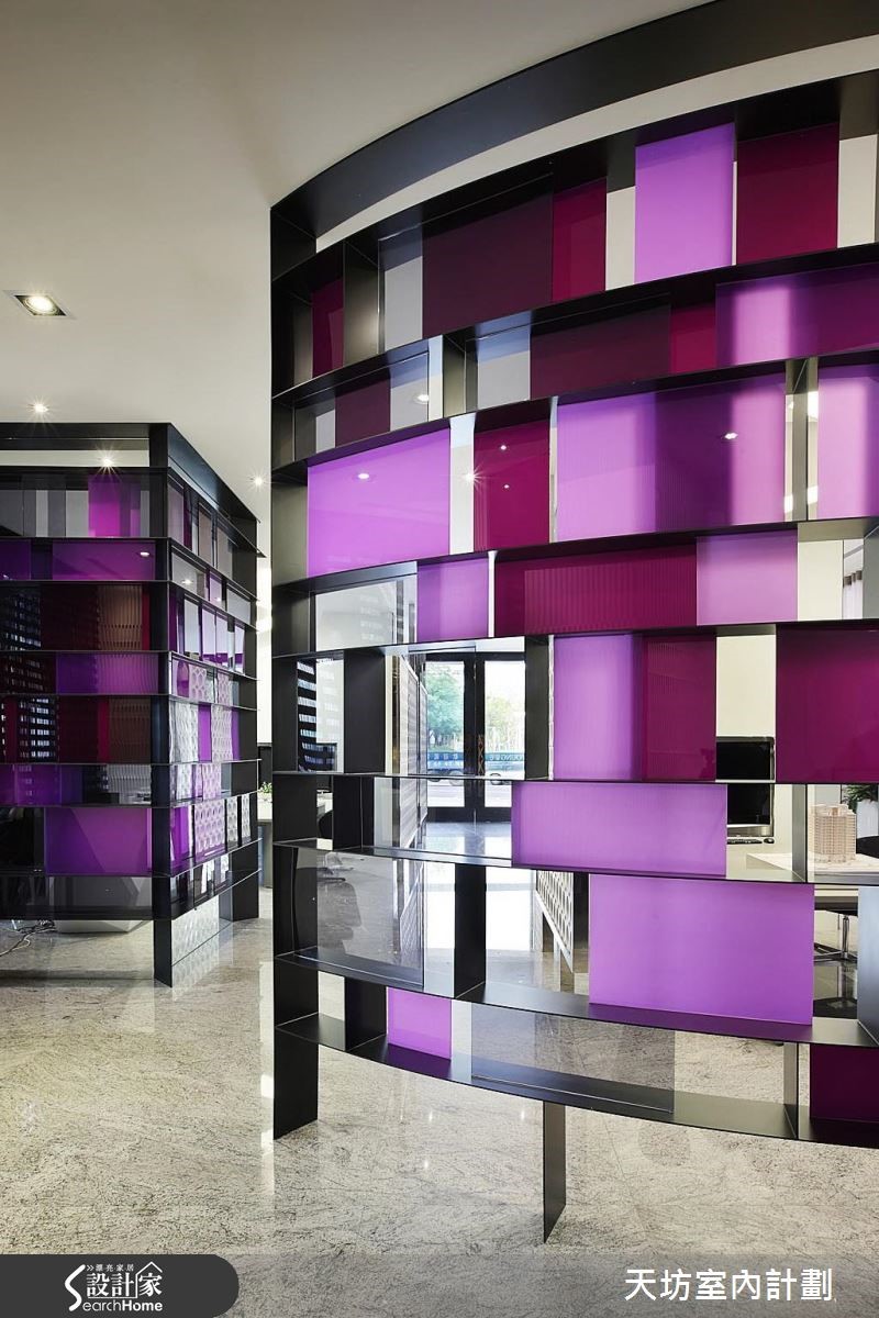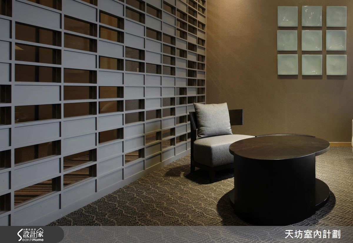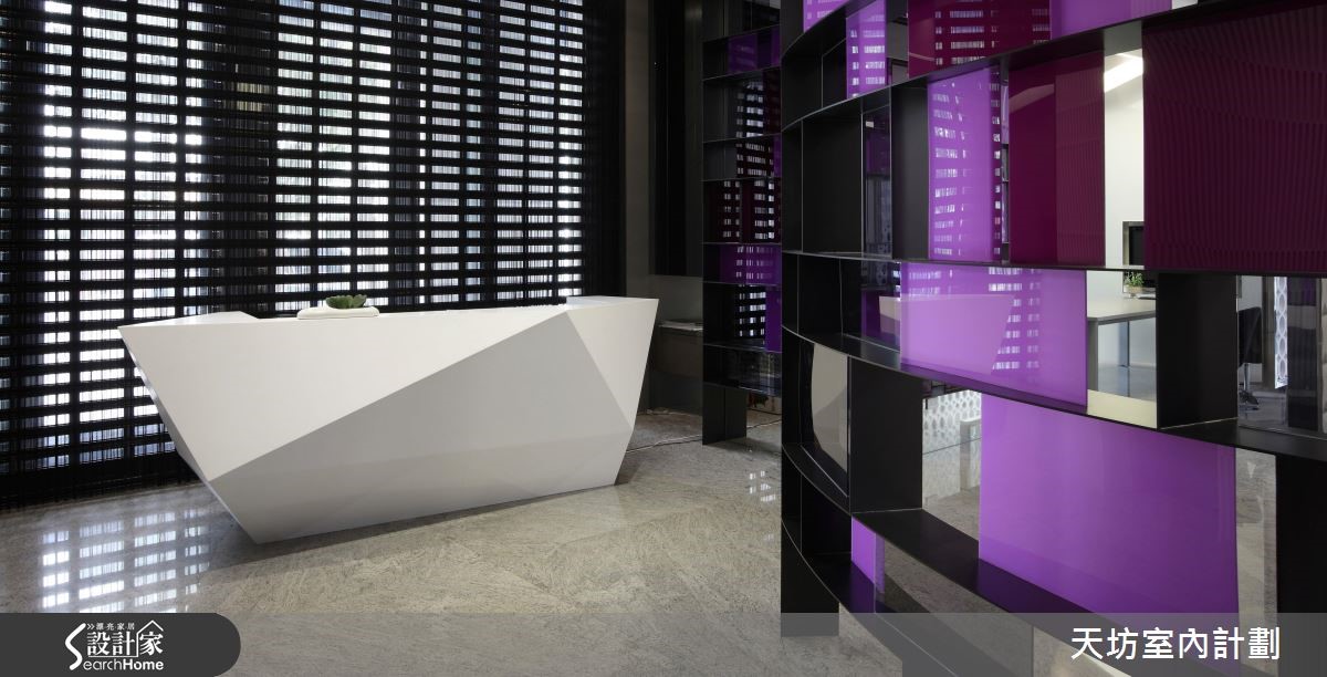 本案为接待中心,强调"透明性" (transparency) 的概念,在现代几何线条的数组下,透过材质的通透质感与环境的透光特色,共构和谐美感。柜台突破方正造型,集工艺与实用于一体,透过利落的裁切面向,表述利落的质感,拓展出白色调的视觉张力。【几何延伸,展现层次魅力】空间透过隔屏导引动线,运用框线产生水平轴、垂直轴的延伸,再透过圆型的组合产生活泼的线条表情。并保有透空设计,以光线营造虚实与穿透感,引导观者感受不同的视觉情境。在材质色彩表现上,则给予异材质的穿插拼凑,且加入各色点缀,带出丰富的立面表情。