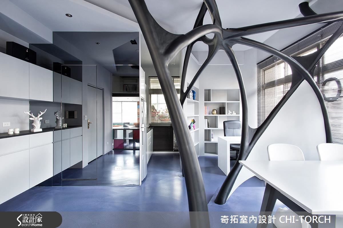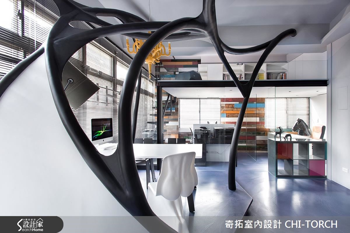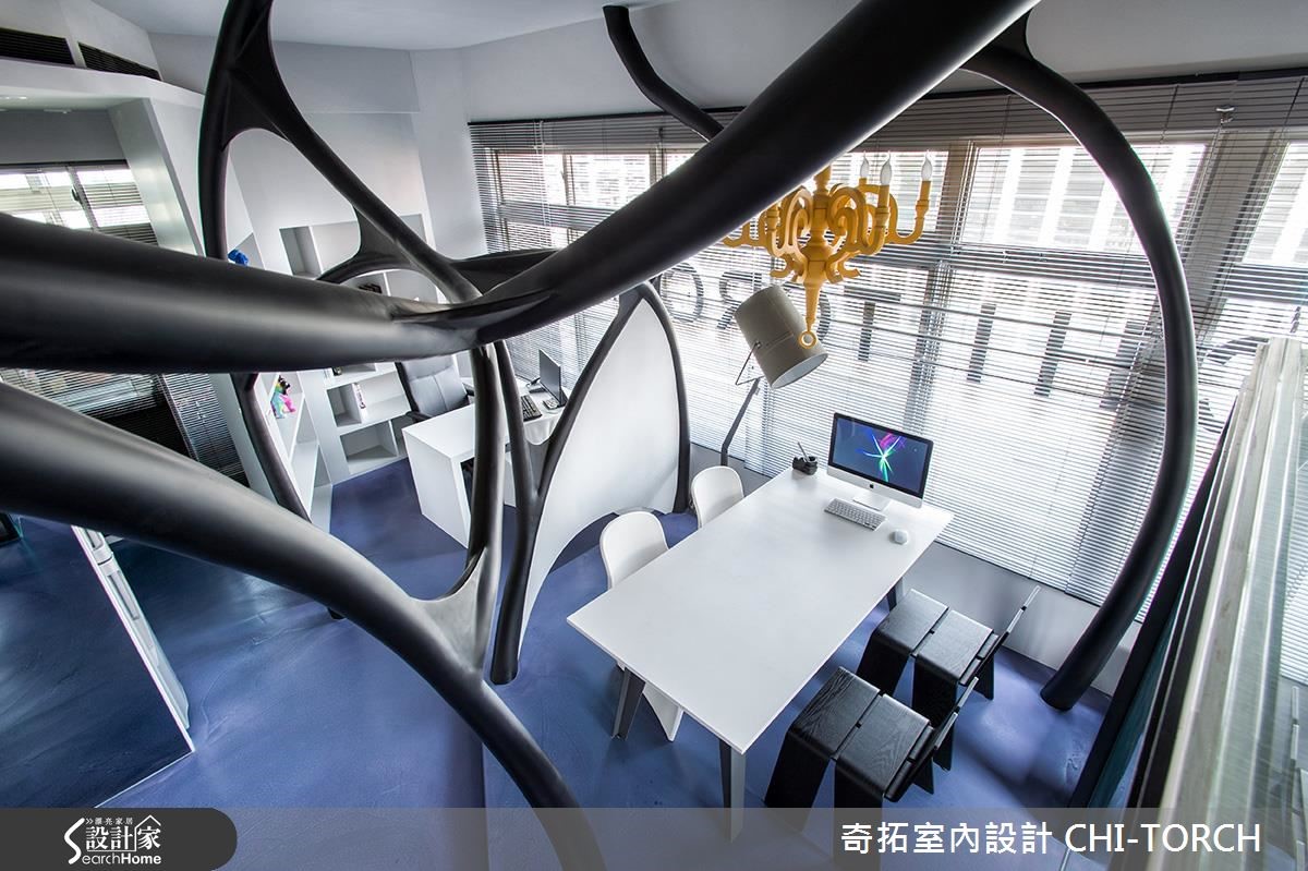 设计团队破除办公室框架,以"脑神经传导"概念为主轴,结合多维工法,利用结构复杂的线条,将原先西晒严重的二手房改造为宛如太空舱的前卫办公室。【以清玻与开放动线,强化交流】办公室跳脱呆板制式的格局,成为利用大脑统筹、激发灵感的区域。因此以"脑神经传导"意象的开放会议室为中心,巧妙利用宛如神经网络的线条与地坪阶差划分空间界线。为了有效扩容,利用全开放设计与清玻璃,藉由视线与动线的通透,交流设计想法也能毫无阻碍。值得一提的是,设计团队选择一面旧宿舍桧木板墙,凸显特有的台湾温度,并延续人文精神,让过去与未来在此达成一个完美平衡。铁件楼梯上方是特别预留阁楼空间,除了收纳大量书籍,更可成为沉思休憩的区域。