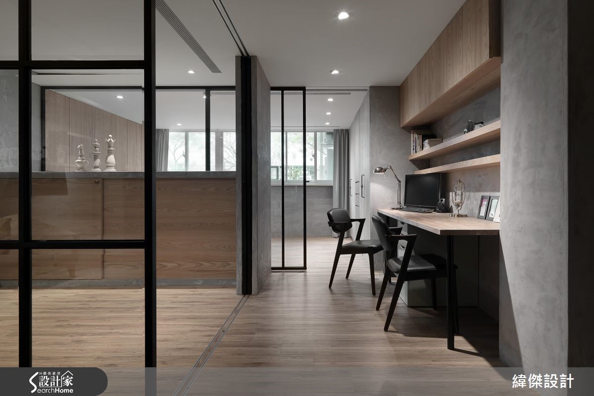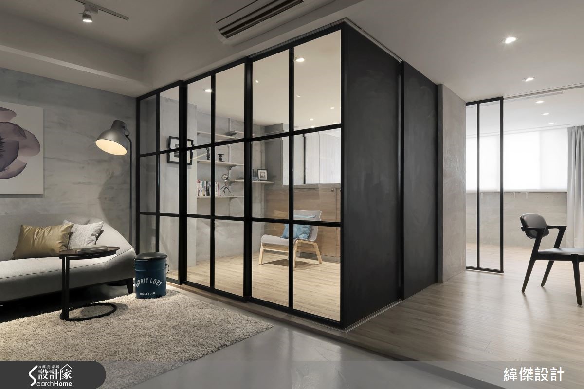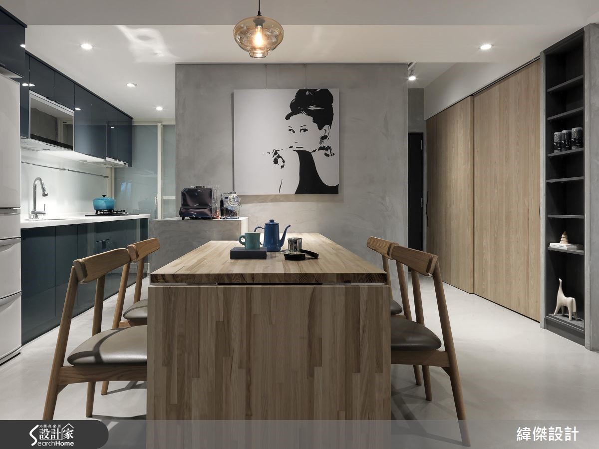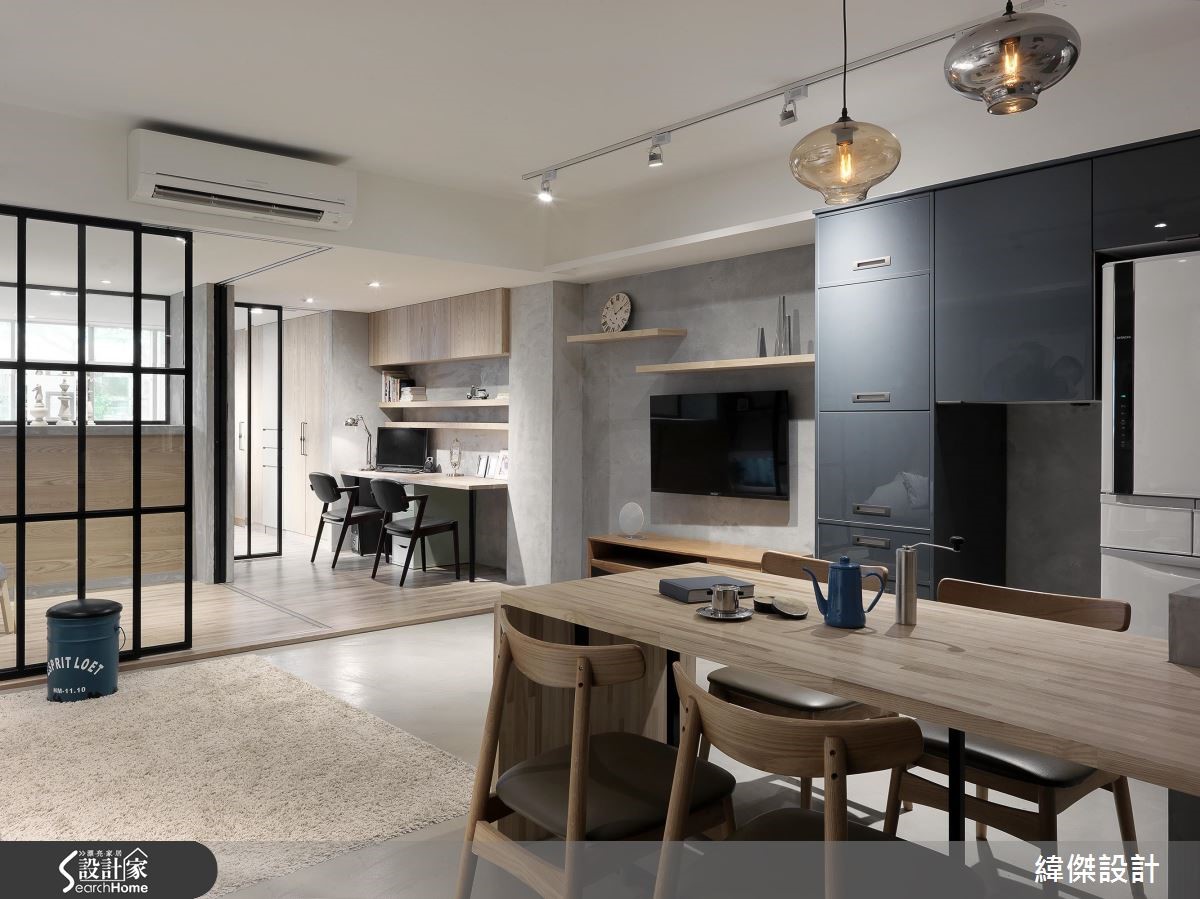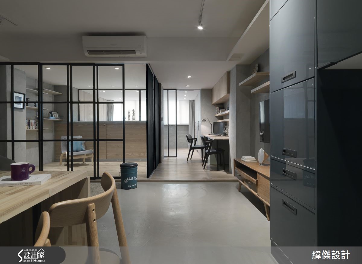 66平方米老屋,设计师考量到房子呈现狭长型、仅单面采光,替公共空间融入通透开放的设计概念。透过玻璃隔断的规划,让光线、空气得以自由穿透,并减少走道空间面积,打造出2人4猫的全新生活。【宽敞公共空间,让聚餐更尽兴】考量到屋主喜欢邀请朋友到家中聚餐,以及想给予小朋友可尽情奔跑的空间。设计师设定宽敞的公共领域,将66平方米狭长空间做出有效利用。除去过多赘饰与实体隔断,保有视线及光线的自由穿透,仅利用地面材质简单划分厅区与书房。整体运用铁件、清玻、镜面、木质的交织,表现材质特有的肌理特性,构筑质朴清新的Loft风格。餐厅的木质餐桌采以弹性折叠款式,创造更大的使用台面,并于墙面悬吊艺术画作,打造简约清爽的视觉。一旁则连结开放式厨房,创造互动密切的生活动线。