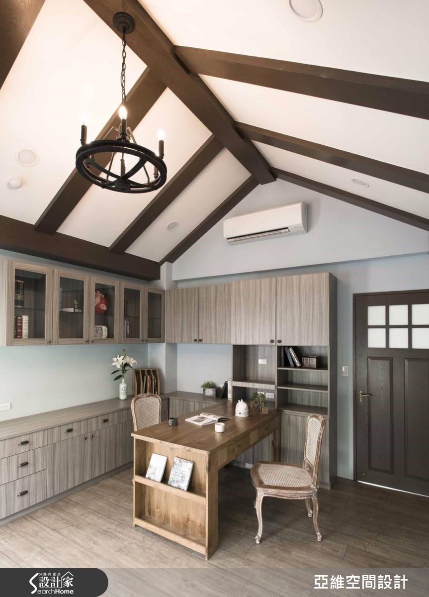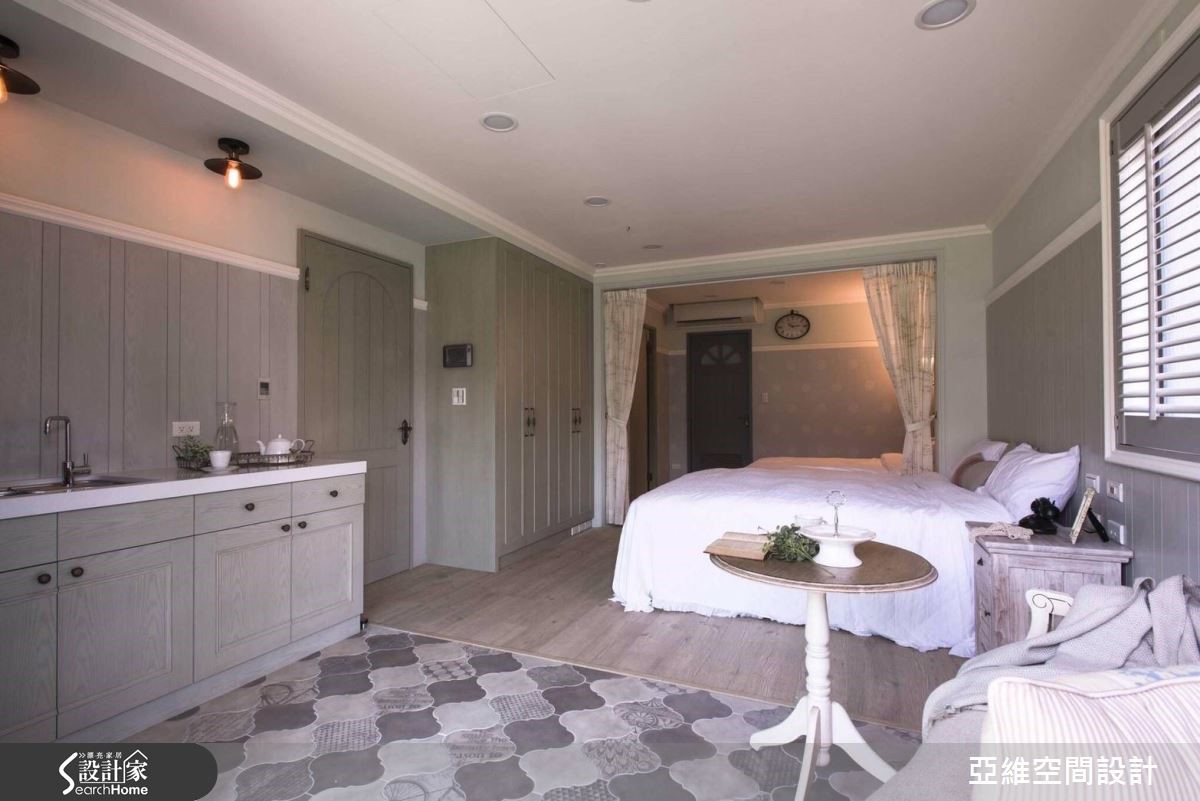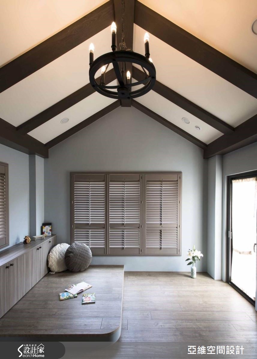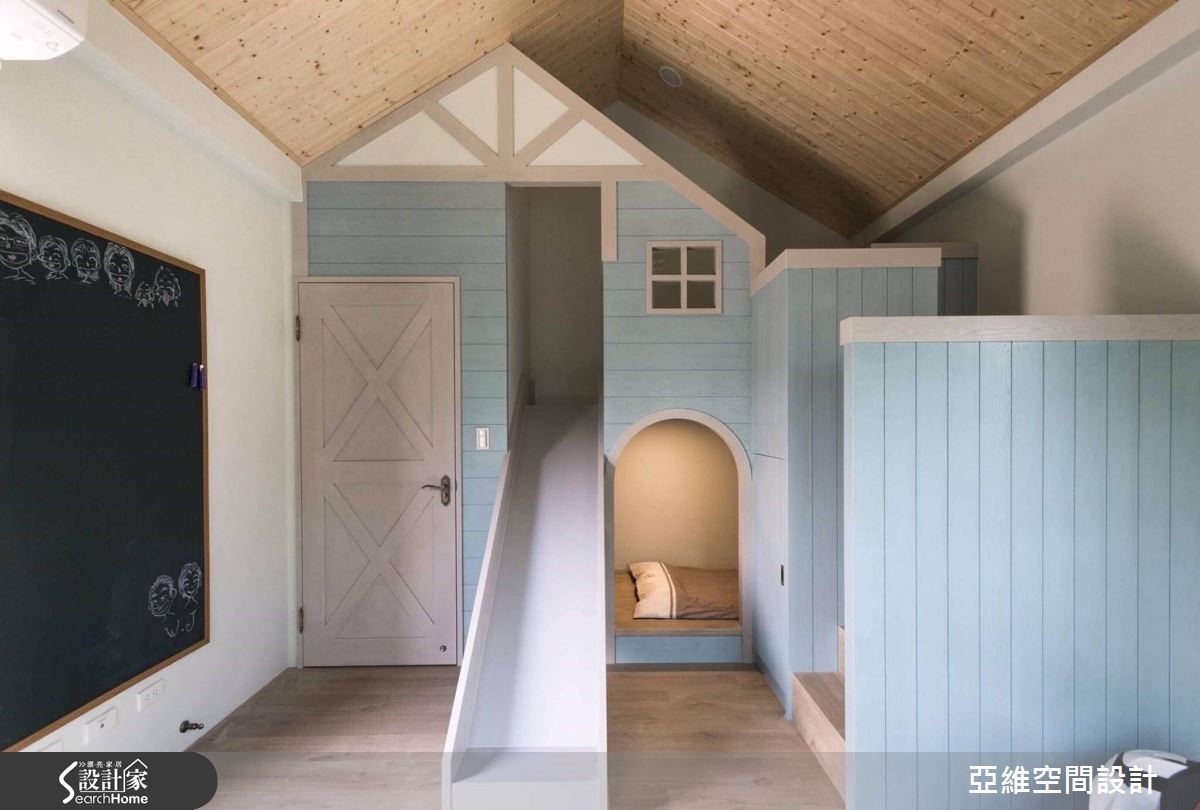 有别于普通的浪漫甜美乡村风,设计师透过法式乡村特有的古典与优雅,于室内挹注淡雅色彩,并结合户外的美好绿景,打造出城市之中的世外桃源。【融合对花纹理,调和温朴感受】玄关处,运用复古地砖的延续铺陈,引领自在的生活步调,再藉由动线的缓冲,转折进入客厅,呈现不同的居家风景,整体透过法式乡村风格作为基调,于电视墙融入对花纹理,搭配家具的木质色彩,调和出温朴感受。【拉门界定,适度调整隐私与开放】餐厅与厨房之间配置推拉门做出界定,在保有适度隔绝的同时,亦维系家人之间的互动关系,并妥善安置各项收纳及烹调机能,满足使用者所需。【斜屋顶设计,增添空间趣味性】主卧为复古砖地面,除了注入睡眠机能之外,更依循屋主需求,规划轻食场域,增添浪漫的生活意趣;同时考虑男主人的需求,规划书房兼飘窗区域,以斜屋顶创造有如童话木屋的氛围,结合游戏、阅读、休憩等机能,共享天伦之乐!