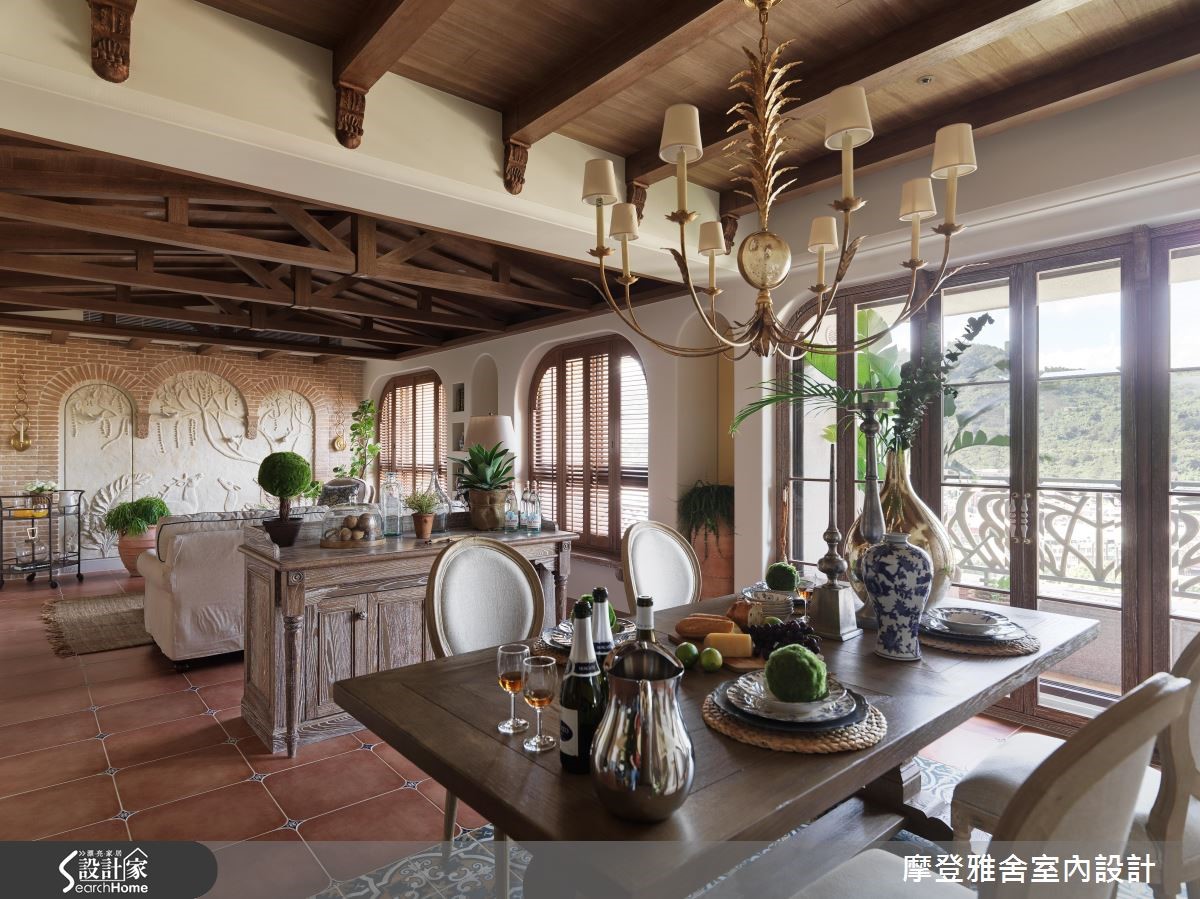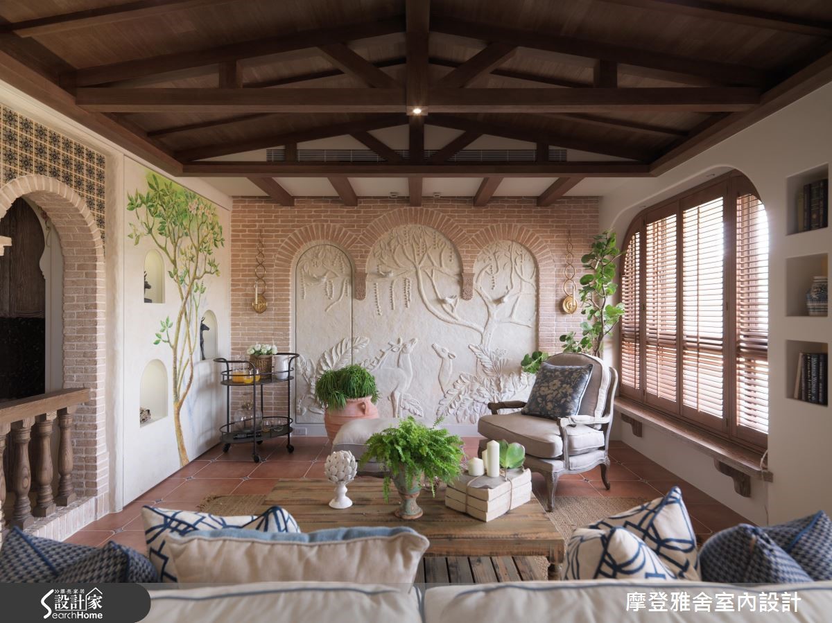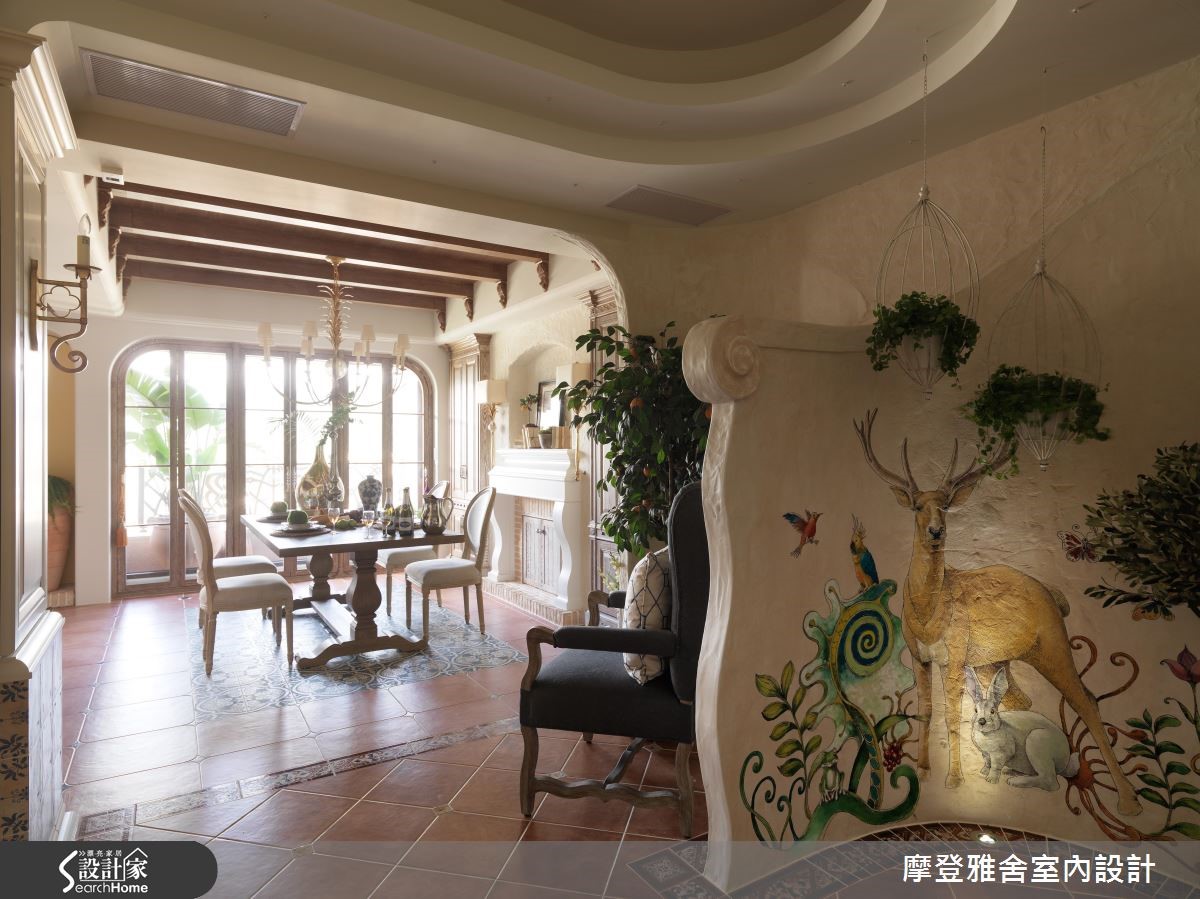汪忠锭、王思文两位设计师憧憬乡村风设计,在西班牙旅游之后,决定在自己的招待所尽情挥洒创意,以艺术手感设计结合乡村语汇,将多种异国元素融会贯通,打造出令人无比惊艳的空间表情,快跟着小编一起走进来看看吧!【流畅动线,开放的空间视野】玄关以手绘隔屏做出动线导引,将木造材质结合既有建物门片,营造与世隔绝的古堡风格;餐厅藉由大面窗连结阳台,让视野可延伸至户外景色,天花板加入金属灯,墙面施以壁炉造型,搭配开放的格局视野,建构大器工整的画面。【大胆创作,生动的领域气息】客厅、餐厅之间以家具简单区划,同时保有场域间的对话,窗面一贯地延续圆弧语彙,并配置木百叶创造纾压气息与调节採光,客厅尽头则大胆规划一整面泥造墙,搭配灯光投射形塑立体视觉,构成活灵活现的古典壁画。【热情南洋风情,提升艺术气息】在客厅尽头的墙面上融入展示柜体,内部暗藏储物空间,开启机能的趣味表现形式;起居书房内藉由挑高斜木屋顶设计,挹注峇里岛度假风韵,将手绘油画的缤纷花样挥洒于墙,带来度假感十足的南洋风情!
