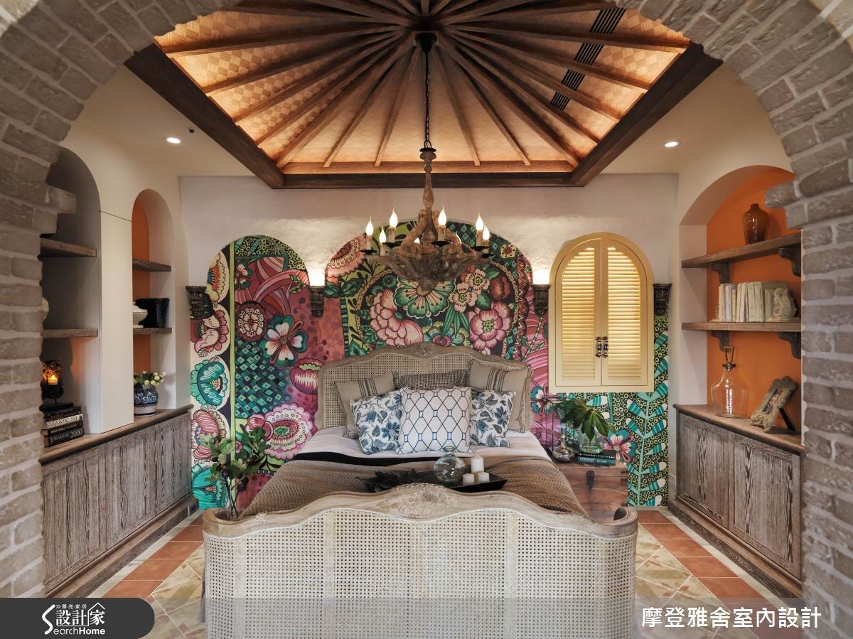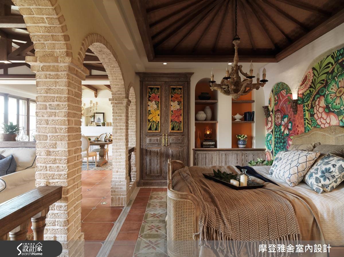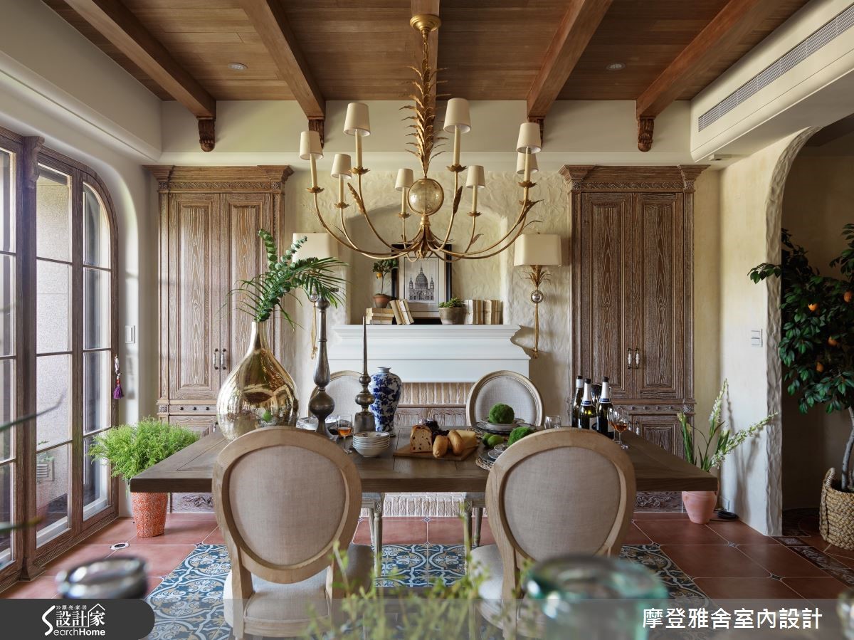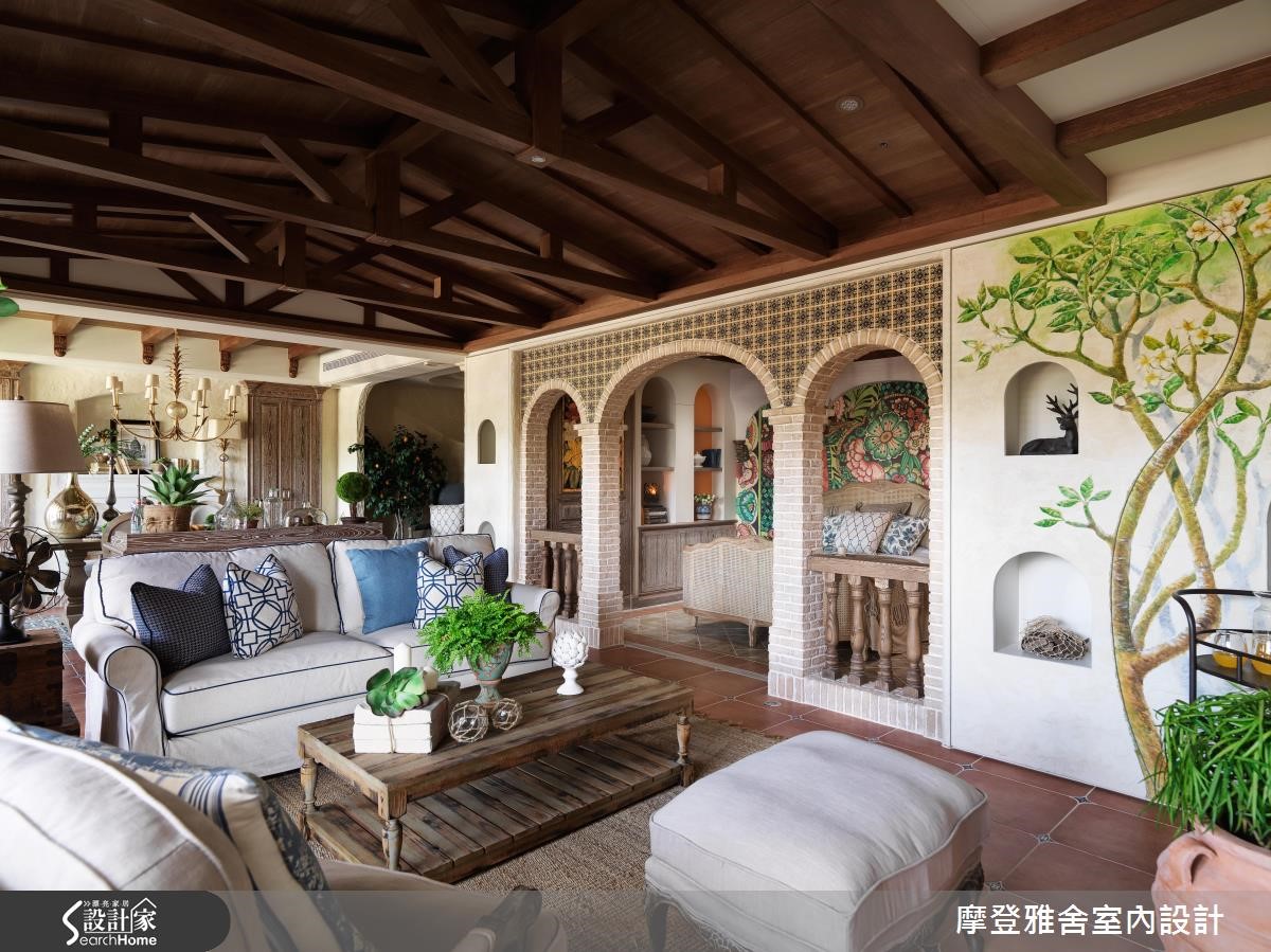汪忠锭、王思文两位设计师憧憬乡村风设计,在西班牙旅游之后,决定在自己的招待所尽情挥洒创意,以艺术手感设计结合乡村语汇,将多种异国元素融会贯通,打造出令人无比惊艳的空间表情,快跟着小编一起走进来看看吧!【流畅动线,开放的空间视野】玄关以手绘隔屏做出动线导引,将木造材质结合既有建物门片,营造与世隔绝的古堡风格;餐厅藉由大面窗连结阳台,让视野可延伸至户外景色,天花板加入金属灯,墙面施以壁炉造型,搭配开放的格局视野,建构大器工整的画面。【大胆创作,生动的领域气息】客厅、餐厅之间以家具简单区划,同时保有场域间的对话,窗面一贯地延续圆弧语彙,并配置木百叶创造纾压气息与调节採光,客厅尽头则大胆规划一整面泥造墙,搭配灯光投射形塑立体视觉,构成活灵活现的古典壁画。【热情南洋风情,提升艺术气息】在客厅尽头的墙面上融入展示柜体,内部暗藏储物空间,开启机能的趣味表现形式;起居书房内藉由挑高斜木屋顶设计,挹注峇里岛度假风韵,将手绘油画的缤纷花样挥洒于墙,带来度假感十足的南洋风情!