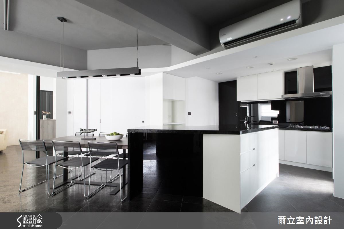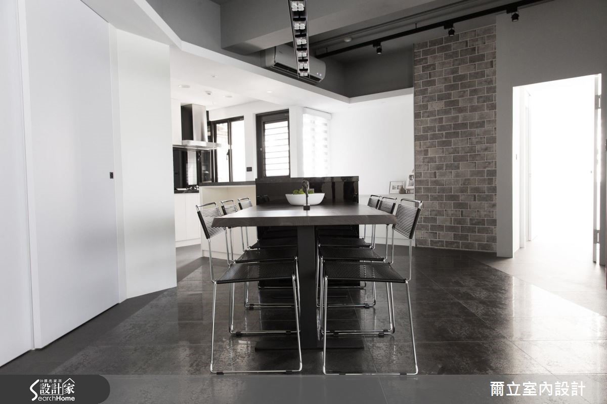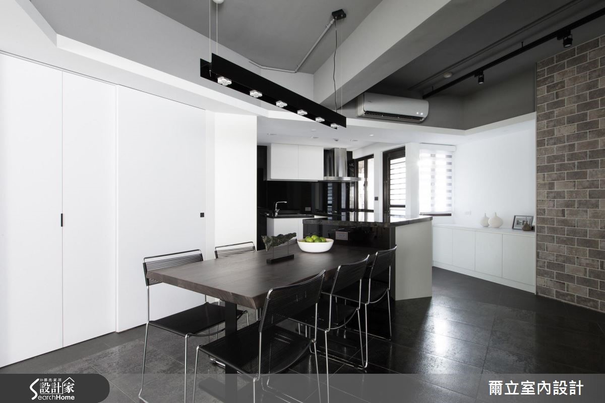 为改善老屋漏水、设备陈旧问题,屋主夫妻决定依赖专业设计师,重新规划动线与采光。跳脱方正格局的迷思,以U型轴线规划,竟能塑造方正格局无法达成的通透光感!究竟如何能办到? 【去除隔断,纳入明亮采光】由于居住人口单纯,设计师拆除原先厨房、和室与次卧等多余隔断,成功援引大量光线进入室内,让视线不受零碎隔断阻碍,为公领域双倍扩容。在格局改造方面,设计师在开放餐厨空间让动线U型转弯,让客、餐厅动线得以紧密串连。用餐区更利用大面斜墙结合柜体与推拉门,达成多维利用机能。客厅前方的斜角柜除了展示屋主的收藏品,更利用斜面化解深柜笨重感。客、餐厅之间以大量黑白纯色搭配玻璃隔断,营造时尚俐落气息,让视觉更显通透。全室地面皆以意大利金属砖搭配凿面石英砖,顺应空间角度混搭拼贴,营造宛如蒙太奇的分镜效果。设计师以不露痕迹的分割与重组,为屋主创造崭新的居住思维。