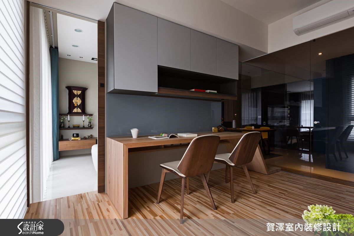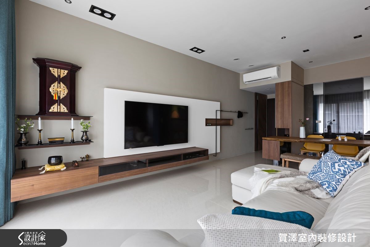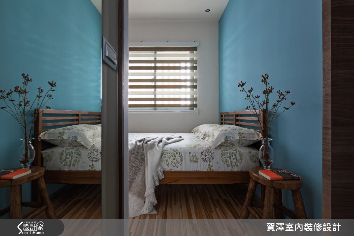 蔚蓝色,是一个接近天空的颜色,传达自由无拘无束的休閒氛围。设计师透过现代简约又不失个性的设计,在公共空间与私领域分别移植了蔚蓝海洋,让微笑永恒的留在这个家。【简约的设计与色彩,挹注活力】公共空间以开放式设计,引进大片落地窗光景,营造明亮舒适感。入口墙面以铁件做为衣帽架的小巧思让人会心一笑,以长形木柜连结电视墙与玄关墙面,佛堂同时整合在电视墙面上,让区域彼此连接却不衝突。餐桌椅选择单椅和长椅,弹性又混搭,辅以蔚蓝墙面上的一抹红唇微笑,为整个公共空间画龙点睛,呈现兼具活力与浪漫的空间。主卧拥有收纳柜体,加上更衣室,大量的收纳满足屋主的需求,而客房的蔚蓝墙面也与公共区域呼应,让整个新家拥有惬意氛围又不失个性美感。