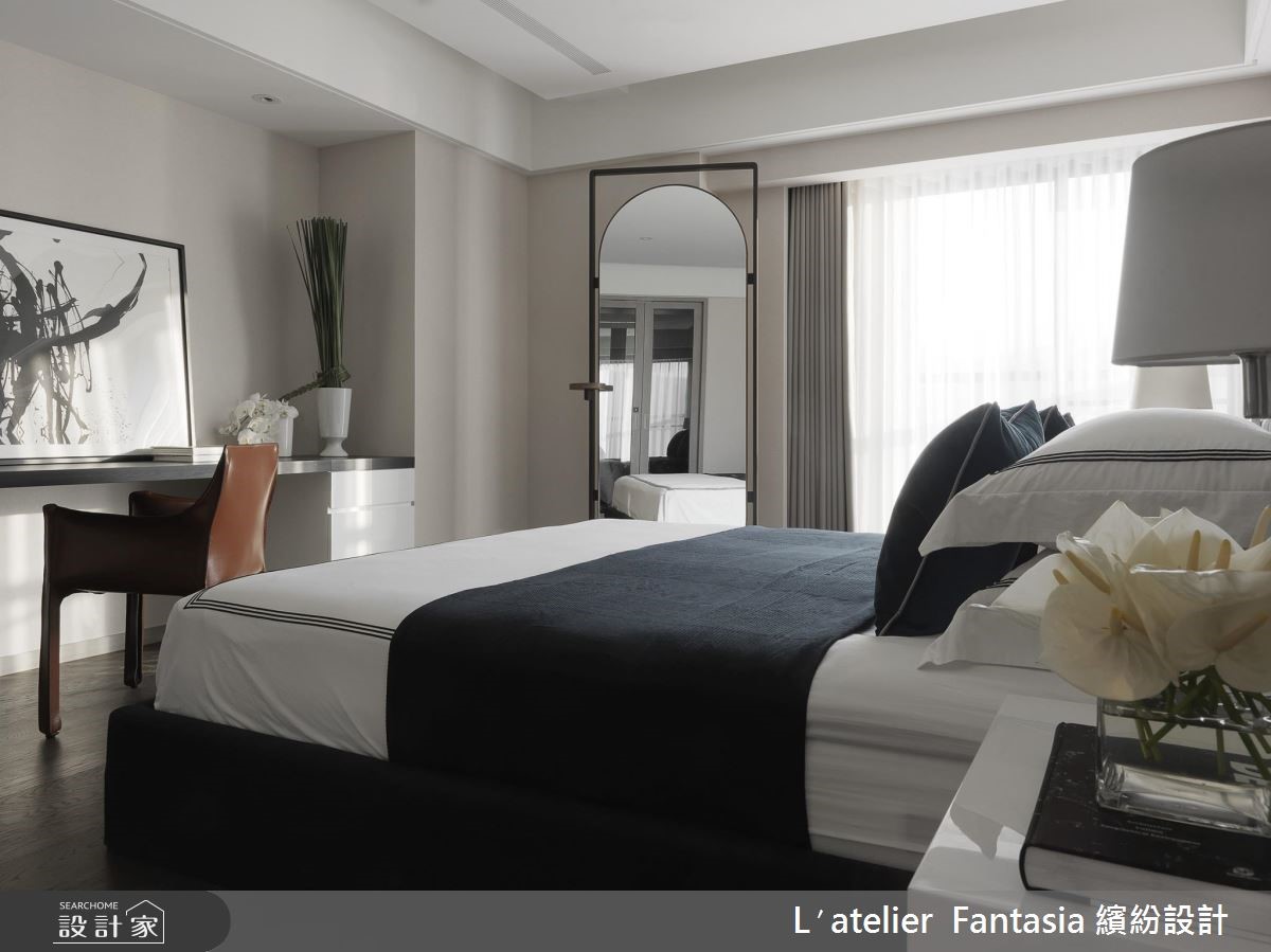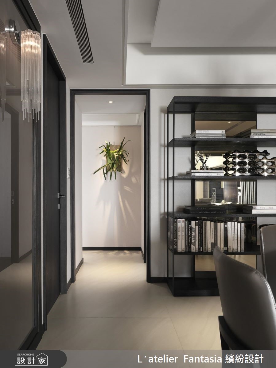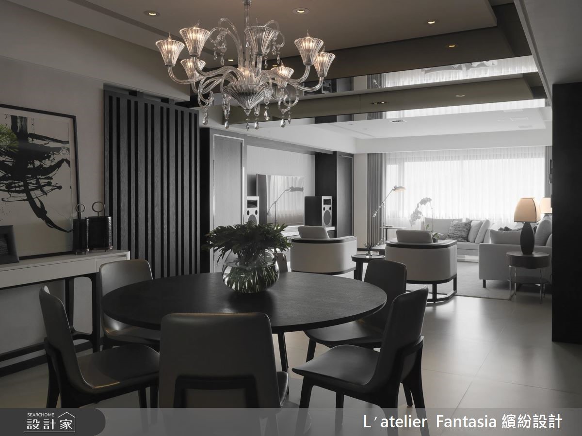 温柔、简约的灰阶色调,搭配艺术气息浓厚的现代摄影作品,这是为热爱摄影、音乐,独具美学品味的屋主所定制的居所,并以圆融曲线和自然植栽点缀,柔化方正理性的现代风,在生活的每一刻,举手投足间皆能演绎迷人优雅的生活内涵。 【开放设计与低彩度带来沉稳层次】恰到好处的黑、灰、白比例,在开放式的公领域中调制出清爽而舒适的色彩层次,搭配深邃色泽的木皮,利用材质的差异性,表现丰富的视觉效果。客厅和餐厅间横亘的梁柱,运用镜面虚化存在性,拉抬了空间高度,也为生活空间注入银亮的时尚色泽。【定制款家具饰品彰显屋主品味】而家具和家饰的选择也带有成熟而温柔的细腻韵味,沙发摆设丝质的进口布艺订制抱枕,在触感极佳的面料上,呈现出如东方水墨的晕染笔触;墙面则悬挂以光影为题的摄影作品,将绝佳的生活品味,引注于日常生活之中。【私人空间以酒店式规划注入质感】主卧室延续简洁的色调、线条安排,带来精品饭店的质感氛围,也埋下视觉伏笔,巧妙凸显出床头墙的条纹对比。至于为孩子们所规划的阅读书房,运用布织质感的灰色壁纸作为温文背景,加入裱框的摄影作品装饰,从日常点滴中感受生活美学的潜移默化。