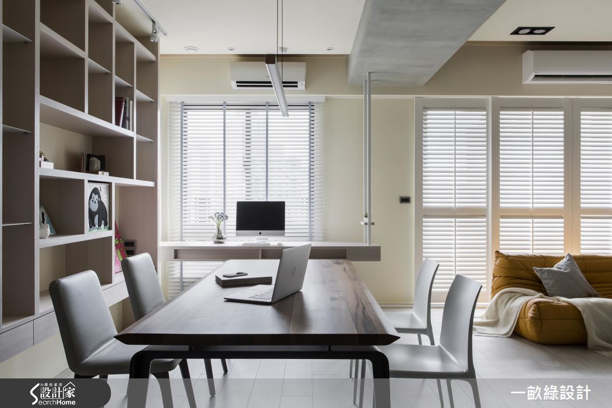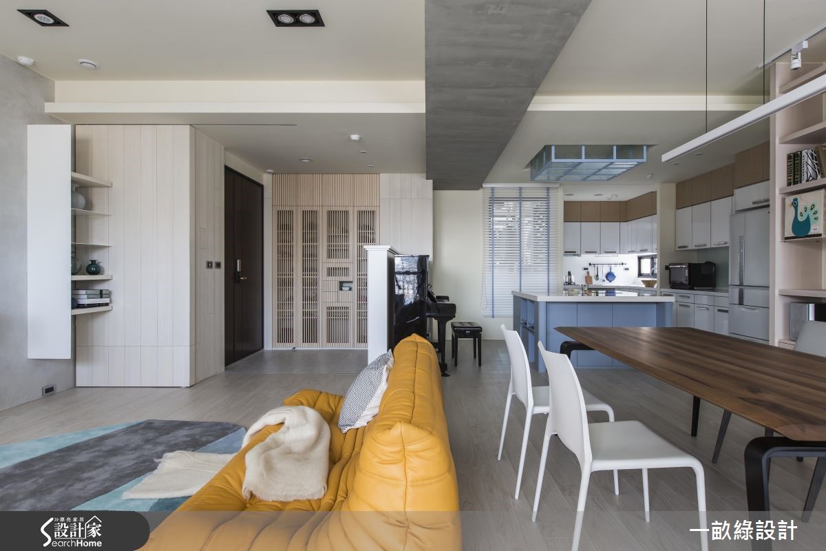一户99平方米容纳着两大两小的现房新家,拥有良好的采光是这处空间的优势,设计师便以开放式的设计手法,将空间打开,也把视野打开,让日光自由流动;另透过软件布置,在无形之中界定客餐厅及书房领域,让彼此串联又独立。【彩砖与几何家饰,表情更立体】一进门,矮墙上缤纷又带有点复古味的彩砖,彷佛是欢迎每个进门者的心情!全屋以浅色木纹地板做铺陈,让木质元素独特的温润及舒适感成为这间开放式设计居宅的底蕴。客厅一抹净白自然的电视墙,也抹上了光影变化的痕迹,日光透过大面百叶帘传递着宁静美好的气息;而带有几何设计造型,色彩鲜艳的沙发与地毯,则为这样的宁静再添上了一抹自在微笑。沙发后面是餐厅兼书房的复合式机能空间,摆放着不同趣味画作的展示墙,为居家创造出缤纷又活力的景观,不论吃饭、阅读或工作,都感到舒适惬意;而一旁的开放式厨房与中岛吧台,以白色、紫蓝色相搭配,少了隔断的压迫感,让料理时光更自在尽兴。