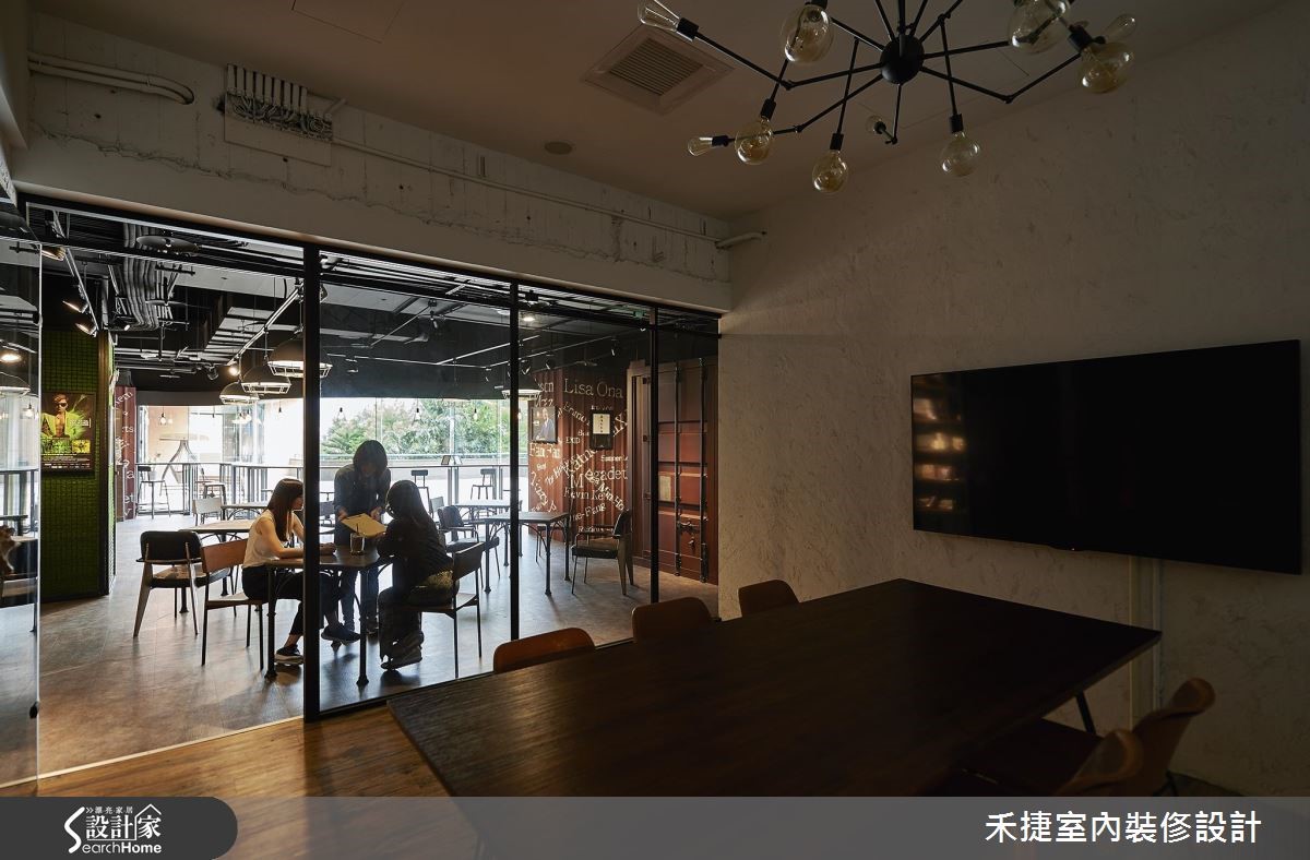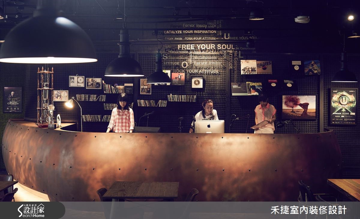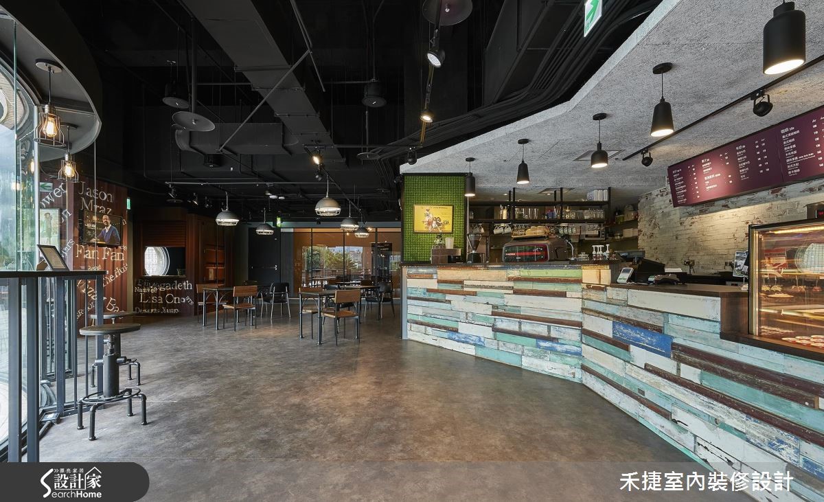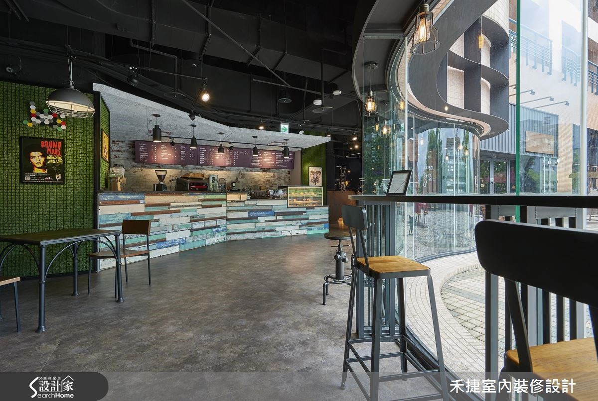 这间融合咖啡厅、表演舞台,以及办公区等复合式机能的商业空间,注入强烈的 工业风格,运用铁件、粉光水泥加强粗犷性格,并适度搭配温暖色系的木质,及活泼的草绿色彩,平衡工业风的冷冽,更显放松自在。 【开放设计,造宽阔活动空间】从门口蓝色货柜大门进入,便来到属于音乐与美食的前卫休闲基地,宽阔的空间展现开放自由动线及多元机能运用。建筑物本身原为体育馆用途,具有挑高、宽敞的空间特性,搭配裸露天花管线,更让高度显得深邃而有层次。空间配置包含表演区、售票亭、DJ 亭、简餐区,以及办公室等功能。为了凸显工业风气氛,主色调选用黑色,辅以利落铁件,回收木等材质,让音乐表演空间洋溢浓浓的个性感,而不同的空间用途,设计师也赋予不同的灯光效果,让每个领域皆有独特氛围。