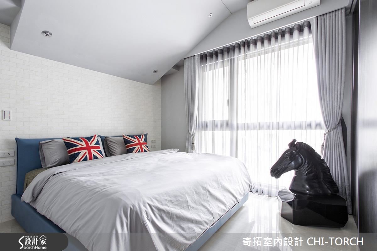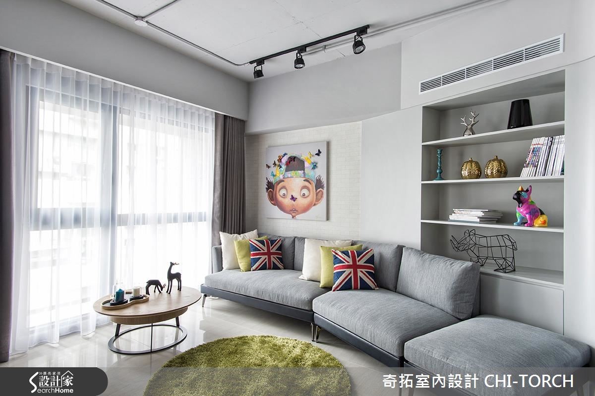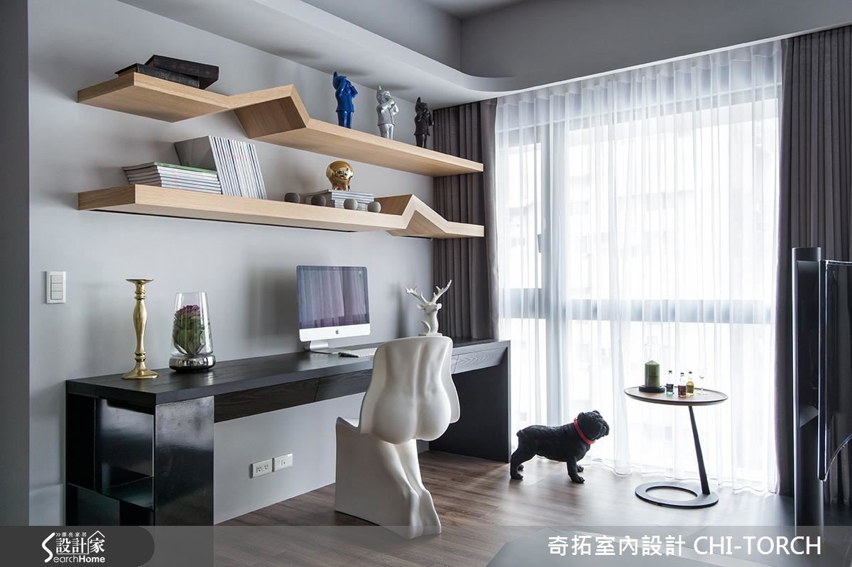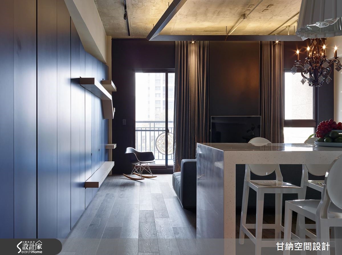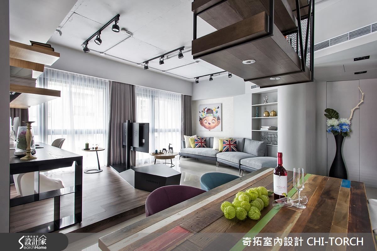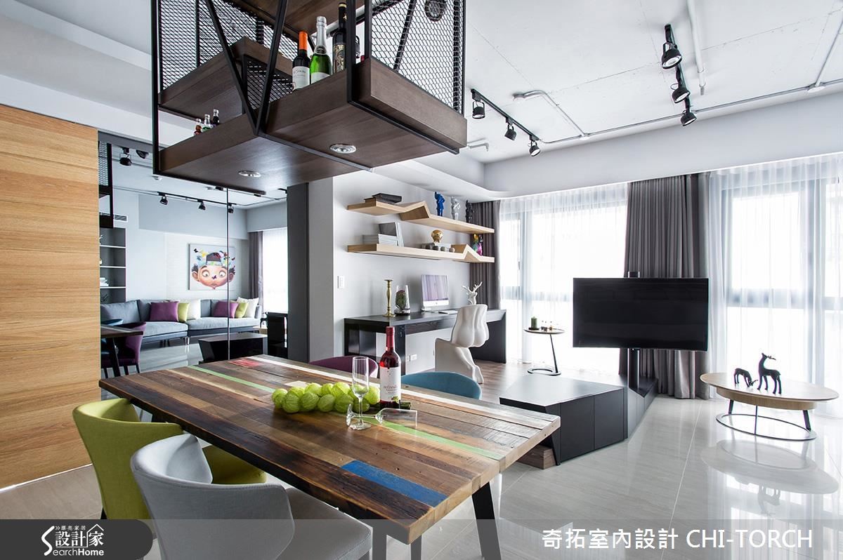 这是2人2猫的119平方米居宅,透过将公共领域放大、缩减寝卧范围,让空间更舒适。依据需求打造充足的酒类收纳,且针对两只爱猫做出温馨设计。结合北欧风、工业风的完美混搭,演出纾压又趣味十足的日常景况。【架高书房,空间更有层次】公领域采全开放式规划,且让沙发墙面做出转折,搭配半弧型椅座延展宽敞视感。一旁收纳柜则因应角度,得以容纳更多储藏量。藉由跳色手法及家具的重点装饰,混搭出独具风格的空间场景。中央规划旋转电视墙使各区域皆能共享。架高地面后,不仅圈围出开放的书房领域;电视地柜还身兼储物与座椅功能,让书房还融合了起居室的意义。摆张趣味十足的造型单椅,更能在开放环境中营造画龙点睛效果。餐厅融入灯光与缤纷的家具,并悬吊工业感酒柜设计,让屋主享有美好品酒时光。,一旁以镜面拉门区分公私领域,在达到界定的同时也双倍延伸视觉。寝卧保留采光与窗景优势并于天花做出倾斜,搭上强烈的风格家饰,点燃了个性十足的空间表情。