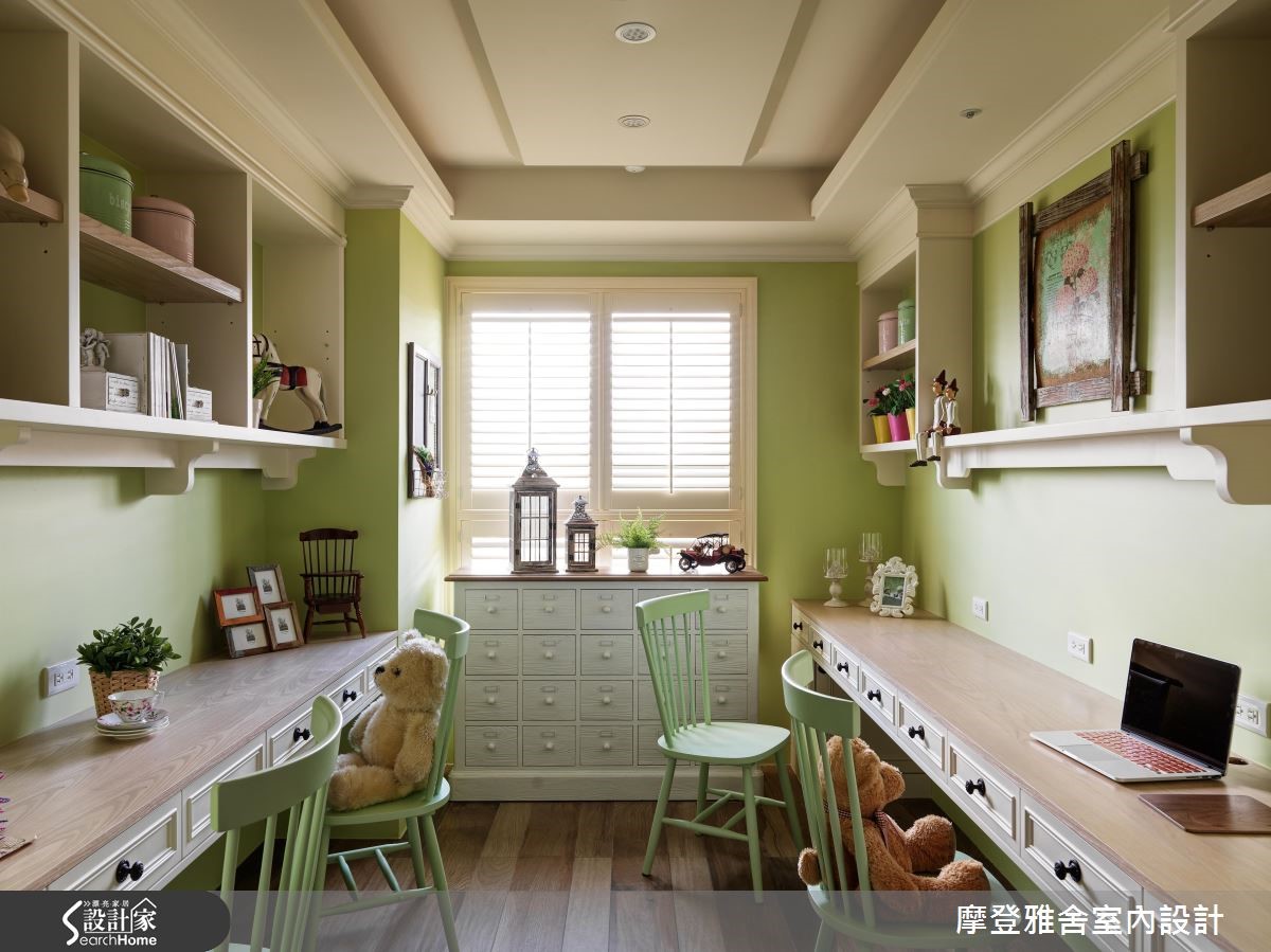 在远离收纳不足、凌乱不堪的旧家后,一家五口搬至198平方米新居,设计师注入乡村美感、给予清新色彩,特调出活力新鲜的空间韵味,开启家的缤纷视觉飨宴,快跟着小编一起走进来看看吧!【清新夏季,客厅氛围】客厅呈莱姆绿色调,带入夏季清新感,并考虑到全家人的习惯,舍弃制式电视墙,减少不必要的视听娱乐,同时依据开窗方位,延伸出飘窗区,满足休憩阅读需求,墙面绘制并肩的彩色鹦鹉,象征一家人亲密情感,描绘出幸福景象。【悠闲氛围,美好生活】餐厨区采紫莓色定调,透过拼花地砖、木质天花与灯饰增添气氛,一道拱型室内窗让后阳台光线可直抵餐厅;书房融入枣绿色调,一道清玻推拉门延揽光线,内部不仅创造收纳需求,更规划双排座位,打造美好的阖家阅读时光。【浪漫的意象,打造私领域】主卧内给予两个更衣间,满足男女主人个别所需,并加入灰蓝薰衣草色,与蓝色花朵墙纸、白色线板搭衬,带入法式普罗旺斯的清新意象;姊妹俩共用一间房,可享有亲密的床边对话,以花色墙纸带入春天活泼感,充分表达生活风采!
