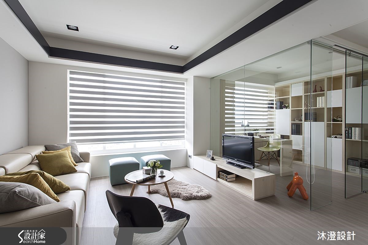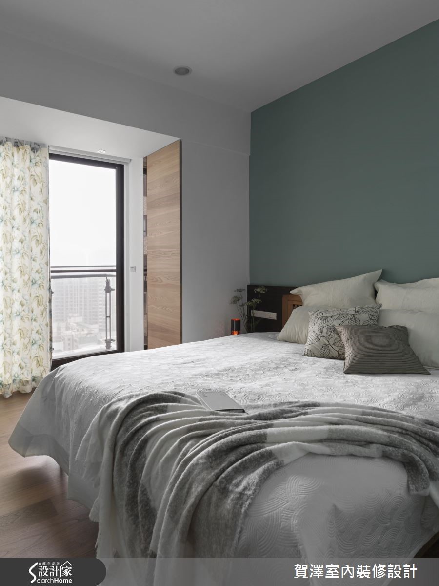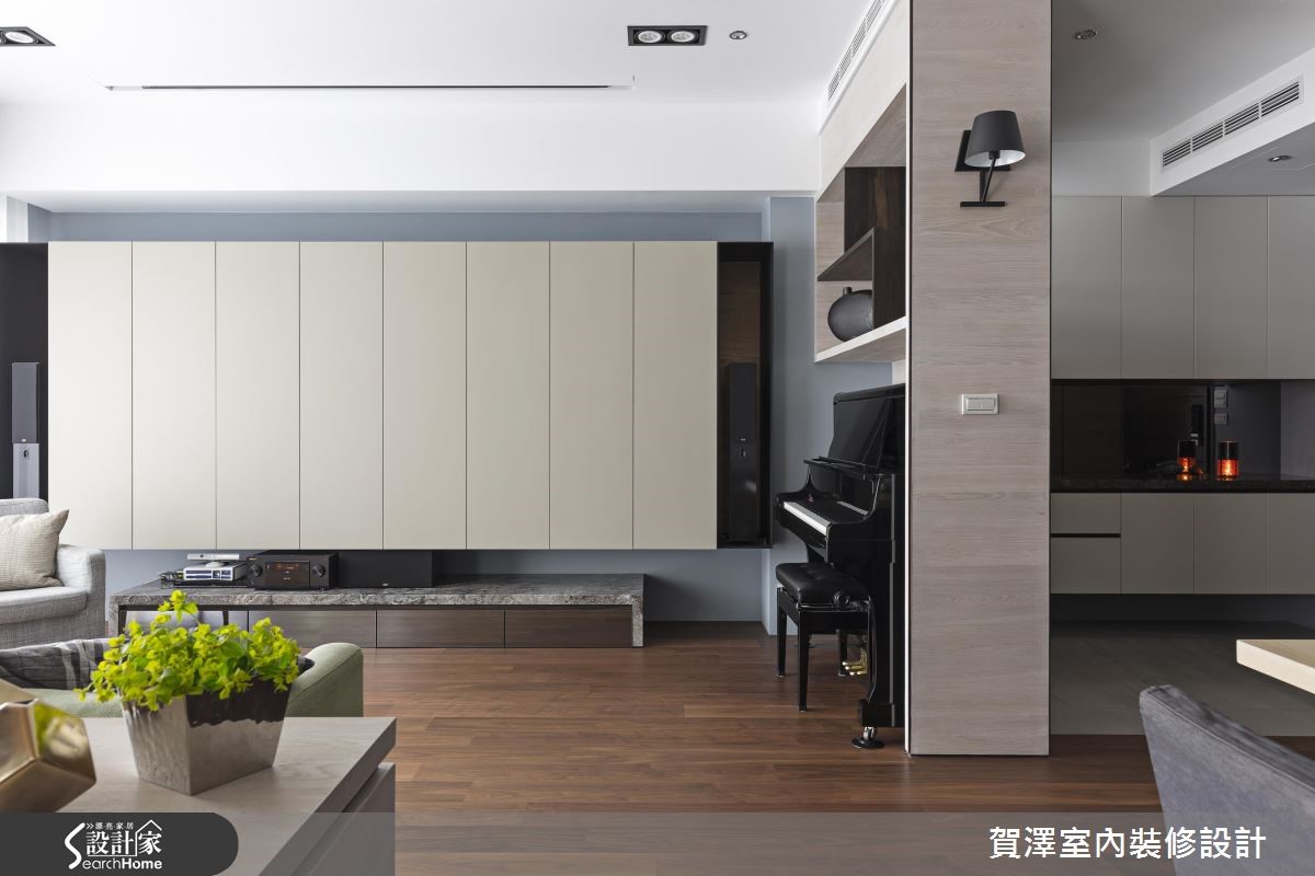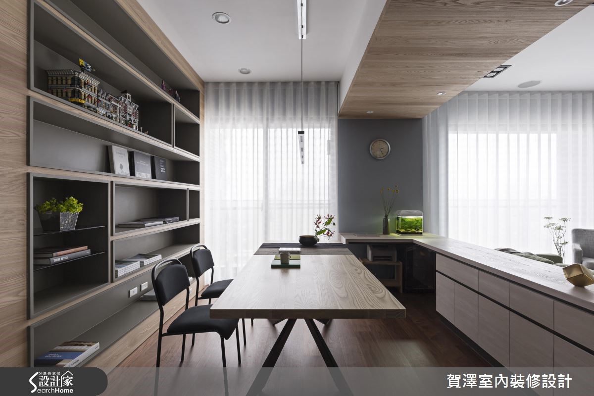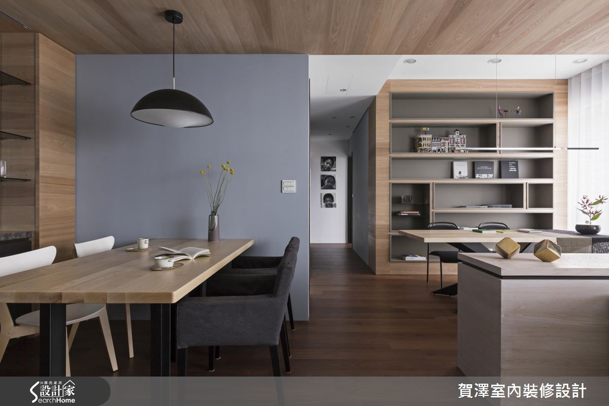 现代风居家不但拥有宽敞的家庭剧院,还有可以让全家人一起享受阅读的开放式书房,设计师也为了喜爱户外活动的一家人,打造充足储藏收纳空间,妥善收存露营工具及运动用品,在舒适的家庭生活中,期待下一次的亲子旅程。【舒适温馨的空间规划】公共空间採开放式设计,清新温暖的木质色调,搭配宁静的浅蓝墙面,更加凸显色彩的立体层次,并包含客厅、餐厅、书房、琴房等多重机能性,将一家人的日常生活自然融贯在这个舒适的大空间中。电视墙改为投影布幕,假日时能与家人聚在一起看电影,而原本放置电视的位置,则改为实用柜体,打造充裕的收纳空间。书房摆上可容纳全家人的大长桌,成为凝聚情感的生活场域,时常与孩子们相伴,描绘出温馨欢乐的居家画面。设计师以实用而耐看的设计,取代繁複装饰手法,融合多元的空间机能,并赋予充足收纳,为一家 5 口创造舒适、自在的家居生活。走进主卧室,墙面绘上大面浅湖水蓝色,搭配舒适的落地窗景,让睡眠区氛围也更加清新、明亮。