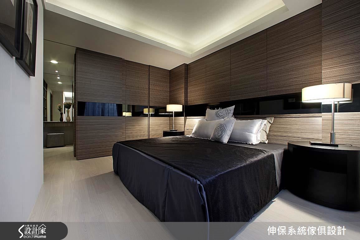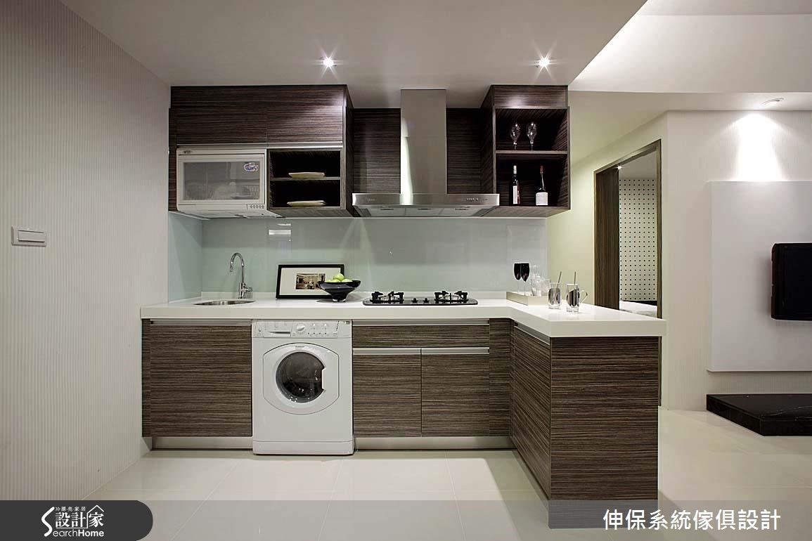 设计师透过系统柜的铺排,搭配温润的美感设计,让居宅兼具美感与机能,客厅落地窗旁架高木地板、陈列矮桌,规划隐密的休憩飘窗,在此以书香、日光为伴,替生活增添难得的悠闲氛围。【天然文化石,为生活质感加分】为了延展空间宽阔感,采用开放式的客餐厨设计,将白色视为空间的主要背景色,并于沙发墙铺陈天然文化石,带来视觉上的轻盈质韵。搭配深色柜体木纹,将收纳机能完整发挥,摆脱了老旧系统柜的制式化造型。在兼顾实用性之余,也演出生动的空间表情。卧房则于床头规划大面积柜体,腰带处加入延续性的黑镜赋予通透层次。更衣室则延续同款的深色木质纹理,给予强大的柜体配置,搭配镜面墙拓展狭长的空间视觉。在有限空间内,呈现人性化的体贴设计。