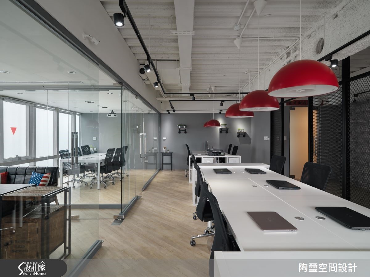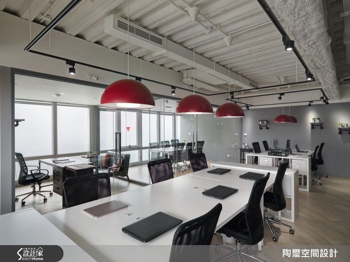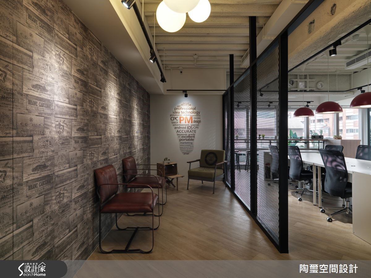 前身为中古屋的其他企业办公空间,坪数虽仅83平方米,但设计师藉由通透开放的格局配置、搭配明亮采光,达到扩容场域视觉效果,同时结合 Loft 风格元素,引领企业的独特形象!【上班不累,找个激发创意空间】玄关使用进口壁纸铺陈墙面,带出Loft个性印象,传述对纽约苏活区创意、艺术风格致敬的意味,并规划铁件隔间作出与室内场域区隔,藉由穿透视感强化空间整体尺度。【办公室扩容术带出活力感十足】办公室则给予干净线条,并导入开放式设计,透过日光与冷色日光灯的辉映,造就明亮立体的敞阔氛围,同时注入流畅动线,配置连贯办公桌有助员工讨论互动。办公桌上方悬吊红色吊灯,在极简主调中拢聚视觉焦点,带出活力感十足的新潮特色!【上班族小聚的纾压疗愈角落】一侧的大面积灰色立面则采用黑板漆材质,可兼顾吸附磁铁与留言版功能;靠窗处特别以长吧台、单椅打造纾压角落,桌面陈列一整排绿色多肉植物,搭衬美好的窗外景致,让员工们可在此休息片刻,感受难得的疗愈气氛。