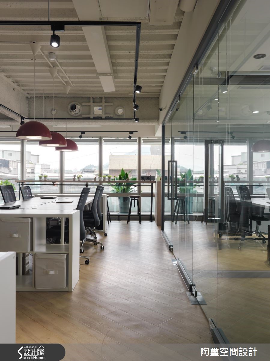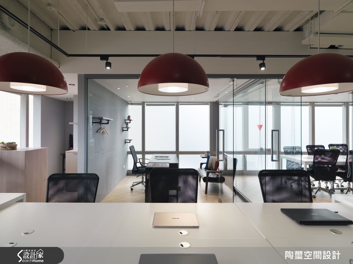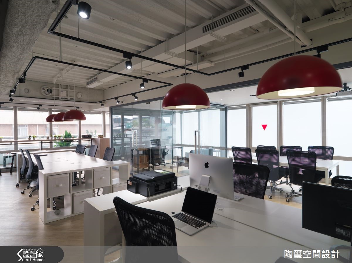 前身为中古屋的其他企业办公空间,坪数虽仅83平方米,但设计师藉由通透开放的格局配置、搭配明亮采光,达到扩容场域视觉效果,同时结合 Loft 风格元素,引领企业的独特形象!【上班不累,找个激发创意空间】玄关使用进口壁纸铺陈墙面,带出Loft个性印象,传述对纽约苏活区创意、艺术风格致敬的意味,并规划铁件隔间作出与室内场域区隔,藉由穿透视感强化空间整体尺度。【办公室扩容术带出活力感十足】办公室则给予干净线条,并导入开放式设计,透过日光与冷色日光灯的辉映,造就明亮立体的敞阔氛围,同时注入流畅动线,配置连贯办公桌有助员工讨论互动。办公桌上方悬吊红色吊灯,在极简主调中拢聚视觉焦点,带出活力感十足的新潮特色!【上班族小聚的纾压疗愈角落】一侧的大面积灰色立面则采用黑板漆材质,可兼顾吸附磁铁与留言版功能;靠窗处特别以长吧台、单椅打造纾压角落,桌面陈列一整排绿色多肉植物,搭衬美好的窗外景致,让员工们可在此休息片刻,感受难得的疗愈气氛。