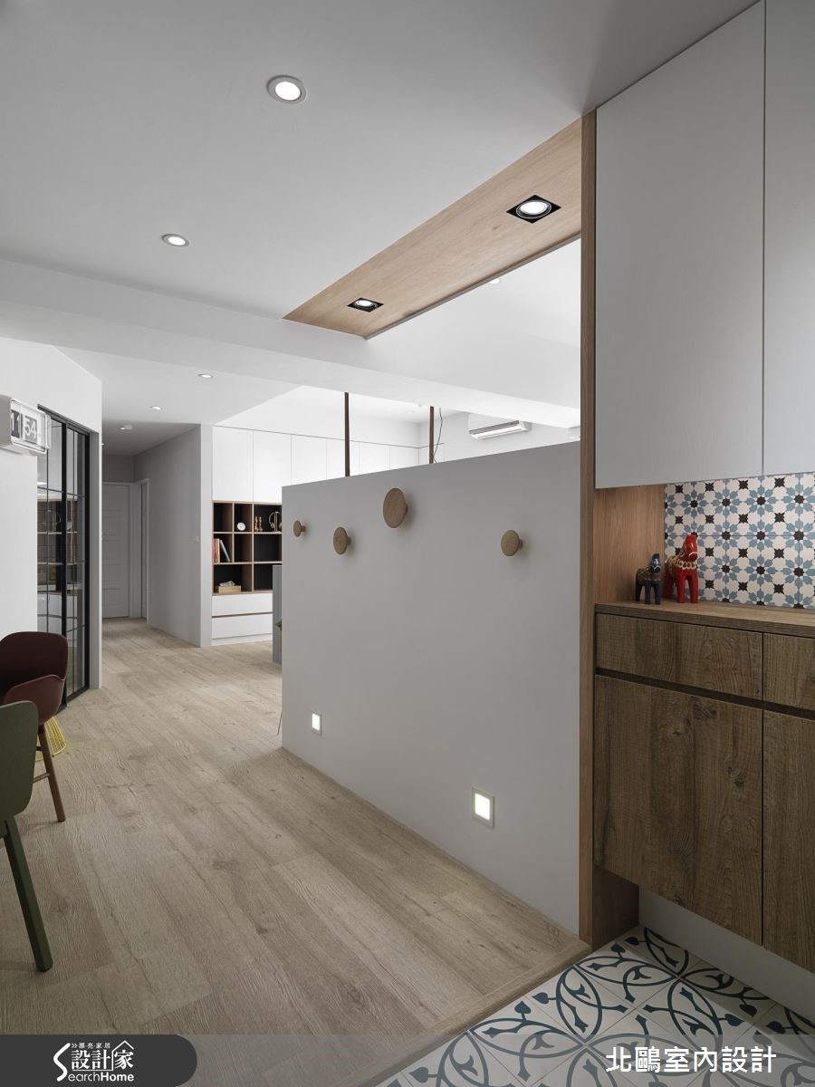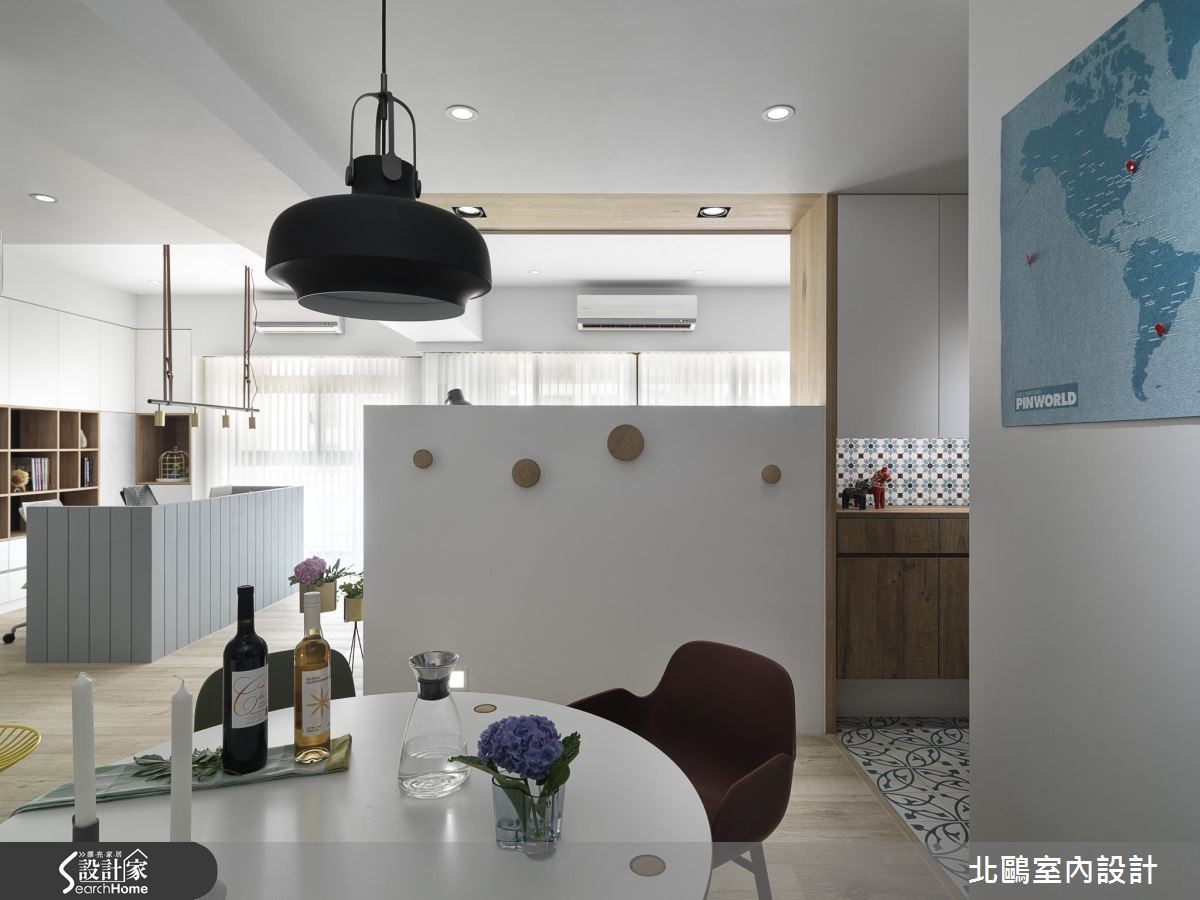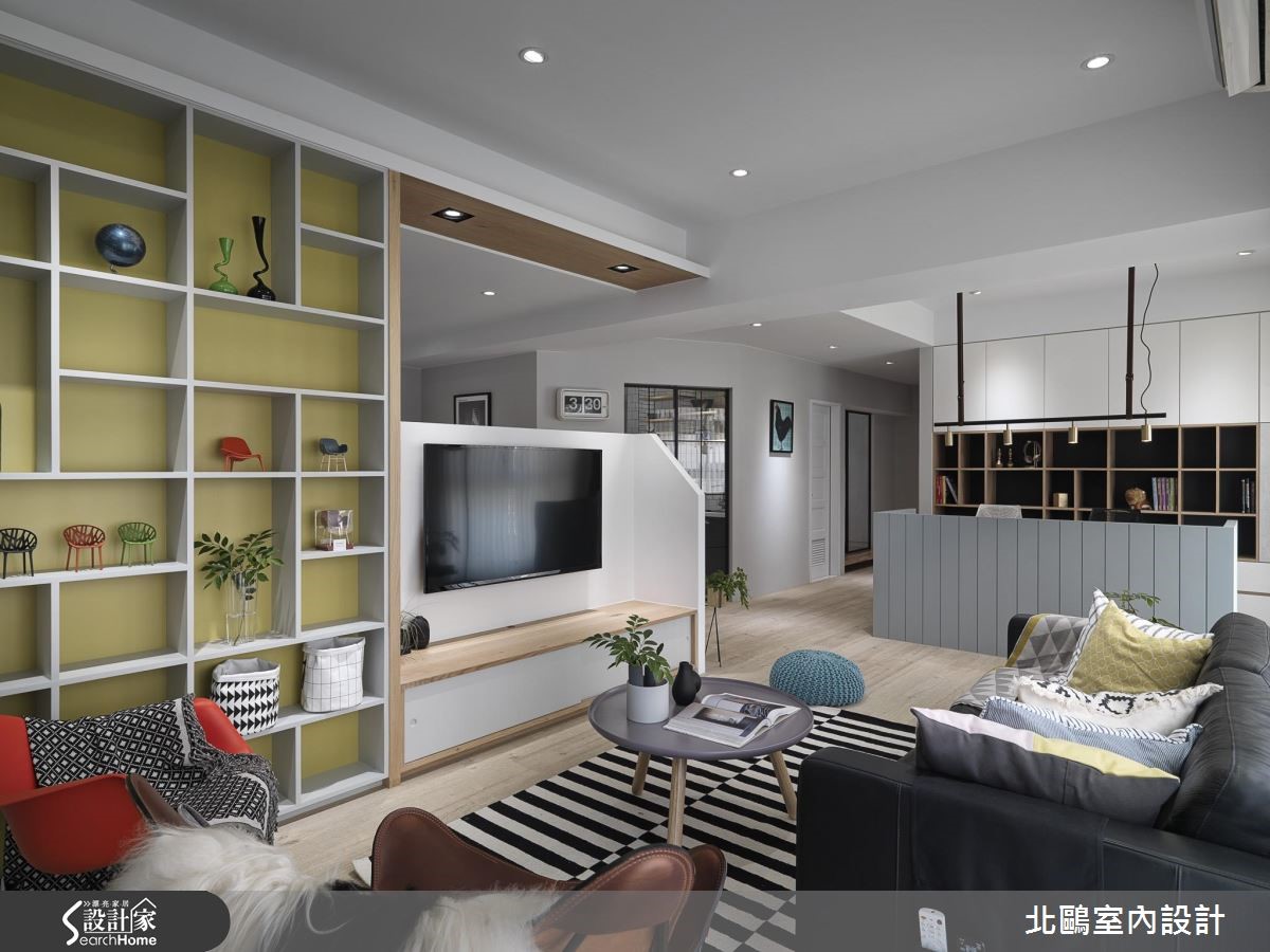 设计师重整新成屋既有格局并适度转向,解决门对门的疑虑。更准确划分开放空间,整理流畅的生活动线;接着在纯白空间注入缤纷单品,为夫妻俩营造地道的北欧风情。【善用玻璃门,开放感好顺眼】玄关墙面与地面铺设蓝白相间的进口花砖,创造清新明亮的气息,利用走道划分开放空间,左侧紧邻着餐厨空间,右侧则为客厅与书房。入门即可看见地道的北欧景象,以多彩单椅点缀黑白空间。餐厨规划跳脱一般格局,以斜角墙面划分独立烹饪空间,并利用铁件玻璃移门维持通透感。另一边的开放式书房与客厅相连,则是大幅提高居住者的互动性,同时也能准确区分空间机能。客厅以鲜黄柜体取代隔断墙,除了降低预算,更能兼顾收纳机能。设计师更紧扣风格主题,以灯饰、平织地毯与缤纷抱枕创造北欧风情,墙面则涂刷灰阶色系,为纯白空间增添个性风采。